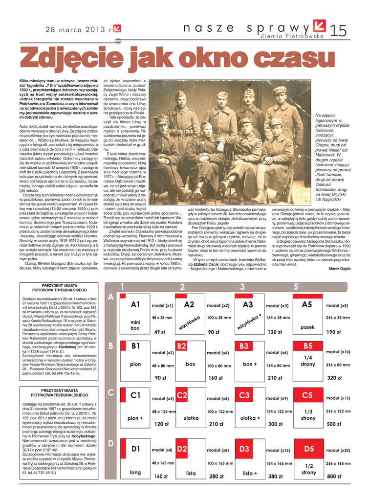 28 marca 2013 r nasze sprawy Ziemia Piotrkowska 15 Zdjęcie jak okno czasu Kilka miesięcy temu w rubryce „twarze miasta”tygodnika „7 Dni”opublikowano zdjęcie z 1920 r., przedstawiające żołnierzy wyruszających na front wojny polsko-bolszewickiej. Jednak fotografia nie została wykonana w Piotrkowie, a w Zamościu, o czym informował na jej odwrocie jeden z uwiecznionych żołnierzy, jednocześnie zapewniając rodzinę o swoim dobrym zdrowiu. Autor tekstu dodał również, że wkrótce prawdopodobnie wyruszą w stronę Litwy. Ze zdjęcia zrobiono pocztówkę (co było wówczas popularne) i wysłano do… Wolborza. Możliwe, że wszyscy mężczyźni z fotografii, pochodzili z tej miejscowości, a z całą pewnością dwóch z nich – Tedeusz Staniaszko (który wysłał pocztówkę) i Józef Iwanicki (dziadek autora artykułu). Ochotnicy zaciągnęli się do wojska w piotrkowskiej komendzie uzupełnień (Józef Iwanicki 13 sierpnia 1920 r., następnie trafił do 2 pułku piechoty Legionów). Z pewnością kolegów przydzielono do różnych zgrupowań, skoro późniejsze spotkanie w Zamościu, na pamiątkę którego zrobili sobie zdjęcie, sprawiło im tyle radości. Dalsze losy tych żołnierzy można odtworzyć tylko poszlakowo, ponieważ żaden z nich (o ile wiadomo) nie spisał swoich wspomnień.W czasie bitwy warszawskiej (13-25 sierpnia 1920 r.) pułk przeszedł do Dęblina, a następnie w rejon Hrubieszowa, gdzie odznaczył się 2 września w walce z konnicą Budionnego pod Trzeszczanami. Natomiast w ostatnich dniach października 1920 r. przerzucony został na linię demarkacyjną polsko-litewską, obsadzając odcinek wzdłuż Niemna. Niestety, w czasie wojny 1919-1921 2 pp Leg. poniósł dotkliwe straty. Zginęło ok. 400 żołnierzy, a 2 tys. zostało rannych. Nie wiadomo, czy wszyscy z fotografii przeżyli, a nawet czy służyli w tym samym pułku… Dzisiaj, 86-letni Grzegorz Staniaszko, syn Tadeusza, który udostępnił nam zdjęcie, opowiada, PREZYDENT MIASTA PIOTRKOWA TRYBUNALSKIEGO Działając na podstawie art. 35 ust. 1 ustawy z dnia 21 sierpnia 1997 r.o gospodarce nieruchomościami( tekst jednolity Dz.U. z 2010 r. Nr 102, poz. 651 ze zmianami ) informuje, że na tablicach ogłoszeń Urzędu Miasta Piotrkowa Trybunalskiego przy Pasażu Karola Rudowskiego 10 oraz przy ul. Szkolnej 28 wywieszony został wykaz nieruchomości niezabudowanej stanowiącej własność Skarbu Państwa w użytkowaniu wieczystym Gminy Piotrków Trybunalski przeznaczonej do sprzedaży, w drodze publicznego ustnego przetargu ograniczonego, położonej przy ul. Parafialnej (obr. 32 działka nr 133/6 o pow. 197 m 2 ). Szczegółowe informacje dot. nieruchomości umieszczonej w wykazie uzyskać można w Urzędzie Miasta Piotrkowa Trybunalskiego ul. Szkolna 28 – Referacie Gospodarki Nieruchomościami (III piętro, pokój nr 58), tel.(44) 732-18-52. PREZYDENT MIASTA PIOTRKOWA TRYBUNALSKIEGO działając na podstawie art. 35 ust. 1 ustawy z dnia 21 sierpnia 1997 r.o gospodarce nieruchomościami (tekst jednolity Dz. U. z 2010 r., Nr 102, poz. 651 z późn. zm.) informuje, że został wywieszony wykaz niezabudowanej nieruchomości przeznaczonej do sprzedaży w drodze przetargu ustnego nieograniczonego, położonej w Piotrkowie Tryb. przy ul. Kobyłeckiego. Nieruchomość oznaczona jest w ewidencji gruntów w obrębie nr 28, numerem działki 32/12 o pow. 2197 m2. Szczegółowe informacje dotyczące ww. wykazu można uzyskać w Urzędzie Miasta Piotrkowa Trybunalskiego przy ul. Szkolnej 28, w Referacie Gospodarki Nieruchomościami (pokój nr 61, tel.44 732-18-51) że ojciec wspominał o swoim udziale w „buncie” Żeligowskiego, kiedy Polacy zajęli Wilno i obszary ościenne, dając podstawy do utworzenia tzw. Litwy Środkowej, którą następnie przyłączono do Polski. - Tata opowiadał, że cieszyli się biorąc Litwę w październiku, ponieważ myśleli o sprawieniu Piłsudskiemu prezentu na jego 53 urodziny, które Marszałek obchodził w grudniu. Z kolei córka Józefa Iwanickiego, Halina, wspomina jedną z opowieści, którą frontowy towarzysz ojca snuł nad jego trumną w 1977 r.– Nieżyjący już Bronisław Dąbrowski (możliwe, że też jest na tym zdjęciu, ale nie potrafię go rozpoznać) mówił wtedy z nostalgią, że w czasie wojny dostali się z tatą do niewoli i razem, pod strażą, kopali sobie grób, gdy wystarczyło jedno spojrzenie… Rzucili się na strażników i zabili ich łopatami. Woleli zginąć w walce, ale dzięki niej ocaleli.Podobne traumatyczne przeżycia łączą ludzi na zawsze. Z kolei Iwanicki i Staniaszko prawdopodobnie poznali się wcześniej. Pierwszy z nich mieszkał w Wolborzu przynajmniej od 1912 r., kiedy ożenił się z Katarzyną Niewiadomską. Był cieślą i pracował w regionie środkowej Polski m.in. przy budowie kościołów. Drugi, był cenionym złotnikiem. Możliwe, że początkowo zbliżyła ich praca nad tą samą inwestycją. Po powrocie z wojny, w końcu 1920 r., panowie z pewnością przez długie lata utrzymy- Na zdjęciu legionowym w pierwszym rzędzie (żołnierze siedzący): pierwszy od lewej Glejzer, drugi od prawej Najder lub Malinowsk. W drugim rzędzie (żołnierze stojący): pierwszy od prawej Józef Iwanicki, drugi od prawej Tadeusz Staniaszko, drugi od lewej Dryński lub Nagrodzki wali kontakty, bo Grzegorz Staniaszko pamięta, gdy w późnych latach 30. Iwanicki odwiedzał jego ojca w rodzinnym sklepie zlokalizowanym przy dzisiejszym Placu Jagiełły. Pan Grzegorz pytany, czy potrafi rozpoznać pozostałych żołnierzy, wskazuje najpierw na drugiego od lewej w górnym rzędzie, mówiąc, że to Dryński, choć nie przypomina sobie imienia.Natomiast drugi od prawej w dolnym rzędzie, to pewnie Najder, choć tu też nie ma pewności nawet co do nazwiska. W tych samych postaciach, burmistrz Wolborza Elżbieta Ościk, dostrzega rysy, odpowiednio – Nagrodzkiego i Malinowskiego, natomiast w pierwszym od lewej w pierwszym rzęd