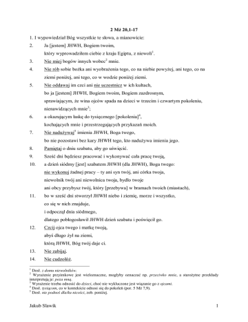 2 Mż 20,1-17 1. I wypowiedział Bóg wszystkie te słowa, a mianowicie: 2. Ja [jestem] JHWH, Bogiem twoim, który wyprowadziłem ciebie z kraju Egiptu, z niewoli1. 3. Nie miej bogów innych wobec2 mnie. 4. Nie rób sobie bożka ani wyobrażenia tego, co na niebie powyżej, ani tego, co na ziemi poniżej, ani tego, co w wodzie poniżej ziemi. 5. Nie oddawaj im czci ani nie uczestnicz w ich kultach, bo ja [jestem] JHWH, Bogiem twoim, Bogiem zazdrosnym, sprawiającym, że wina ojców spada na dzieci w trzecim i czwartym pokoleniu, nienawidzących mnie3; 6. a okazującym łaskę do tysięcznego [pokolenia]4, kochających mnie i przestrzegających przykazań moich. 7. Nie nadużywaj5 imienia JHWH, Boga twego, bo nie pozostawi bez kary JHWH tego, kto nadużywa imienia jego. 8. Pamiętaj o dniu szabatu, aby go uświęcić. 9. Sześć dni będziesz pracować i wykonywać cała pracę twoją, 10. a dzień siódmy [jest] szabatem JHWH (dla JHWH), Boga twego: nie wykonuj żadnej pracy – ty ani syn twój, ani córka twoja, niewolnik twój ani niewolnica twoja, bydło twoje ani obcy przybysz twój, który [przebywa] w bramach twoich (miastach), 11. bo w sześć dni stworzył JHWH niebo i ziemię, morze i wszystko, co się w nich znajduje, i odpoczął dnia siódmego, dlatego pobłogosławił JHWH dzień szabatu i poświęcił go. 12. Czcij ojca twego i matkę twoją, abyś długo żył na ziemi, którą JHWH, Bóg twój daje ci. 13. Nie zabijaj. 14. Nie cudzołóż. 1 Dosł. z domu niewolników. Wyrażenie przyimkowe jest wieloznaczne, mogłyby oznaczać np. przeciwko mnie, a starożytne przekłady interpretują je: poza mną. 3 Wyrażenie trzeba odnosić do dzieci, choć nie wykluczone jest wiązanie go z ojcami. 4 Dosł. tysiącom, co w kontekście odnosi się do pokoleń (por. 5 Mż 7,9). 5 Dosł. nie podnoś dla/ku nicości, zob. poniżej. 2 Jakub Slawik 1 15. Nie kradnij. 16. Nie świadcz przeciwko bliźniemu twemu fałszywie. 17. Nie pożądaj domu bliźniego twego, nie pożądaj żony bliźniego twego ani niewolnika, ani niewolnicy, ani byka, ani osła, ani niczego, co należy do bliźniego twego. Dekalog, po hebrajsku dziesięć słów, występuje w ST w dwóch nieco różniących się wersjach (5 Mż 6,6-21)6, a w 2 Mż poprzedza cały rozległy korpus prawny, związany (wtórnie) z objawieniem Boga na Synaju. Został ustawiony na samym początku, pokazując, że właśnie w jego świetle należy odczytywać dalsze prawa. Sam zaś nie jest w rzeczywistości zbiorem przepisów prawnych, gdyż nie zawiera sankcji karnych za ich przekroczenie, nie może więc służyć żadnemu orzecznictwu – jest zbiorem podstawowych zasad o charakterze religijnym i etycznym, społecznym. Jest ponadto heterogenicznym zbiorem zakazów i nakazów o bardzo różnej budowie. Dekalog Rozpoczyna się nie od zakazów, lecz od czegoś w rodzaju preambuły (w.2), stwierdzenia, które ma konstytutywne znaczenie dla rozumienia nie tylko Dekalogu, ale praw starotestamentowych w ogóle, i mówi o tym, co łączy Boga z ludem. Bóg ustanowił relację z Izraelem (zawsze przedstawiany jako Bóg twój) poprzez czyn zbawczy – wyprowadzenie z Egiptu7. Można powiedzieć, że był to akt założycielski, konstytuujący Izraela nie tylko w aspekcie religijnym, ale i politycznym. Bez niego nie byłoby mowy o Izraelu jako ludzie Bożym. Wszystkie dalej przedstawione reguły, przykazania nie konstytuują, nie tworzą związku Boga z Izraelem, gdyż opiera się on na zbawczym dziele Boga. Przykazania służą utrzymaniu relacji ludu z Bogiem. Tradycyjny podział na religijne i etyczne przykazania byłby trudny do utrzymania, co szczególnie dobrze widać po najbardziej rozbudowanym nakazie przestrzegania szabatu, który przede wszystkim reguluje kwestie społeczne, mimo że ma uzasadnienie religijne. Pierwsze 3 zakazy (w.3-6) mają wymiar stricte religijny i domagają się od Izraela posiadania i czczenia tylko jednego Boga, noszącego imię JHWH. Zakazano posiadania (w.3), wytwarzania (w.4) oraz oddawania chwały (kultowo) jakiemukolwiek innemu bóstwu (w.5). Relacja z Bogiem JHWH, ukonstytuowana wraz z wyprowadzeniem z Egiptu, może być zachowana jedynie przy założeniu przestrzegania tego/tych przykazań. To żądanie przenika 6 Notabene wyliczenie 10 słów, a ściślej 10 przykazań (bez preambuły) wymaga połączenia ze sobą niektórych zakazów/nakazów, gdyż zakazów/nakazów jest tutaj więcej (zob. podkreślenia). Dekalog nigdzie nie jest związany z kamiennymi tablicami świadectwa (por. 2 Mż 31; 33 itp.). 7 Tylko w.2-6 utrzymane są jako mowa JHWH. Jakub Slawik 2 cały ST i całą historię biblijnego Izraela. Jego złamanie oznacza odrzucenie Boga (znienawidzenie), zaś przestrzeganie uznawanie Go (miłowanie) i de facto przestrzeganie przykazań, które mają znaczenie dla Izraela jako ludu Bożego tylko pod warunkiem zachowania tego/tych pierwszego/pierwszych przykazań (w.5-6). Zwraca tutaj uwagę dysproporcja pomiędzy Bożym gniewem, obejmującym cztery pokolenia, tj. całą, razem żyjącą, wielopokoleniową rodzinę, a Bożą przychylnością, która jest właściwie nieograniczona (tysięczne pokolenie jest czymś niewyobrażalnie odległym, nawet w dzisiejszych czasach), jeśli tylko JHWH będzie uznawany za jedynego Boga. Sporo emocji budzi „drugi” zakaz z w.4, który w kręgach konserwatywnych odczytywany jest w oderwaniu od kontekstu wprost jako zakaz tworzenia wszelkiego rodzaju odwzorowań tego, co spotykamy w naturze (stąd w części synagog spotyka się jedynie wzory geometryczne). W bezpośrednim kontekście jest raczej zakazem tworzenia bóstw z gwiazd i ciał niebieskich czy też na wzór ludzi, zwierząt czy wszelkich innych istot spotykanych w całym kosmosie (niebo-ziemia-wody podziemne). Kolejne przykazanie (w.7) należy przypuszczalnie łączyć z poprzedzającymi, gdyż podnoszenie imienia JHWH dla/ku nicości może oznaczać posługiwanie się w imieniem jedynego Boga w ramach