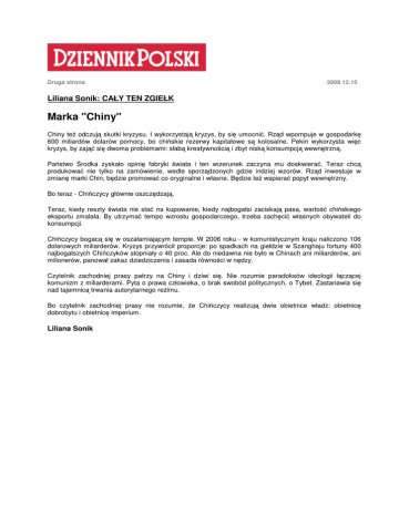 Druga strona 2008.12.15 Liliana Sonik: CAŁY TEN ZGIEŁK Marka "Chiny" Chiny też odczują skutki kryzysu. I wykorzystają kryzys, by się umocnić. Rząd wpompuje w gospodarkę 600 miliardów dolarów pomocy, bo chińskie rezerwy kapitałowe są kolosalne. Pekin wykorzysta więc kryzys, by zająć się dwoma problemami: słabą kreatywnością i zbyt niską konsumpcją wewnętrzną. Państwo Środka zyskało opinię fabryki świata i ten wizerunek zaczyna mu doskwierać. Teraz chcą produkować nie tylko na zamówienie, wedle sporządzonych gdzie indziej wzorów. Rząd inwestuje w zmianę marki Chin; będzie promować co oryginalne i własne. Będzie też wspierać popyt wewnętrzny. Bo teraz - Chińczycy głównie oszczędzają. Teraz, kiedy reszty świata nie stać na kupowanie, kiedy najbogatsi zaciskają pasa, wartość chińskiego eksportu zmalała. By utrzymać tempo wzrostu gospodarczego, trzeba zachęcić własnych obywateli do konsumpcji. Chińczycy bogacą się w oszałamiającym tempie. W 2006 roku - w komunistycznym kraju naliczono 106 dolarowych miliarderów. Kryzys przywrócił proporcje: po spadkach na giełdzie w Szanghaju fortuny 400 najbogatszych Chińczyków stopniały o 40 proc. Ale do niedawna nie było w Chinach ani miliarderów, ani milionerów, panował zakaz dziedziczenia i zasada równości w nędzy. Czytelnik zachodniej prasy patrzy na Chiny i dziwi się. Nie rozumie paradoksów ideologii łączącej komunizm z miliarderami. Pyta o prawa człowieka, o brak swobód politycznych, o Tybet. Zastanawia się nad tajemnicą trwania autorytarnego reżimu. Bo czytelnik zachodniej prasy nie rozumie, że Chińczycy realizują dwie obietnice władz: obietnicę dobrobytu i obietnicę imperium. Liliana Sonik