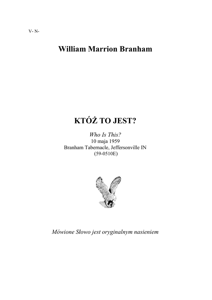 V- N- William Marrion Branham KTÓŻ TO JEST? Who Is This? 10 maja 1959 Branham Tabernacle, Jeffersonville IN (59-0510E) Mówione Słowo jest oryginalnym nasieniem Zdjęcie Williama Branhama ze Słupem Ognia (wykonane przez Jamesa Ayersa w Sam Houston Collisseum w Houston w stanie Teksas w dniu 25 stycznia 1950 r.) Któż to jest? Who Is This? niedziela wieczór, 10 maja 1959 Branham Tabernacle, Jeffersonville IN Nagranie na taśmie magnetofonowej o numerze 59-0510E trwa 72 minuty. Numeracja akapitów według VGR 59-0510E Software Version KTÓŻ TO JEST? Niech cię Bóg błogosławi, bracie. Cieszę się bardzo, że w końcu mogę być w domu Pańskim. Właśnie zastanawiałem się nad pewnym miejscem pisma, jakiś czas temu. I tam było powiedziane, że kiedy Jezus zbliżał się do Jerozolimy, że uczniowie podnieśli oczy i zobaczyli święte miasto z daleka. Zaczęli się wtedy radować i mówić, że… „Teraz królestwo to zostanie przywrócone”. A pewien człowiek, który właśnie opowiadał o swojej niedawnej wizycie w Palestynie… Powiedział, że ludzie teraz, w tych ostatnich latach, kiedy przychodzą do tego miejsca, do tej doliny, i patrzą się na miasto, stojąc na zakręcie tej samej drogi, po której szedł Jezus z uczniami w owym czasie, kiedy zobaczą to miasto, zaczynają płakać. Wiecie, ja wierzę, że ci uczniowie w owych dniach odczuwali to że to królestwo zostanie przywrócone. A teraz prawie nadszedł ten czas. Wierzę, że takie uczucie panuje wśród ludzi, że stoimy o krok do przywrócenia tego królestwa. 2 Brat Neville, nasz łaskawy i błogosławiony pastor, właśnie ze mną rozmawiał o nadchodzącym przedsięwzięciu przebudzeniowym, tutaj, w tej świątyni, które ma mieć miejsce w ciągu paru wieczorów, abyśmy się o to modlili. Powiedziałem mu, że moim zdaniem będzie to coś błogosławionego. Nie jest możliwe mieć wiele przebudzeń. Często mamy złe pojęcie o przebudzeniu. Przebudzenie nie polega tak bardzo na przyprowadzaniu nowych członków, ale na tym, by pobudzić, ożywić tych, których już mamy. I jestem… Chcę to powiedzieć, ponieważ mówię to z głębi swego serca. Zaczynam odczuwać inną atmosferę w naszej kaplicy, inną od tej, która była od długiego czasu, atmosferę głębokiego duchowego nastawienia, jaka kiedyś bywała. Jest to coś, co ugruntowuje, i ma prawdziwy fundament. I ufam, że Bóg pobłogosławi ten mały zbór. I… [Czyste miejsce na taśmie – wyd.] znów w Jego mocy. I widzę, że trwają prace nad programem budowy, i myślę, że to coś wspania1 6 WILLIAM BRANHAM łego. Bo prędzej czy później, my, starsi, zdejmiemy zbroję i oddamy ją w ręce naszych dzieci, i pójdziemy po tych złotych stopniach. Niedawno minąłem właśnie znak oznaczający połowę drogi - pięćdziesiąt lat. Nie mogę w to uwierzyć. Wydaje mi się, że to było wczoraj, kiedy woziłem artykuły spożywcze dla Chrisa Misnera. Miałem wtedy osiemnaście – szesnaście, osiemnaście lat. To wszystko jakoś tak uciekło. To po prostu wskazuje, że nie mamy tutaj miasta trwałego, ale wyglądamy tego, które ma przyjść. A tego miasta Budowniczym jest Bóg, i temu miastu nigdy nie będzie końca. 3 Dziś rano kiedy mówiłem na temat Dnia Matki, chcąc umieścić matkę - nie taką, jaką ją dzisiaj widzimy, starą, ze zmarszczkami, zdaną na nas, o kulach albo w starym wózku inwalidzkim, albo w fotelu z dzbankiem kwiatów stojącym koło niej, ale matkę w zmartwychwstaniu, przywróconą z powrotem do swojej młodości, stojącą, jaśniejącą jak królowa. W ten sposób pragnę myśleć o swojej matce. Nie lubię myśleć o niej, jaka jest dzisiaj - starej. Chcę myśleć o tym, co przyjdzie. I wiem, że wy myślicie w ten sposób o swoich matkach. Myślicie o niej tak, jaka ona naprawdę jest w waszym sercu. Chociaż wiele… Jak powiedział poeta: „Choć życie nie było dla niej czymś łatwym, ale byłaby gotowa przeżyć to wszystko jeszcze raz, gdyby tylko mogła coś dla was zrobić”. Tak więc Bóg niech sprawi, oby mogła żyć z wami wiecznie. Tak bardzo się z tego cieszę. 4 Nie wiem, dlaczego dziś rano to ogłosiłem, że dziś wieczorem, jeśli Pan pozwoli, będę głosił na temat: „Któż to jest?” Z całą pewnością nie wiem, jak to mam zrobić. Ale byłem bardzo zajęty, skończyło się to coś 70 minut temu, miałem osobiste rozmowy przez całe popołudnie, miałem też wyjątkowe i - i nagłe wezwania. Nie mogłem ich wykonać. I pragnę, abyście dalej modlili się za doktora Sama. Ma się dobrze i jesteśmy za to wdzięczni. A doktor Baldin, i pani Baldin, oboje wracają do zdrowia, czują się dobrze. I chcę także, abyście dziś po południu umieścili kolejną osobę na waszej liście modlitwy. Tą osobą jest aptekarz Harry Leese. To mój osobisty przyjaciel. Znam go tak długo i cały czas myślałem, że jest chrześcijaninem, aż do dzisiejszego popołudnia, kiedy jego brat po- KTÓŻ TO JEST? 7 prosił o modlitwę za zbawienie jego duszy. Wieści te przyniósł nasz członek zarządu, brat Mike Egan. Harry jest w poważnym stanie. Leży w szpitalu. Nie wiedziałem, że ma takie wysokie o mnie mniemanie, on dzisiaj po południu nie chciał się widzieć ze swoim pastorem, pastorem kościoła, do którego uczęszcza, i chciał, żebym go odwiedził. I chcę widzieć się z nim. Więc, módlcie się o Harrego. 5 Cieszymy się dzisiaj wieczorem, rozpoznając moich przyjaciół z południa, z Georgii, brata Welch Evansa i jego rodzinę. Widzę także innych gości, których nie znam, prawdopodobnie byli tutaj dziś rano. Tam z tyłu, jeśli się nie mylę, widzę brata, siostrę, Elmera Collinsa z Phoenix, Arizona. Ach, ty się w ogóle nie zmieniłeś! Powinieneś mieć na sobie swój kolejarski mundur i - przyjść wprost z trasy. Witajcie w domu, i nie mogę prosić was, abyście pozostali, bo znaleźliście lepsze miejsce. Tak? To jest bardzo dobre, w Phoenix. S