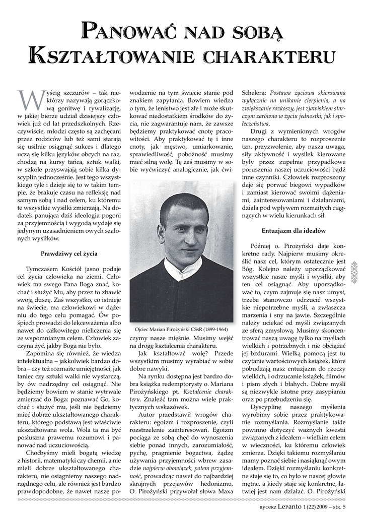 W yścig szczurów – tak niektórzy nazywają gorączkową gonitwę i rywalizację, w jakiej bierze udział dzisiejszy człowiek już od lat przedszkolnych. Rzeczywiście, młodzi często są zachęcani przez rodziców lub też sami starają się usilnie osiągnąć sukces i dlatego uczą się kilku języków obcych na raz, chodzą na kursy tańca, sztuk walki, w szkole przyswajają sobie kilka dyscyplin jednocześnie. Jest tego wszystkiego tyle i dzieje się to w takim tempie, że brakuje czasu na refleksję nad samym sobą i nad celem, ku któremu te wszystkie wysiłki zmierzają. Na dodatek panująca dziś ideologia pogoni za przyjemnością i wygodą wydaje się jedynym uzasadnieniem owych szalonych wysiłków. wodzenie na tym świecie stanie pod znakiem zapytania. Bowiem wiedza o tym, że lenistwo jest złe i może skutkować niedostatkiem środków do życia, nie zagwarantuje nam, że zawsze będziemy praktykować cnotę pracowitości. Aby praktykować tę i inne cnoty, jak męstwo, umiarkowanie, sprawiedliwość, pobożność musimy mieć silną wolę. Tę zaś musimy w sobie wyćwiczyć analogicznie, jak ćwi- Entuzjazm dla ideałów Prawdziwy cel życia Tymczasem Kościół jasno podaje cel życia człowieka na ziemi. Człowiek ma swego Pana Boga znać, kochać i służyć Mu, aby przez to zbawić swoją duszę. Zaś wszystko, co istnieje na świecie, ma człowiekowi w dążeniu do tego celu pomagać. Ów pośpiech prowadzi do lekceważenia albo nawet do całkowitego nieliczenia się ze wspomnianym celem. Człowiek zaczyna żyć, jakby Boga nie było. Zapomina się również, że wiedza intelektualna – jakkolwiek bardzo dobra – czy też rozmaite umiejętności, jak taniec czy sztuki walki nie wystarczą, by ów nadrzędny cel osiągnąć. Nie będziemy bowiem w stanie wytrwale zmierzać do Boga: poznawać Go, kochać i służyć mu, jeśli nie będziemy mieć dobrze ukształtowanego charakteru, którego podstawą jest właściwie ukształtowana wola. Wola ta ma być posłuszna prawemu rozumowi i panować nad uczuciowością. Choćbyśmy mieli bogatą wiedzę z historii, matematyki czy chemii, a nie mieli dobrze ukształtowanego charakteru, nie osiągniemy naszego nadrzędnego celu, ale również jest bardzo prawdopodobne, że nawet nasze po- Schelera: Postawa życiowa skierowana wyłącznie na unikanie cierpienia, a na zwiększanie rozkoszy, jest zjawiskiem starczym zarówno w życiu jednostki, jak i społeczeństwa. Drugi z wymienionych wrogów naszego charakteru to rozproszenie tzn. przyzwolenie, aby nasza uwaga, siły aktywność i wysiłek kierowane były przez zupełnie przypadkowe poruszenia naszej uczuciowości bądź inne czynniki. Człowiek rozproszony daje się porwać biegowi wypadków i zamiast kierować swoimi dążeniami, zainteresowaniami i działaniami, działa pod wpływem rozmaitych ciągnących w wielu kierunkach sił. Ojciec Marian Pirożyński CSsR (1899-1964) czymy nasze mięśnie. Musimy wejść na drogę kształcenia charakteru. Jak kształtować wolę? Przede wszystkim musimy wyrabiać w sobie dobre nawyki. Na rynku dostępna jest bardzo dobra książka redemptorysty o. Mariana Pirożyńskiego pt. Kształcenie charakteru. Znaleźć tam można wiele praktycznych wskazówek. Autor przedstawił wrogów charakteru: egoizm i rozproszenie, czyli rozstrzelenie zainteresowań. Egoizm pociąga ze sobą chęć do wynoszenia siebie ponad innych, zarozumiałość, pychę, pragnienie bogactwa, żądzę używania przyjemności wbrew zasadzie najpierw obowiązek, potem przyjemność, prowadząc nawet do najbardziej skrajnych przejawów hedonizmu. O. Pirożyński przywołał słowa Maxa Później o. Pirożyński daje konkretne rady. Najpierw musimy określić nasz cel, którym ostatecznie jest Bóg. Kolejno należy uporządkować wszystkie nasze myśli i wysiłki, aby ten cel osiągnąć. Aby uporządkować to, czym zajmuje się nasz umysł, trzeba stanowczo odrzucić wszystkie niepotrzebne myśli, a zwłaszcza marzenia i sny na jawie. Szczególnie należy uciekać od myśli związanych ze sferą zmysłową. Musimy skoncentrować naszą uwagę tylko na myślach wielkich i potrzebnych i nie obciążać jej bzdurami. Wielką pomocą jest tu czytanie wartościowych książek, które pobudzają nasz entuzjazm do rzeczy wielkich, i odrzucanie książek, filmów i pism złych i błahych. Dobre myśli są niezwykle istotne przy zasypianiu oraz po przebudzeniu się. Dyscyplinę naszego myślenia wyrobimy sobie przez praktykowanie rozmyślania. Rozmyślanie takie powinno dotyczyć ważnych kwestii związanych z ideałem – wielkim celem w wieczności, ku któremu człowiek zmierza. Dzięki takiemu rozmyślaniu mamy poznać siebie i nasiąknąć owym ideałem. Dzięki rozmyślaniu konkretne staje się to, co było w naszej głowie mętne, a kiedy staje się konkretne, łatwiej jest nam działać. O. Pirożyński y e Leanto 1 (22) 2009 – st. 5
