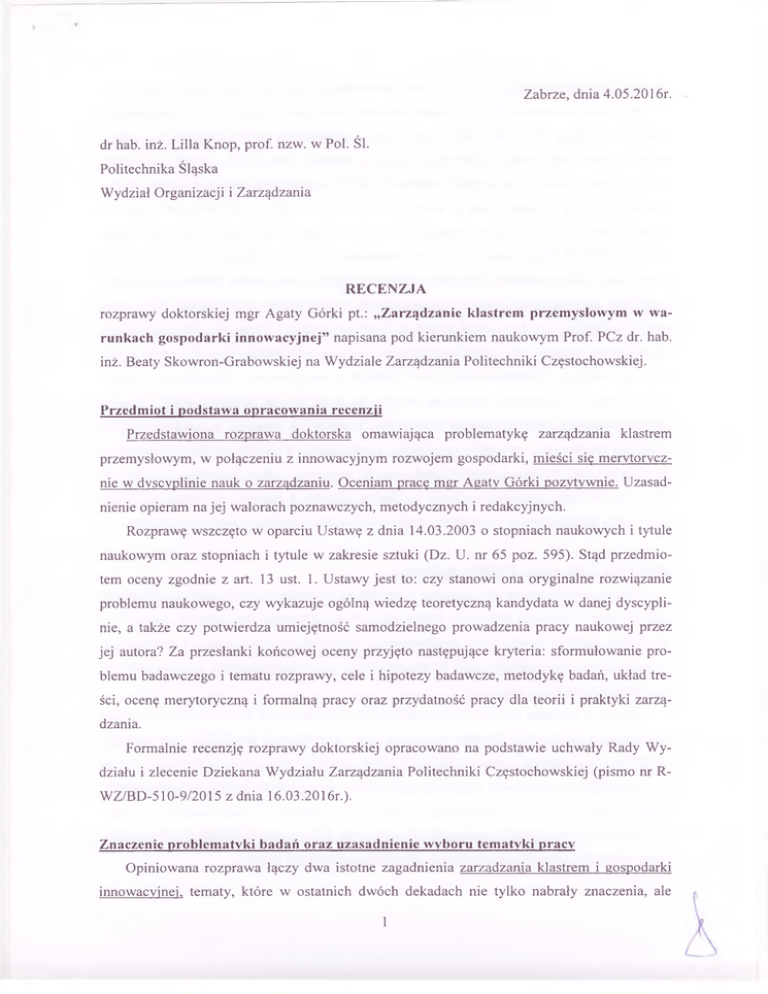 Zabrze, dnia 4.05.2016r. dr hab. inż. Lilia Knop, prof. nzw. w Pol. Śl. Politechnika Śląska Wydział Organizacji i Zarządzania RECENZJA rozprawy doktorskiej mgr Agaty Górki pt.: „Zarządzanie klastrem przemysłowym w wa runkach gospodarki innowacyjnej” napisana pod kierunkiem naukowym Prof. PCz dr. hab. inż. Beaty Skowron-Grabowskiej na Wydziale Zarządzania Politechniki Częstochowskiej. Przedmiot i podstawa opracowania recenzji Przedstawiona rozprawa doktorska omawiająca problematykę zarządzania klastrem przemysłowym, w połączeniu z innowacyjnym rozwojem gospodarki, mieści się merytorycz nie w dyscyplinie nauk o zarządzaniu. Oceniam pracę mgr Agaty Górki pozytywnie. Uzasad nienie opieram na jej walorach poznawczych, metodycznych i redakcyjnych. Rozprawę wszczęto w oparciu Ustawę z dnia 14.03.2003 o stopniach naukowych i tytule naukowym oraz stopniach i tytule w zakresie sztuki (Dz. U. nr 65 poz. 595). Stąd przedmio tem oceny zgodnie z art. 13 ust. 1. Ustawy jest to: czy stanowi ona oryginalne rozwiązanie problemu naukowego, czy wykazuje ogólną wiedzę teoretyczną kandydata w danej dyscypli nie, a także czy potwierdza umiejętność samodzielnego prowadzenia pracy naukowej przez jej autora? Za przesłanki końcowej oceny przyjęto następujące kryteria: sformułowanie pro blemu badawczego i tematu rozprawy, cele i hipotezy badawcze, metodykę badań, układ tre ści, ocenę merytoryczną i formalną pracy oraz przydatność pracy dla teorii i praktyki zarzą dzania. Formalnie recenzję rozprawy doktorskiej opracowano na podstawie uchwały Rady Wy działu i zlecenie Dziekana Wydziału Zarządzania Politechniki Częstochowskiej (pismo nr RWZ/BD-510-9/2015 z dnia 16.03.2016r.)Znaczenie problematyki badań oraz uzasadnienie wyboru tematyki pracy Opiniowana rozprawa łączy dwa istotne zagadnienia zarządzania klastrem i gospodarki innowacyjnej, tematy, które w ostatnich dwóch dekadach nie tylko nabrały znaczenia, ale 1 dynamicznie się rozwijają. Dokonany przez Doktorantkę wybór problemu naukowego, w mo jej ocenie spełnia oczekiwania i wymogi stawiane dysertacjom doktorskim. Nie ulega wątpli wości, że wybrana przez Panią mgr Agatę Górkę problematyka badawcza jest interesująca i ważna z naukowego oraz aplikacyjnego punktu widzenia. Szczególna „moda” na klastry, trwająca przez ostatnie dwie dekady, podkreśla zalety i możliwości, jakie daje klaster. Jednak korzyści płynące z klastrów nie są obecnie wyznaczane jedynie przez wyliczenia kosztów transakcyjnych, wskaźników koncentracji czy masy krytycznej. Nie wystarczy również wska zać ich udziału w rynku i poziomu wykorzystania zasobów endogenicznych. Oczekuje się od nich nowych innowacyjnych technologii, które zapewnią trwały wzrost przedsiębiorstwom i regionom, aplikacyjności badań i zaangażowania społeczeństwa w działania, które mają wpływ na jakość życia środowiska lokalnego i/lub regionalnego. Mając na uwadze powyższe spostrzeżenia uważam, że wybór problematyki, tematu i celu badawczego dysertacji należy uznać za właściwy. Połączenie zarządzania klastrem przemysłowym z zagadnieniem wdraża nia innowacji w gospodarce opartej na wiedzy, jak dotąd nie jest szeroko badany i brakuje takich opracowań, jakie prezentuje Doktoranta. Podjęcie tej tematyki w aspekcie rozwoju podejścia sieciowego i procesów zarządzania innowacjami, w sposób szczególny stanowi o poznawczej oraz utylitarnej wartości problematyki rozprawy. Mogę stwierdzić, że tytuł roz prawy oraz podjęta tematyka badawcza są bardzo aktualne i naukowo interesujące, dlatego ich wybór i przedstawienie w rozprawie doktorskiej uznaję za merytorycznie uzasadnione. Koncepcja i cele pracy. Problem badawczy Doktorantka w sposób jednoznaczny i zrozumiały określiła tytuł rozprawy zawierając w nim już ideę (podstawę) problemu badawczego. Praca obejmuje identyfikację obszaru ba dawczego, sformułowanie celów (nadrzędnego, teoretycznego, badawczego i utylitarnego) hipotez (głównej i szczegółowych). Proces badawczy został przedstawiony etapami, cząstko wo w każdym rozdziale pracy. Zgodnie z tematem rozprawy przedmiotem pracy (problemem badawczym) jest analiza problematyki zarządzania klastrem przemysłowym w warunkach gospodarki innowacyjnej. Autorka uszczegółowiła zakres problemu do oceny wpływu innowacyjnej gospodarki na za kres uprawnień i kompetencji koordynatorów klastra, którzy pełnią funkcje administracyjne, odpowiadając jednocześnie zarówno za majątek i finanse klastrów, a także przepływ informa cji pomiędzy uczestnikami poszczególnych powiązań. Kluczowym walorem pracy jest zało żenie budowania zarządzania klastrem w oparciu o zarządzanie wiedzą. 2 Za główny cel opiniowanej dysertacji Doktorantka przyjęła analizę szans i zagrożeń, wy nikających z wdrażania innowacji w klastrach przemysłowych. Cel główny Doktorantka sta rała się zrealizować w każdym rozdziale zgłębiając problematykę zarządzania klastrem (ro zumianego przede wszystkim przez pryzmat modelu zamkniętego i koordynatora klastra), rozwój innowacyjnej gospodarki i procesy wdrażania innowacji w klastrach. W dysertacji wyróżniono również cele szczegółowe (teoretyczny, badawczy i utylitarny). Jako cel teore tyczny pracy przyjęto analizę możliwości oferowanych przez klastry jako media transferu innowacyjnych technologii. Cel ten Pani mgr Agata Górka starała się osiągnąć w rozdziale czwartym, opisującym czynniki, które wpływają na transfer wiedzy w klastrach. Celem ba dawczym, może lepiej poznawczym, pracy było przedstawienie stanu aktualnego polskich klastrów gospodarczych w sferze prawnej i organizacyjnej. Cel ten został osiągnięty nie tylko jak sugeruje Doktorantka poprzez analizę bieżących problemów, napotykanych w działalności koordynatorów klastrów w rozdziale trzecim, ale również poprzez badania przeprowadzone w roz