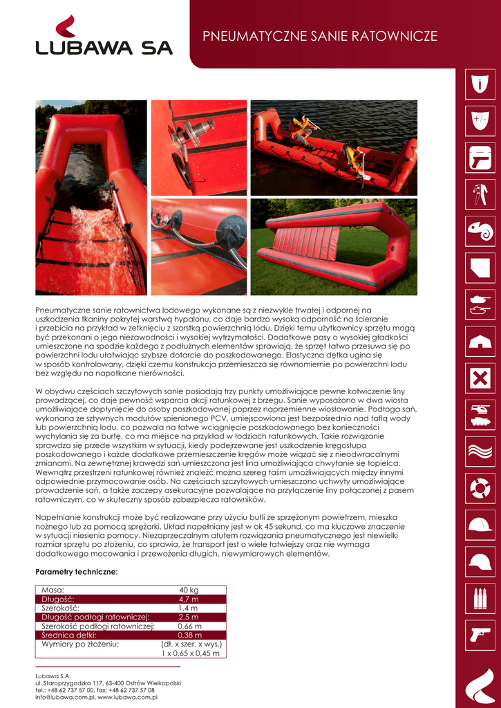 PNEUMATYCZNE SANIE RATOWNICZE Pneumatyczne sanie ratownictwa lodowego wykonane są z niezwykle trwałej i odpornej na uszkodzenia tkaniny pokrytej warstwą hypalonu, co daje bardzo wysoką odporność na ścieranie i przebicia na przykład w zetknięciu z szorstką powierzchnią lodu. Dzięki temu użytkownicy sprzętu mogą być przekonani o jego niezawodności i wysokiej wytrzymałości. Dodatkowe pasy o wysokiej gładkości umieszczone na spodzie każdego z podłużnych elementów sprawiają, że sprzęt łatwo przesuwa się po powierzchni lodu ułatwiając szybsze dotarcie do poszkodowanego. Elastyczna dętka ugina się w sposób kontrolowany, dzięki czemu konstrukcja przemieszcza się równomiernie po powierzchni lodu bez względu na napotkane nierówności. W obydwu częściach szczytowych sanie posiadają trzy punkty umożliwiające pewne kotwiczenie liny prowadzącej, co daje pewność wsparcia akcji ratunkowej z brzegu. Sanie wyposażono w dwa wiosła umożliwiające dopłynięcie do osoby poszkodowanej poprzez naprzemienne wiosłowanie. Podłoga sań, wykonana ze sztywnych modułów spienionego PCV, umiejscowiona jest bezpośrednio nad taflą wody lub powierzchnią lodu, co pozwala na łatwe wciągnięcie poszkodowanego bez konieczności wychylania się za burtę, co ma miejsce na przykład w łodziach ratunkowych. Takie rozwiązanie sprawdza się przede wszystkim w sytuacji, kiedy podejrzewane jest uszkodzenie kręgosłupa poszkodowanego i każde dodatkowe przemieszczenie kręgów może wiązać się z nieodwracalnymi zmianami. Na zewnętrznej krawędzi sań umieszczona jest lina umożliwiająca chwytanie się topielca. Wewnątrz przestrzeni ratunkowej również znaleźć można szereg taśm umożliwiających między innymi odpowiednie przymocowanie osób. Na częściach szczytowych umieszczono uchwyty umożliwiające prowadzenie sań, a także zaczepy asekuracyjne pozwalające na przyłączenie liny połączonej z pasem ratowniczym, co w skuteczny sposób zabezpiecza ratowników. Napełnianie konstrukcji może być realizowane przy użyciu butli ze sprzężonym powietrzem, mieszka nożnego lub za pomocą sprężarki. Układ napełniany jest w ok 45 sekund, co ma kluczowe znaczenie w sytuacji niesienia pomocy. Niezaprzeczalnym atutem rozwiązania pneumatycznego jest niewielki rozmiar sprzętu po złożeniu, co sprawia, że transport jest o wiele łatwiejszy oraz nie wymaga dodatkowego mocowania i przewożenia długich, niewymiarowych elementów. Parametry techniczne: Masa: 40 kg Długość: 4,7 m Szerokość: 1,4 m Długość podłogi ratowniczej: 2,5 m Szerokość podłogi ratowniczej: 0,66 m Średnica dętki: 0,38 m Wymiary po złożeniu: (dł. x szer. x wys.) 1 x 0,65 x 0,45 m