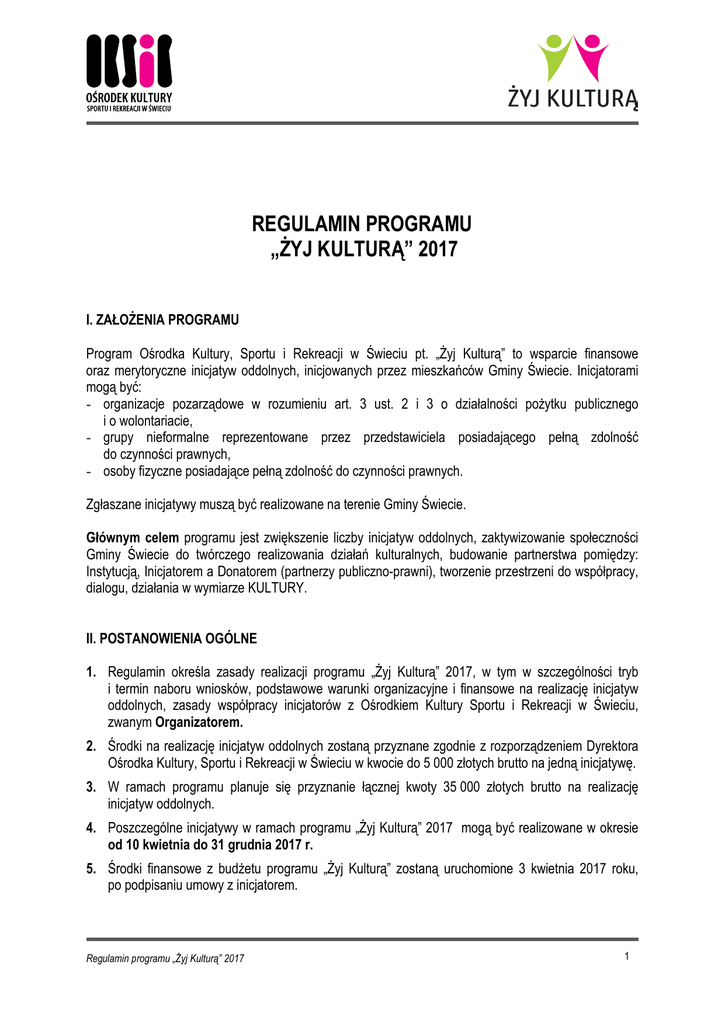 REGULAMIN PROGRAMU „ŻYJ KULTURĄ” 2017 I. ZAŁOŻENIA PROGRAMU Program Ośrodka Kultury, Sportu i Rekreacji w Świeciu pt. „Żyj Kulturą” to wsparcie finansowe oraz merytoryczne inicjatyw oddolnych, inicjowanych przez mieszkańców Gminy Świecie. Inicjatorami mogą być: - organizacje pozarządowe w rozumieniu art. 3 ust. 2 i 3 o działalności pożytku publicznego i o wolontariacie, - grupy nieformalne reprezentowane przez przedstawiciela posiadającego pełną zdolność do czynności prawnych, - osoby fizyczne posiadające pełną zdolność do czynności prawnych. Zgłaszane inicjatywy muszą być realizowane na terenie Gminy Świecie. Głównym celem programu jest zwiększenie liczby inicjatyw oddolnych, zaktywizowanie społeczności Gminy Świecie do twórczego realizowania działań kulturalnych, budowanie partnerstwa pomiędzy: Instytucją, Inicjatorem a Donatorem (partnerzy publiczno-prawni), tworzenie przestrzeni do współpracy, dialogu, działania w wymiarze KULTURY. II. POSTANOWIENIA OGÓLNE 1. Regulamin określa zasady realizacji programu „Żyj Kulturą” 2017, w tym w szczególności tryb i termin naboru wniosków, podstawowe warunki organizacyjne i finansowe na realizację inicjatyw oddolnych, zasady współpracy inicjatorów z Ośrodkiem Kultury Sportu i Rekreacji w Świeciu, zwanym Organizatorem. 2. Środki na realizację inicjatyw oddolnych zostaną przyznane zgodnie z rozporządzeniem Dyrektora Ośrodka Kultury, Sportu i Rekreacji w Świeciu w kwocie do 5 000 złotych brutto na jedną inicjatywę. 3. W ramach programu planuje się przyznanie łącznej kwoty 35 000 złotych brutto na realizację inicjatyw oddolnych. 4. Poszczególne inicjatywy w ramach programu „Żyj Kulturą” 2017 mogą być realizowane w okresie od 10 kwietnia do 31 grudnia 2017 r. 5. Środki finansowe z budżetu programu „Żyj Kulturą” zostaną uruchomione 3 kwietnia 2017 roku, po podpisaniu umowy z inicjatorem. Regulamin programu „Żyj Kulturą” 2017 1 III. RODZAJ KWALIFIKUJĄCYCH SIĘ DZIAŁAŃ Zgłaszane inicjatywy muszą wpisywać się w jeden z priorytetów określonych na ten rok. Priorytety programu „Żyj Kulturą” 2017: 1. Edukacja w zakresie sztuk wizualnych - od malarstwa, rzeźby, grafiki, fotografii poprzez street art, wideo-art, instalacje, design, performance, działania konceptualne, itp. 2. Edukacja kulturalna lub artystyczna adresowana do grup/osób o utrudnionym dostępie do kultury. UWAGA - Z PROGRAMU WYŁACZONE SĄ KONKURSY, FESTIWALE, KONCERTY, PRZEGLĄDY. IV. UPRAWNIENI WNIOSKODAWCY Do programu mogą przystąpić następujące podmioty mające swoja siedzibę na terenie Gminy Świecie: 1. Organizacje pozarządowe działające na podstawie ustawy o działalności pożytku publicznego i o wolontariacie, zarejestrowane w KRS. 2. Grupa nieformalna reprezentowana przez przedstawiciela posiadającego pełną zdolność do czynności prawnych. 3. Osoba fizyczna we własnym imieniu posiadająca pełną zdolność do czynności prawnych 1. V. TERMINY, SPOSÓB NABORU WNIOSKÓW, WARUNKI ORGANIZACYJNE I FINANSOWE 1. W ramach programu przewiduje się przeprowadzenie jednego naboru wniosków w terminie od 13 lutego do 13 marca 2017 roku. W razie niewykorzystania całości budżetu programu Organizator ma prawo ogłosić kolejny nabór wniosków, bądź zrezygnować z wykorzystania pozostałej części środków z budżetu programu, przeznaczając je na działalność statutową. 2. Podstawą ubiegania się o dofinansowanie inicjatywy jest złożenie wniosku - formularz wniosku do pobrania na stronie internetowej: www.zyjkultura.oksir.eu lub w Punkcie Informacji OKSiR w Świeciu. 3. Do programu przystąpić mogą wyłącznie wnioskodawcy uprawnieni zgodnie z pkt. IV Regulaminu programu „Żyj Kulturą” 2017. 4. Wnioskodawca może złożyć maksymalnie 1 wniosek. 5. Przed złożeniem wniosku należy zapoznać się z regulaminem programy „Żyj Kulturą” 2017, który dostępny jest na stronie internetowej www.zyjkultura.oksir.eu Zdolność do czynności prawnych: w prawie cywilnym zdolność do dokonywania we własnym imieniu czynności prawnych, czyli do przyjmowania i składania oświadczeń woli mających na celu powołanie powstania, zmiany lub ustania stosunku prawnego. Zdolność do kształtowania swojej sytuacji prawnej (nabywania praw i zaciągania zobowiązań). 1 Regulamin programu „Żyj Kulturą” 2017 2 6. Działanie może trwać minimalnie 2 tygodnie, maksymalnie 3 miesiące i musi być realizowane w okresie zawartym w terminie od 10 kwietnia 2017 r. do 31 grudnia 2017. 7. Realizacja działania może odbywać się wyłącznie na terenie Gminy Świecie. 8. Maksymalna kwota wsparcia inicjatywy z budżetu projektu to 5 000 zł brutto. 9. Kwota wsparcia inicjatywy z budżetu programu może wynosić max. 90% całkowitego kosztu projektu dla grup nieformalnych i osób fizycznych, natomiast dla organizacji pozarządowych składających we własnym imieniu max. 50% całkowitego kosztu projektu. 10. Nie jest wymagany wkład finansowy własny Wnioskodawcy w przypadku składania wniosku przez osoby fizyczne oraz grupę nieformalną 2. Wkład finansowy własny jest wymagany wyłącznie dla organizacji pozarządowych składających wniosek we własnym imieniu w wysokości 40% całkowitego budżetu projektu. 11. Wymagany jest udział sponsora, darczyńcy, partnera jako źródło finansowania w wysokości nie mniejszej niż 10% całkowitej wartości projektu, obowiązkowe dla wszystkich podmiotów. 12. Wniosek należy wypełnić (zgodnie ze wskazaniami zawartymi w formularzu), wydrukować, podpisać, dołączyć odpowiednie załączniki, w tym kopie na nośniku CD. Wniosek w wersji papierowej oraz elektronicznej (na nośniku CD) należy złożyć w zamkniętej kopercie z dopiskiem: Program „Żyj Kulturą” 2017: a. Osobiście lub przez posłańca (doręczyciel otrzyma dowód dostarczenia przesyłki opatrzony podpisem i datą) do Punktu Informacji OKSiR w