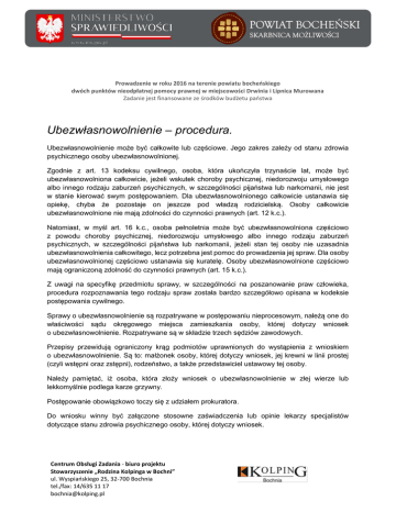 Prowadzenie w roku 2016 na terenie powiatu bocheńskiego dwóch punktów nieodpłatnej pomocy prawnej w miejscowości Drwinia i Lipnica Murowana Zadanie jest finansowane ze środków budżetu państwa Ubezwłasnowolnienie – procedura. Ubezwłasnowolnienie może być całkowite lub częściowe. Jego zakres zależy od stanu zdrowia psychicznego osoby ubezwłasnowolnionej. Zgodnie z art. 13 kodeksu cywilnego, osoba, która ukończyła trzynaście lat, może być ubezwłasnowolniona całkowicie, jeżeli wskutek choroby psychicznej, niedorozwoju umysłowego albo innego rodzaju zaburzeń psychicznych, w szczególności pijaństwa lub narkomanii, nie jest w stanie kierować swym postępowaniem. Dla ubezwłasnowolnionego całkowicie ustanawia się opiekę, chyba że pozostaje on jeszcze pod władzą rodzicielską. Osoby całkowicie ubezwłasnowolnione nie mają zdolności do czynności prawnych (art. 12 k.c.). Natomiast, w myśl art. 16 k.c., osoba pełnoletnia może być ubezwłasnowolniona częściowo z powodu choroby psychicznej, niedorozwoju umysłowego albo innego rodzaju zaburzeń psychicznych, w szczególności pijaństwa lub narkomanii, jeżeli stan tej osoby nie uzasadnia ubezwłasnowolnienia całkowitego, lecz potrzebna jest pomoc do prowadzenia jej spraw. Dla osoby ubezwłasnowolnionej częściowo ustanawia się kuratelę. Osoby ubezwłasnowolnione częściowo mają ograniczoną zdolność do czynności prawnych (art. 15 k.c.). Z uwagi na specyfikę przedmiotu sprawy, w szczególności na poszanowanie praw człowieka, procedura rozpoznawania tego rodzaju spraw została bardzo szczegółowo opisana w kodeksie postępowania cywilnego. Sprawy o ubezwłasnowolnienie są rozpatrywane w postępowaniu nieprocesowym, należą one do właściwości sądu okręgowego miejsca zamieszkania osoby, której dotyczy wniosek o ubezwłasnowolnienie. Rozpatrywane są w składzie trzech sędziów zawodowych. Przepisy przewidują ograniczony krąg podmiotów uprawnionych do wystąpienia z wnioskiem o ubezwłasnowolnienie. Są to: małżonek osoby, której dotyczy wniosek, jej krewni w linii prostej (czyli wstępni oraz zstępni), rodzeństwo, a także przedstawiciel ustawowy tej osoby. Należy pamiętać, iż osoba, która złoży wniosek o ubezwłasnowolnienie w złej wierze lub lekkomyślnie podlega karze grzywny. Postępowanie obowiązkowo toczy się z udziałem prokuratora. Do wniosku winny być załączone stosowne zaświadczenia lub opinie lekarzy specjalistów dotyczące stanu zdrowia psychicznego osoby, której dotyczy wniosek. Centrum Obsługi Zadania - biuro projektu Stowarzyszenie „Rodzina Kolpinga w Bochni” ul. Wyspiańskiego 25, 32-700 Bochnia tel./fax: 14/635 11 17 [email protected] Prowadzenie w roku 2016 na terenie powiatu bocheńskiego dwóch punktów nieodpłatnej pomocy prawnej w miejscowości Drwinia i Lipnica Murowana Zadanie jest finansowane ze środków budżetu państwa Niezwłocznie po wszczęciu postępowania sąd winien wysłuchać osobę, której dotyczy wniosek. Wysłuchanie to powinno się odbyć w obecności biegłego psychologa oraz biegłego psychiatry lub neurologa. W celu wysłuchania sąd może zarządzić przymusowe doprowadzenie osoby, której dotyczy wniosek. Jeżeli sąd uzna to za konieczne może ustanowić doradcę tymczasowego dla osoby, której dotyczy wniosek o ubezwłasnowolnienie (w celu ochrony jej osoby lub mienia). Osoba, dla której ustanowiono doradcę tymczasowego ma ograniczoną zdolność do czynności prawnych. Może jednak samodzielnie zaskarżać postanowienia w sprawie. W sprawach o ubezwłasnowolnienie osoba, której dotyczy wniosek musi być obowiązkowo zbadana przez biegłego psychiatrę lub neurologa, a także psychologa. Jeżeli na podstawie opinii dwóch biegłych sąd uzna to za niezbędne może zarządzić oddanie tej osoby pod obserwację w zakładzie leczniczym maksymalnie na okres do 6 tygodni. W wyjątkowych przypadkach sąd może wydłużyć ten termin do maksymalnie 3 miesięcy. W przedmiocie ubezwłasnowolnienia obowiązkowo musi się odbyć rozprawa. W postanowieniu o ubezwłasnowolnieniu sąd orzeka czy jest ono całkowite, czy częściowe oraz z jakiej przyczyny zostało ono orzeczone. Postanowienie to może zostać uchylone bądź zmienione w razie zmiany stanu psychicznego osoby, której dotyczy. Sąd uchyli ubezwłasnowolnienie gdy ustaną przyczyny jego orzeczenia. Uchylenie może nastąpić zarówno na wniosek, jak i z urzędu. W razie zmiany stanu psychicznego ubezwłasnowolnionego sąd może zmienić orzeczenie (w razie polepszenia stanu zmieni z całkowitego na częściowe, a w razie pogorszenia stanu z częściowego na całkowite). Co istotne – z wnioskiem o zmianę lub uchylenie orzeczenia może wystąpić także sam ubezwłasnowolniony. Do spraw o ubezwłasnowolnienie, uchylenie lub zmianę orzeczenia w przedmiocie ubezwłasnowolnienia sąd może ustanowić dla osoby, której to postępowanie dotyczy pełnomocnika z urzędu (adwokata lub radcę prawnego), nawet bez jej wniosku, jeśli z uwagi na stan zdrowia psychicznego nie jest ona w stanie złożyć wniosku, a udział pełnomocnika w sprawie sąd uzna za niezbędny. Centrum Obsługi Zadania - biuro projektu Stowarzyszenie „Rodzina Kolpinga w Bochni” ul. Wyspiańskiego 25, 32-700 Bochnia tel./fax: 14/635 11 17 [email protected] Prowadzenie w roku 2016 na terenie powiatu bocheńskiego dwóch punktów nieodpłatnej pomocy prawnej w miejscowości Drwinia i Lipnica Murowana Zadanie jest finansowane ze środków budżetu państwa Podstawa prawna: art. 12-16 kodeksu cywilnego, art. 544 – 560 (1) kodeksu postępowania cywilnego Stan prawny: 16.11.2016 r. Centrum Obsługi Zadania - biuro projektu Stowarzyszenie „Rodzina Kolpinga w Bochni” ul. Wyspiańskiego 25, 32-700 Bochnia tel./fax: 14/635 11 17 [email protected]