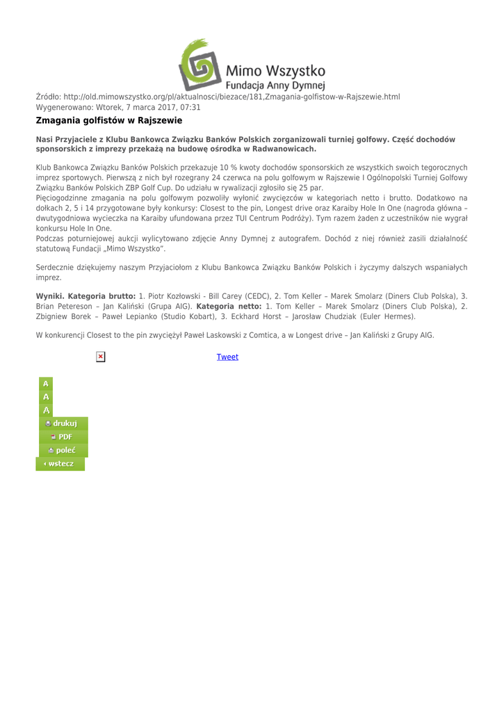 Źródło: http://old.mimowszystko.org/pl/aktualnosci/biezace/181,Zmagania-golfistow-w-Rajszewie.html Wygenerowano: Wtorek, 7 marca 2017, 07:31 Zmagania golfistów w Rajszewie Nasi Przyjaciele z Klubu Bankowca Związku Banków Polskich zorganizowali turniej golfowy. Część dochodów sponsorskich z imprezy przekażą na budowę ośrodka w Radwanowicach. Klub Bankowca Związku Banków Polskich przekazuje 10 % kwoty dochodów sponsorskich ze wszystkich swoich tegorocznych imprez sportowych. Pierwszą z nich był rozegrany 24 czerwca na polu golfowym w Rajszewie I Ogólnopolski Turniej Golfowy Związku Banków Polskich ZBP Golf Cup. Do udziału w rywalizacji zgłosiło się 25 par. Pięciogodzinne zmagania na polu golfowym pozwoliły wyłonić zwycięzców w kategoriach netto i brutto. Dodatkowo na dołkach 2, 5 i 14 przygotowane były konkursy: Closest to the pin, Longest drive oraz Karaiby Hole In One (nagroda główna – dwutygodniowa wycieczka na Karaiby ufundowana przez TUI Centrum Podróży). Tym razem żaden z uczestników nie wygrał konkursu Hole In One. Podczas poturniejowej aukcji wylicytowano zdjęcie Anny Dymnej z autografem. Dochód z niej również zasili działalność statutową Fundacji „Mimo Wszystko”. Serdecznie dziękujemy naszym Przyjaciołom z Klubu Bankowca Związku Banków Polskich i życzymy dalszych wspaniałych imprez. Wyniki. Kategoria brutto: 1. Piotr Kozłowski - Bill Carey (CEDC), 2. Tom Keller – Marek Smolarz (Diners Club Polska), 3. Brian Petereson – Jan Kaliński (Grupa AIG). Kategoria netto: 1. Tom Keller – Marek Smolarz (Diners Club Polska), 2. Zbigniew Borek – Paweł Lepianko (Studio Kobart), 3. Eckhard Horst – Jarosław Chudziak (Euler Hermes). W konkurencji Closest to the pin zwyciężył Paweł Laskowski z Comtica, a w Longest drive – Jan Kaliński z Grupy AIG. Tweet
