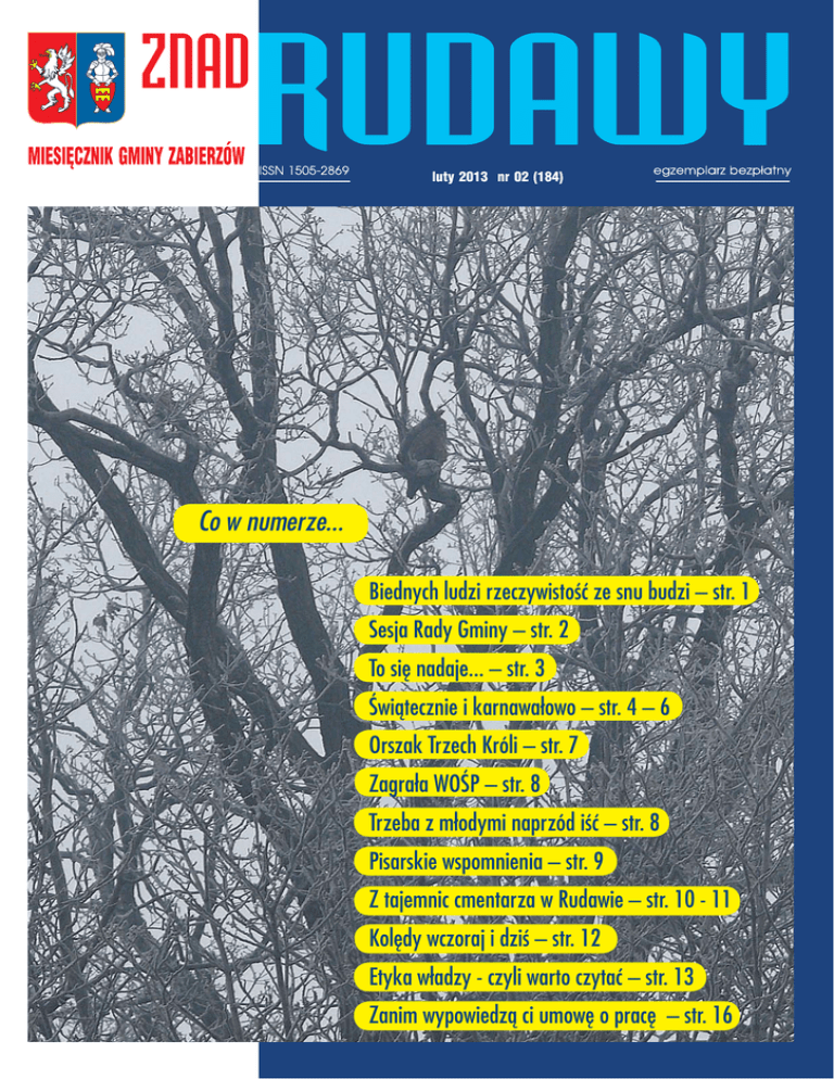 luty 2013 nr 02 (184) Co w numerze... Biednych ludzi rzeczywistość ze snu budzi – str. 1 Sesja Rady Gminy – str. 2 To się nadaje... – str. 3 Świątecznie i karnawałowo – str. 4 – 6 Orszak Trzech Króli – str. 7 Zagrała WOŚP – str. 8 Trzeba z młodymi naprzód iść – str. 8 Pisarskie wspomnienia – str. 9 Z tajemnic cmentarza w Rudawie – str. 10 - 11 Kolędy wczoraj i dziś – str. 12 Etyka władzy - czyli warto czytać – str. 13 Zanim wypowiedzą ci umowę o pracę – str. 16 15 lat Posiadamy biura do wynajęcia w budynku KBP 800 i KBP 1000 Oto jak nas biednych ludzi Rzeczywistość ze snu budzi Były premier przedwojennego Rządu Polskiego powiedział kiedyś: „Rzeczywistość rzeczywista przeciw rzeczywistości urojonej”. Oznaczało to mniej więcej tyle, ile marzeń, a raczej chęci, mieści się w określeniu prawdy i zamiarów. Dodajmy – zamiarów szlachetnych. Takie refleksje nie mogą być obce każdemu, kto rzeczywistość przedkłada nad gry, gierki, celebrytyzm i własne, najczęściej rozbujałe ego. A tak jest zawsze, gdy chodzi o swoiście pojmowaną sprawiedliwość, szczególnie przy podziale dóbr i pieniędzy, których od czasu wynalezienie ich przez Fenicjan było, jest i zapewne będzie mało. Jak w krzywym zwierciadle odbija się w tych słowach każdorazowe uchwalanie budżetu gminy. I nic dziwnego – wszyscy ostrzegają iż będzie to rok trudny, w dodatku coraz bliżej wyborów, trzeba swoją obecność koniecznie zaznaczyć w świadomości wyborców. W zeszłym roku było to szczególnie widoczne. Nie po raz pierwszy obserwuję sesję, podczas której więcej agresji niż merytorycznej dyskusji, sypią się pomówienia, podniesione głosy słychać nawet na korytarzu. Obym był złym prorokiem, ale ta atmosfera się zagęszcza. Mam świadomość, że nie w smak niektórym jest ten komentarz; pewnie po raz kolejny ktoś tam zgłosi wniosek o odwołanie mnie ze stanowiska. Nie jestem do tego, wątpliwej satysfakcji, stołka, przyspawany. Trudno mi przechodzić obok czegoś co z każdy rokiem, miesiącem czy nawet tygodniem obserwuję w pojmowaniu przez niektórych tak zwanego wspólnego interesu. To nie jest wspólny interes i dlatego nie można tego przemilczać. A gazetę niech raczej oceniają wszyscy Czytelnicy, a nie tylko Czytelnicy wybrani, najczęściej przez samych siebie. No, cóż… ten komentarz musiał powstać, bo wpisuje się w słowa, które kiedyś napisał Tadeusz Boy-Żeleński: „Oto jak nas, biednych ludzi, Rzeczywistość ze snu budzi” Witold Ślusarski Gmina Zabierzów Laureatem ogólnopolskiego „Rankingu gmin wiejskich” za rok 2012 Ranking organizowany jest przez Związek Powiatów Polskich (ZPP). Uczestniczą w nim wszystkie gminy z terenu kraju. Nasza Gmina startuje w kategorii Gminy Wiejskie. Celem Rankingu jest wyłonienie i nagrodzenie najlepszych gmin w kraju, promowanie ich, a także integracja mieszkańców i środowisk samorządowych. W danym roku kalendarzowym sprawozdawanie z realizacji poszczególnych zadań, jak również przyznawanie punktacji odbywa się na bieżąco, dlatego też pozycja w Rankingu jest zmienna i ustalana na koniec okresu sprawozdawczego. Dane zgłaszane do Rankingu dotyczyć mogą projektów realizowanych przez dany samorząd i jednostki jemu podlegające, w terenie administracyjnym danej jednostki samorządu terytorialnego. Punkty przyznawane są przez ekspertów ZPP w trybie on-line za realizację 88 zadań zgrupowanych w dziesięciu dziedzinach takich jak: • działania proinwestycyjne i prorozwojowe, • rozwiązania poprawiające jakość obsługi mieszkańca oraz funkcjonowania jst • rozwój społeczeństwa informacyjnego • rozwój społeczeństwa obywatelskiego • umacnianie systemów zarządzania bezpieczeństwem informacji • promocja rozwiązań z zakresu ochrony zdrowia i pomocy społecznej • wspieranie działań na rzecz społecznej gospodarki rynkowej • promocja rozwiązań ekoenergetycznych, proekologicznych • współpraca krajowa i międzynarodowa • działania promocyjne Gmina Zabierzów bierze udział w „Rankingu gmin wiejskich” od 2006 roku. Na przestrzeni lat można było obserwować progres w otrzymywanej ilości punktów, co przejawiało się zajmowanym coraz wyższym miejscem w niniejszej klasyfikacji. Od 4 lat zajmujemy miejsca w pierwszej dziesiątce. W roku 2012 Gmina Zabierzów otrzymała 18670 punktów, co uplasowało nas na wysokiej 6 pozycji w skali kraju. Uroczystość wręczenia nagród wyróżnionym gminom w każdej kategorii odbędzie się w czerwcu w Świdnicy podczas Kongresu Regionów. Zainteresowanym szczegółowymi informacjami na temat Rankingu polecam stronę internetową Związku Powiatów Polskich: https://www.jst.org.pl/index.php?path=main/glowna/ranking/gminya>ype=w&rok=2012 Wioletta Matejczyk Znad Rudawy Miesięcznik Gminy Zabierzów 1 Druga wizyta Comeniusa w Walii Grażyna Prusak i Lidia Kubica z zespołu COMENIUS oraz dyrektor Szkoły Podstawowej w Zabierzowie Marta Dudek odwiedziły po raz drugi partnerską szkołę podstawową w Cardiff. Podczas spotkań roboczych nauczyciele szczegółowo przeanalizowali plan działań na drugi rok projektu Comenius „Gwiazdy na europejskim niebie”, omówili sposoby realizacji kolejnych działań, ustalili terminy wykonania prac oraz sposoby ich przesyłania. W spotkaniach roboczych uczestniczyli również dyrektorzy partnerskich szkół, dzielili się swoimi doświadczeniami i udzielali cennych wskazówek. Dokonano wymiany przywiezionych materiałów. Były to prace uczniów na temat „Europejskie wakacje”, jak również listy uczniów i projekty plastyczne pt. „Moje miasto -europejski model tolerancji”. Szkoła w Cardiff jest przyjazna dla ucznia, spokojna, usytuowana w cichej, odległej o około 15 km od centrum miasta okolicy. Klasy są nieliczne (12-16 uczniów). Interesujące jest wnętrze szkoły, gdzie prawie nie ma drzwi, klasy oddzielone są j