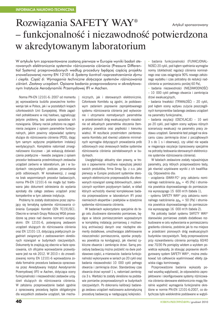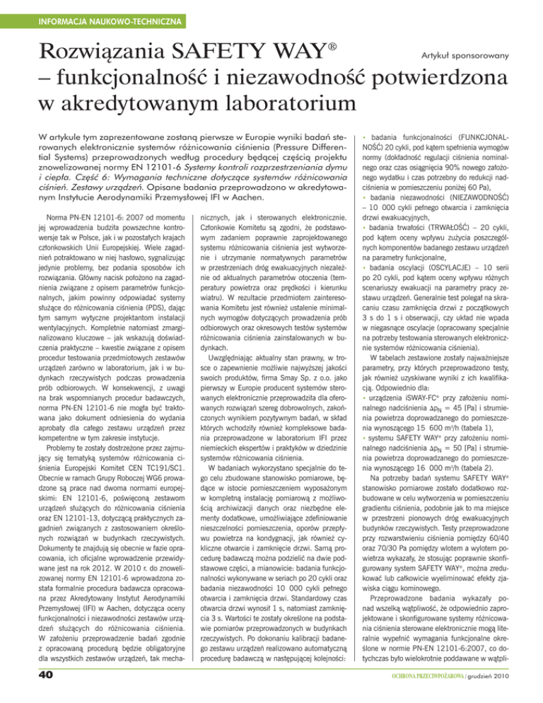 INFORMACJA NAUKOWO-TECHNICZNA Rozwiàzania SAFETY WAY® – funkcjonalnoÊç i niezawodnoÊç potwierdzona w akredytowanym laboratorium Artyku∏ sponsorowany W artykule tym zaprezentowane zostanà pierwsze w Europie wyniki badaƒ sterowanych elektronicznie systemów ró˝nicowania ciÊnienia (Pressure Differential Systems) przeprowadzonych wed∏ug procedury b´dàcej cz´Êcià projektu znowelizowanej normy EN 12101-6 Systemy kontroli rozprzestrzeniania dymu i ciep∏a. Cz´Êç 6: Wymagania techniczne dotyczàce systemów ró˝nicowania ciÊnieƒ. Zestawy urzàdzeƒ. Opisane badania przeprowadzono w akredytowanym Instytucie Aerodynamiki Przemys∏owej IFI w Aachen. Norma PN-EN 12101-6: 2007 od momentu jej wprowadzenia budzi∏a powszechne kontrowersje tak w Polsce, jak i w pozosta∏ych krajach cz∏onkowskich Unii Europejskiej. Wiele zagadnieƒ potraktowano w niej has∏owo, sygnalizujàc jedynie problemy, bez podania sposobów ich rozwiàzania. G∏ówny nacisk po∏o˝ono na zagadnienia zwiàzane z opisem parametrów funkcjonalnych, jakim powinny odpowiadaç systemy s∏u˝àce do ró˝nicowania ciÊnienia (PDS), dajàc tym samym wytyczne projektantom instalacji wentylacyjnych. Kompletnie natomiast zmarginalizowano kluczowe – jak wskazujà doÊwiadczenia praktyczne – kwestie zwiàzane z opisem procedur testowania przedmiotowych zestawów urzàdzeƒ zarówno w laboratorium, jak i w budynkach rzeczywistych podczas prowadzenia prób odbiorowych. W konsekwencji, z uwagi na brak wspomnianych procedur badawczych, norma PN-EN 12101-6 nie mog∏a byç traktowana jako dokument odniesienia do wydania aprobaty dla ca∏ego zestawu urzàdzeƒ przez kompetentne w tym zakresie instytucje. Problemy te zosta∏y dostrze˝one przez zajmujàcy si´ tematykà systemów ró˝nicowania ciÊnienia Europejski Komitet CEN TC191/SC1. Obecnie w ramach Grupy Roboczej WG6 prowadzone sà prace nad dwoma normami europejskimi: EN 12101-6, poÊwi´conà zestawom urzàdzeƒ s∏u˝àcych do ró˝nicowania ciÊnienia oraz EN 12101-13, dotyczàcà praktycznych zagadnieƒ zwiàzanych z zastosowaniem okreÊlonych rozwiàzaƒ w budynkach rzeczywistych. Dokumenty te znajdujà si´ obecnie w fazie opracowania, ich oficjalne wprowadzenie przewidywane jest na rok 2012. W 2010 r. do znowelizowanej normy EN 12101-6 wprowadzona zosta∏a formalnie procedura badawcza opracowana przez Akredytowany Instytut Aerodynamiki Przemys∏owej (IFI) w Aachen, dotyczàca oceny funkcjonalnoÊci i niezawodnoÊci zestawów urzàdzeƒ s∏u˝àcych do ró˝nicowania ciÊnienia. W za∏o˝eniu przeprowadzenie badaƒ zgodnie z opracowanà procedurà b´dzie obligatoryjne dla wszystkich zestawów urzàdzeƒ, tak mecha- 40 nicznych, jak i sterowanych elektronicznie. Cz∏onkowie Komitetu sà zgodni, ˝e podstawowym zadaniem poprawnie zaprojektowanego systemu ró˝nicowania ciÊnienia jest wytworzenie i utrzymanie normatywnych parametrów w przestrzeniach dróg ewakuacyjnych niezale˝nie od aktualnych parametrów otoczenia (temperatury powietrza oraz pr´dkoÊci i kierunku wiatru). W rezultacie przedmiotem zainteresowania Komitetu jest równie˝ ustalenie minimalnych wymogów dotyczàcych prowadzenia prób odbiorowych oraz okresowych testów systemów ró˝nicowania ciÊnienia zainstalowanych w budynkach. Uwzgl´dniajàc aktualny stan prawny, w trosce o zapewnienie mo˝liwie najwy˝szej jakoÊci swoich produktów, firma Smay Sp. z o.o. jako pierwszy w Europie producent systemów sterowanych elektronicznie przeprowadzi∏a dla oferowanych rozwiàzaƒ szereg dobrowolnych, zakoƒczonych wynikiem pozytywnym badaƒ, w sk∏ad których wchodzi∏y równie˝ kompleksowe badania przeprowadzone w laboratorium IFI przez niemieckich ekspertów i praktyków w dziedzinie systemów ró˝nicowania ciÊnienia. W badaniach wykorzystano specjalnie do tego celu zbudowane stanowisko pomiarowe, b´dàce w istocie pomieszczeniem wyposa˝onym w kompletnà instalacj´ pomiarowà z mo˝liwoÊcià archiwizacji danych oraz niezb´dne elementy dodatkowe, umo˝liwiajàce zdefiniowanie nieszczelnoÊci pomieszczenia, oporów przep∏ywu powietrza na kondygnacji, jak równie˝ cykliczne otwarcie i zamkni´cie drzwi. Samà procedur´ badawczà mo˝na podzieliç na dwie podstawowe cz´Êci, a mianowicie: badania funkcjonalnoÊci wykonywane w seriach po 20 cykli oraz badania niezawodnoÊci 10 000 cykli pe∏nego otwarcia i zamkni´cia drzwi. Standardowy czas otwarcia drzwi wynosi∏ 1 s, natomiast zamkni´cia 3 s. WartoÊci te zosta∏y okreÊlone na podstawie pomiarów przeprowadzonych w budynkach rzeczywistych. Po dokonaniu kalibracji badanego zestawu urzàdzeƒ realizowano automatycznà procedur´ badawczà w nast´pujàcej kolejnoÊci: • badania funkcjonalnoÊci (FUNKCJONALNOÂå) 20 cykli, pod kàtem spe∏nienia wymogów normy (dok∏adnoÊç regulacji ciÊnienia nominalnego oraz czas osiàgni´cia 90% nowego za∏o˝onego wydatku i czas potrzebny do redukcji nadciÊnienia w pomieszczeniu poni˝ej 60 Pa), • badania niezawodnoÊci (NIEZAWODNOÂå) – 10 000 cykli pe∏nego otwarcia i zamkni´cia drzwi ewakuacyjnych, • badania trwa∏oÊci (TRWA¸OÂå) – 20 cykli, pod kàtem oceny wp∏ywu zu˝ycia poszczególnych komponentów badanego zestawu urzàdzeƒ na parametry funkcjonalne, • badania oscylacji (OSCYLACJE) – 10 serii po 20 cykli, pod kàtem oceny wp∏ywu ró˝nych scenariuszy ewakuacji na parametry pracy zestawu urzàdzeƒ. Generalnie test polega∏ na skracaniu czasu zamkni´cia drzwi z poczàtkowych 3 s do 1 s i obserwacji, czy uk∏ad nie wpada w niegasnàce oscylacje (opracowany specjalnie na potrzeby testowania sterowanych elektronicznie systemów ró˝nicowania ciÊnienia). W tabelach zestawione zosta∏y najwa˝niejsze parametry, przy których przeprowadzono testy, jak równie˝ uzyskiwane wyniki z ich kwalifikacjà. Odpowiednio dla: • urzàdzenia iSWAY-FC® przy za∏o˝eniu nominalnego nadciÊnienia DpN = 45 [Pa] i strumienia powietrza doprow
