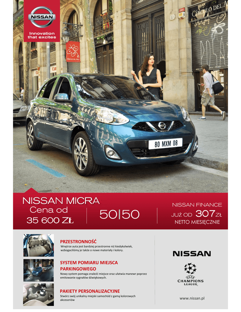 NISSAN MICRA Cena od 35 600 ZŁ 50 50 NISSAN FINANCE 307 JUŻ OD ZŁ NETTO MIESIĘCZNIE PRZESTRONNOŚĆ Wnętrze auta jest bardziej przestronne niż kiedykolwiek, wzbogaciliśmy je także o nowe materiały i kolory. SYSTEM POMIARU MIEJSCA PARKINGOWEGO Nowy system pomaga znaleźć miejsce oraz ułatwia manewr poprzez emitowanie sygnałów dźwiękowych. PAKIETY PERSONALIZACYJNE Stwórz swój unikalny miejski samochód z gamą kolorowych akcesoriów www.nissan.pl NISSAN FINANCE JUŻ OD 307 ZŁ NETTO MIESIĘCZNIE 50 50 MICRA | CENNIK PROMOCYJNY 2016 Silnik benzynowy VISIA ACENTA N-TEC TEKNA 35 600 42 500 47 150 48 250 1.2 l 59 kW (80 KM) - MT 5.0 l/100 km 1.2 l 59kW (80 KM) - CVT 5.4 l/100 km 45 900 2 48 300 52 950 - 1.2 l DIG-S 72kW (98 KM) - MT 4.1 l/100 km 47 250 3 51 000 55 650 56 750 1.2 l DIG-S 72kW (98 KM) - CVT 5.0 l/100 km - 56 800 61 450 62 550 VISIA ACENTA N-TEC TEKNA 4 500 S - - - 1 500 S S - - S S - 1 200 S S Lakier metalizowany 2 000 2 000 2 000 2 000 Lakier biały perłowy (QX1) 2 500 2 500 2 500 2 500 4 lata lub 100 000 km 595 595 595 595 5 lat lub 100 000 km 1 230 1 230 1 230 1 230 5 lat lub 150 000 km 1 535 1 535 1 535 1 535 WYPOSAŻENIE OPCJONALNE Pakiet Comfort Klimatyzacja manualna Radio CD + System bluetooth + Gniazdo USB Pakiet Auto Automatyczna klimatyzacja Konsola centralna w kolorze czarnym Czujniki deszczu i zmierzchu Nowy NissanConnect 2.0 z 5.8" kolorowym wyświetlaczem dotykowym Gniazdo USB i MP3, iPod + 6 głośników NissanConnect5 2.0 System pomiaru wielkości miejsca parkingowego Tylne czujniki parkowania Pakiet Parkingowy Nissan 5★ Rozszerzona Gwarancja 4 S - Standard 1 Oferta dostępna tylko dla dealerów biorących udział w programie. 2- Rabat 2000 ZŁ dla Dealerów biorących udział w programie | Dotyczy samochodów wyprodukowanych w 2016 roku. W celu zapoznania się ze szczegółami ofert odwiedź najbliższą placówkę dealerską 3 - Nowy Nissan Micra – Wersja Visia ze skrzynią biegów CVT posiada klimatyzację manualną, radio CD, system Bluetooth i gniazdo USB w standardzie 4 - Nissan 5★ Rozszerzona Gwarancja Umowa Ubezpieczenia Grupowego jest produktem ubezpieczeniowym; w celu uzyskania bliższych informacji prosimy zapoznać się z broszurą informacyjną oraz Ogólnymi Warunkami Ubezpieczenia dostępnymi u Autoryzowanych Dealerów. Kontrakty Rozszerzonej Gwarancji zawarte po 01/01/2016 nie obejmują usługi pomocy drogowej. 5 - Darmowa aktualizacja rocznego oprogramowania nawigacji przez 3 lata MICRA | CENNIK PODSTAWOWY 2016 Silnik benzynowy VISIA ACENTA N-TEC TEKNA 37 600 44 500 49 150 50 250 1.2 l 59 kW (80 KM) - MT 5.0 l/100 km 1.2 l 59kW (80 KM) - CVT 5.4 l/100 km 47 900 2 50 300 54 950 - 1.2 l DIG-S 72kW (98 KM) - MT 4.1 l/100 km 49 250 3 53 000 57 650 58 750 1.2 l DIG-S 72kW (98 KM) - CVT 5.0 l/100 km - 58 800 63 450 64 550 VISIA ACENTA N-TEC TEKNA 4 500 S - - - 1 500 S S - - S S - - - 2 000 - 1 200 S S Lakier metalizowany 2 000 2 000 2 000 2 000 Lakier biały perłowy (QX1) 2 500 2 500 2 500 2 500 595 595 595 595 5 lat lub 100 000 km 1 230 1 230 1 230 1 230 5 lat lub 150 000 km 1 535 1 535 1 535 1 535 WYPOSAŻENIE OPCJONALNE Pakiet Comfort Klimatyzacja manualna Radio CD + System bluetooth + Gniazdo USB Pakiet Auto Automatyczna klimatyzacja Konsola centralna w kolorze czarnym Czujniki deszczu i zmierzchu Nowy NissanConnect 2.0 z 5.8" kolorowym wyświetlaczem dotykowym Gniazdo USB i MP3, iPod + 6 głośników NissanConnect5 2.0 Szklany dach System pomiaru wielkości miejsca parkingowego Tylne czujniki parkowania Pakiet Parkingowy 4 lata lub 100 000 km Nissan 5★ Rozszerzona Gwarancja 4 S - Standard 1 - Oferta dostępna tylko dla dealerów biorących udział w programie. 2 - Nowy Nissan Micra – Wersja Visia ze skrzynią biegów CVT posiada klimatyzację manualną, radio CD, system Bluetooth i gniazdo USB w standardzie 3 - Wersja VISIA DIG-S zawiera manualną klimatyzację w standardzie 4 - Nissan 5★ Rozszerzona Gwarancja Umowa Ubezpieczenia Grupowego jest produktem ubezpieczeniowym; w celu uzyskania bliższych informacji prosimy zapoznać się z broszurą informacyjną oraz Ogólnymi Warunkami Ubezpieczenia dostępnymi u Autoryzowanych Dealerów. Kontrakty Rozszerzonej Gwarancji zawarte po 01/01/2016 nie obejmują usługi pomocy drogowej. 5 - Darmowa aktualizacja rocznego oprogramowania nawigacji przez 3 lata MICRA | WYPOSAŻENIE BEZPIECZEŃSTWO VISIA ACENTA N-TEC TEKNA - - - - Przednie, czołowe poduszki powietrzne (kierowcy i pasażera) Przednie, boczne poduszki powietrzne Kurtynowe poduszki powietrzne Trzypunktowe pasy bezpieczeństwa dla wszystkich miejsc Sygnalizator braku zapięcia pasów bezpieczeństwa kierowcy Punkty zaczepu fotelika dla dziecka ISOFIX przy tylnych zewnętrznych fotelach Zabezpieczenie drzwi tylnych przed otwarciem przez dzieci Regulacja położenia kolumny kierownicy ESP + ABS + BA Tempomat z funkcją ograniczenia prędkości - Opony o niskich oporach toczenia Dojazdowe koło zapasowe WYGLĄD ZEWNĘTRZNY 14" stalowe felgi z kołpakami - 15" stalowe felgi z kołpakami - 15" felgi ze stopów metali lekkich - - 16" felgi ze stopów metali lekkich - - - Zderzaki w kolorze nadwozia Lusterka i klamki zewnętrzne w kolorze nadwozia - Lusterka i klamki zewnętrzne w kolorze satynowym Tylne lampy STOP w technologii LED - Automatyczne halogenowe przednie lampy - P Czujnik deszczu - P Przednie reflektory przeciwmgłowe - - Spojler dachowy - Lusterka zewnętrzne regulowane elektrycznie - Lusterka zewnętrzne regulowane i składane elektrycznie - - - WYGLĄD WNĘTRZA Klimatyzacja manualna z filtrem przeciwpyłkowym P Automatyczna klimatyzacja - - - 3 3 P Elektrycznie regulowane szyby boczne z przodu Komputer pokładowy (wskaźnik temperatury zewnętrznej dostępny w wersji ACENTA+CVT oraz TEKNA) - Konsola centralna w kolorze czarnym - Regulacja wysokości fotela kierowcy - P Podłokietnik kierowcy - Tylne zagłówki 2 3 Specjalna tapicerka z niebieskim wzorem oraz przeszyciami - - Siedzenie obszyte zamszową tkani