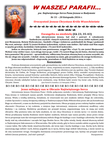 W NASZEJ PARAFII… pw. Najświętszego Serca Pana Jezusa w Radymnie Nr 51 – 20 listopada 2016 r. Uroczystość Jezusa Chrystusa Króla Wszechświata Ewangelia na niedzielę (Łk 23, 35-43) Gdy ukrzyżowano Jezusa, lud stał i patrzył. A członkowie Sanhedrynu szydzili: «Innych wybawiał, niechże teraz siebie wybawi, jeśli jest Mesjaszem, Bożym Wybrańcem». Szydzili z Niego i żołnierze; podchodzili do Niego i podawali Mu ocet, mówiąc: «Jeśli Ty jesteś Królem żydowskim, wybaw sam siebie». Był także nad Nim napis w języku greckim, łacińskim i hebrajskim: «To jest Król żydowski». Jeden ze złoczyńców, których tam powieszono, urągał Mu: «Czyż Ty nie jesteś Mesjaszem? Wybaw więc siebie i nas». Lecz drugi, karcąc go, rzekł: «Ty nawet Boga się nie boisz, chociaż tę samą karę ponosisz? My przecież – sprawiedliwie, odbieramy bowiem słuszną karę za nasze uczynki, ale On nic złego nie uczynił». I dodał: «Jezu, wspomnij na mnie, gdy przyjdziesz do swego królestwa». Jezus mu odpowiedział: «Zaprawdę, powiadam ci: Dziś będziesz ze mną w raju». Rozważanie: Podczas dzisiejszej uroczystości, gdy gromadzimy się wokół ołtarza Chrystusa, możemy zwrócić się do Boga słowami modlitwy «dobrego łotra»: «Jezu, wspomnij na mnie, wspomnij na nas (…). Gdy modlimy się, aby przyszło Twoje królestwo, spostrzegamy, że Twoja obietnica już się spełnia: idąc Twoimi śladami docieramy do Ciebie, do Twego królestwa, przyciągnięci przez Ciebie, który zostałeś wywyższony na krzyżu, wywyższony ponad historią i pośrodku historii, który jesteś Alfą i Omegą, Początkiem i Końcem, Panem czasu i wieczności! Do Ciebie zwracamy się słowami dawnego hymnu: "Przez śmierć bolesną, Królu wiecznej chwały zdobyłeś ludom życie wiekuiste, więc Królem ludzi zowie Cię świat cały. Króluj nam, Chryste. Amen. (Jan Paweł II, homilia z 22 listopada 1998r.) Jezus miłujący nas w Obrazie Najświętszego Serca Intronizacja Jezusa Chrystusa Pana i Króla połączona została z Intronizacją Najświętszego Serca Pana Jezusa w rodzinach naszej parafii. Serdecznie dziękujemy Rodzinom, które przyjęły Obraz Serca Jezusa. Wielu z wielką miłością, świadomi, że wizerunek ten jest znakiem miłości Boga do człowieka, a także łączności z naszą świątynią oddaną w Nadzwyczajnym Roku Miłosierdzia przez akt jej konsekracji Bogu na własność, a nam na duchowy pożytek ku zbawieniu. Obraz przyjęty przez rodziny będzie znakiem obecności Chrystusa w tej rodzinie, a miejsce Jego intronizacji, miejscem codziennej modlitwy całej Rodziny i za rodzinę. Niektórzy parafianie nie przyjęli Jezusa, argumentując tym, że mają już wiele obrazów. Oby postawa taka nie była znakiem, że nie chcą Chrystusa w swoim życiu i w swoim domu. Obraz przekazany każdej Rodzinie niech będzie znakiem, którym żyje nasza parafia. Jezus przez swoje Serce proponuje nam dar niewypowiedzianej miłości Boga do każdego z nas i każdego człowieka. Nie tylko kiedy stał się człowiekiem i zaczęło bić Jego Boskie Serce. Nie tylko wtedy, kiedy okazał zbawczą miłość w Najświętszym Sakramencie w Wieczerniku. Nie tylko wtedy, gdy to Serce zostało zabite za grzechy ludzi i nasze także. Nie tylko kiedy zmartwychwstało, ale teraz żyje i kocha każdego z nas. Kocha tych, którzy zauważają Jego miłość i tych, którzy pogubili się w życiu, którzy Jego miłość lekceważą, a może nawet są do niej nastawieni wrogo. Ewangelia dzisiejszej uroczystości przestrzega nas, byśmy nie przyjęli wobec miłości Jezusa postawy: „lud stał i patrzył”. Duszpasterze Chryste, nasz Królu przyrzekamy Wczoraj, 19 listopada 2016 roku, byliśmy świadkami uroczystości przyjęcia Jubileuszowego Aktu Przyjęcia Jezusa za Króla i Pana. W łagiewnickim Sanktuarium zgromadziły się tysiące wiernych, by uznać ten fakt. Dzisiaj, w święto Jezusa Chrystusa Króla Wszechświata, zostanie przyjęty we wszystkich świątyniach w Polsce, także w naszej parafii. Myśl o potrzebie aktu intronizacji została zapoczątkowana w związku z wszczęciem w archidiecezji krakowskiej w 1996 roku procesu beatyfikacyjnego Sługi Bożej Rozalii Celakówny, krakowskiej pielęgniarki i mistyczki, zmarłej w czasie II wojny światowej. Wtedy światło dzienne ujrzały jej zapiski i można było poznać treść udzielonych jej objawień prywatnych, w których Jezus domaga się m.in. aktu intronizacyjnego od narodu polskiego. Świadczy o tym choćby ten zapis: „Jest ratunek dla Polski: jeżeli mnie uzna za swego Króla i Pana w zupełności przez intronizację, nie tylko w poszczególnych częściach kraju, ale w całym państwie z rządem na czele. To uznanie ma być potwierdzone porzuceniem grzechów i całkowitym zwrotem do Boga”. Wieść o tego typu żądaniach Jezusa w objawieniach danych Celakównej szybko się rozniosła. Pojawiło się wiele inicjatyw, których celem było doprowadzenie do aktu intronizacyjnego. Okazało się również, że analogiczna myśl o konieczności uznania Chrystusa swoim Panem i Zbawicielem stanowi centralny rys duchowości i formacji wielu wspólnot i stowarzyszeń w Polsce, zwłaszcza środowiska oazowego i charyzmatycznego; jest też u podstaw spotkań młodzieży w Lednicy. Przyjęcie panowania Jezusa, uznanie Go swym Panem, ma znaczenie zbawcze. Jest pragnieniem serc Polaków rozumiejących, że od największych zagrożeń doczesnych nieskończenie groźniejsza jest utrata zbawienia. Współcześnie zagraża ona coraz większej liczbie ludzi na skutek odrzucenia prawdy – na skutek odrzucenia Chrystusa, który jest Prawdą i na skutek odrzucenia Jego prawa miłości. Stąd pragnienie, aby powszechnej w świecie detronizacji Chrystusa Polska przeciwstawiła Jego intronizację. Przyjęcie panowania Jezusa Chrystusa ma być z założenia aktem wiary narodu. Celem tego aktu nie jest zapewnienie doczesnej władzy czy dostatku