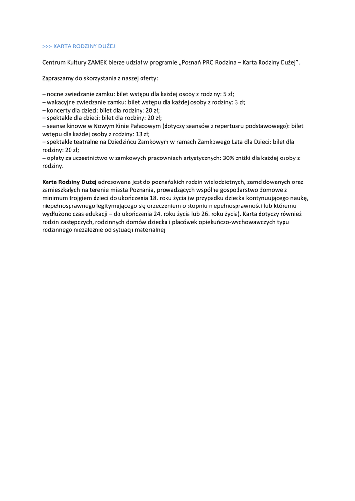 >>> KARTA RODZINY DUŻEJ Centrum Kultury ZAMEK bierze udział w programie „Poznań PRO Rodzina ‒ Karta Rodziny Dużej”. Zapraszamy do skorzystania z naszej oferty: ‒ nocne zwiedzanie zamku: bilet wstępu dla każdej osoby z rodziny: 5 zł; ‒ wakacyjne zwiedzanie zamku: bilet wstępu dla każdej osoby z rodziny: 3 zł; ‒ koncerty dla dzieci: bilet dla rodziny: 20 zł; ‒ spektakle dla dzieci: bilet dla rodziny: 20 zł; ‒ seanse kinowe w Nowym Kinie Pałacowym (dotyczy seansów z repertuaru podstawowego): bilet wstępu dla każdej osoby z rodziny: 13 zł; ‒ spektakle teatralne na Dziedzińcu Zamkowym w ramach Zamkowego Lata dla Dzieci: bilet dla rodziny: 20 zł; ‒ opłaty za uczestnictwo w zamkowych pracowniach artystycznych: 30% zniżki dla każdej osoby z rodziny. Karta Rodziny Dużej adresowana jest do poznańskich rodzin wielodzietnych, zameldowanych oraz zamieszkałych na terenie miasta Poznania, prowadzących wspólne gospodarstwo domowe z minimum trojgiem dzieci do ukończenia 18. roku życia (w przypadku dziecka kontynuującego naukę, niepełnosprawnego legitymującego się orzeczeniem o stopniu niepełnosprawności lub któremu wydłużono czas edukacji ‒ do ukończenia 24. roku życia lub 26. roku życia). Karta dotyczy również rodzin zastępczych, rodzinnych domów dziecka i placówek opiekuńczo-wychowawczych typu rodzinnego niezależnie od sytuacji materialnej.