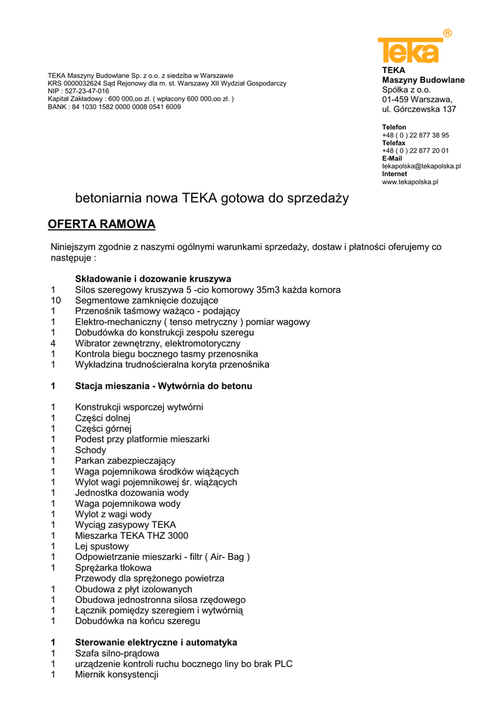 TEKA Maszyny Budowlane Sp. z o.o. z siedziba w Warszawie KRS 0000032624 Sąd Rejonowy dla m. st. Warszawy XII Wydział Gospodarczy NIP : 527-23-47-016 Kapitał Zakładowy : 600 000,oo zł. ( wpłacony 600 000,oo zł. ) BANK : 84 1030 1582 0000 0008 0541 6009 TEKA Maszyny Budowlane Spółka z o.o. 01-459 Warszawa, ul. Górczewska 137 Telefon +48 ( 0 ) 22 877 38 95 Telefax +48 ( 0 ) 22 877 20 01 E-Mail [email protected] Internet www.tekapolska.pl betoniarnia nowa TEKA gotowa do sprzedaŜy OFERTA RAMOWA Niniejszym zgodnie z naszymi ogólnymi warunkami sprzedaŜy, dostaw i płatności oferujemy co następuje : 1 10 1 1 1 4 1 1 Składowanie i dozowanie kruszywa Silos szeregowy kruszywa 5 -cio komorowy 35m3 kaŜda komora Segmentowe zamknięcie dozujące Przenośnik taśmowy waŜąco - podający Elektro-mechaniczny ( tenso metryczny ) pomiar wagowy Dobudówka do konstrukcji zespołu szeregu Wibrator zewnętrzny, elektromotoryczny Kontrola biegu bocznego tasmy przenosnika Wykładzina trudnościeralna koryta przenośnika 1 Stacja mieszania - Wytwórnia do betonu 1 1 1 1 1 1 1 1 1 1 1 1 1 1 1 1 1 1 1 1 Konstrukcji wsporczej wytwórni Części dolnej Części górnej Podest przy platformie mieszarki Schody Parkan zabezpieczający Waga pojemnikowa środków wiąŜących Wylot wagi pojemnikowej śr. wiąŜących Jednostka dozowania wody Waga pojemnikowa wody Wylot z wagi wody Wyciąg zasypowy TEKA Mieszarka TEKA THZ 3000 Lej spustowy Odpowietrzanie mieszarki - filtr ( Air- Bag ) SpręŜarka tłokowa Przewody dla spręŜonego powietrza Obudowa z płyt izolowanych Obudowa jednostronna silosa rzędowego Łącznik pomiędzy szeregiem i wytwórnią Dobudówka na końcu szeregu 1 1 1 1 Sterowanie elektryczne i automatyka Szafa silno-prądowa urządzenie kontroli ruchu bocznego liny bo brak PLC Miernik konsystencji Strona 2/3 oferty przygotowanej przez firmę: dotyczącej maszyny : 1 1 1 1 1 1 1 1 1 1 1 5 1 1 1 1 1 1 Teka Maszyny Budowlane Spółka z o.o. betoniarnia TEKA, Typ MIXOMAT C1 THZ3000 R5/5x35m3 Amperometr Wzmacniacz wartości pomiarowych wag Stolik pod drukarkę Uchwyt dla sondy Pulpit obsługowy obsługi lokalnej dla mieszarki Obsuga manualna poza PLC - wersja LAFARGE Kabina sterownicza w zabudowie kontenerowej Konwektor elektryczny wbudowany w kontener Klimatyzator do montaŜu w kontener Wyłączniki dla potrzeb konserwacji Wyłącznik konserwacyjny mieszarki Wyłącznik konserwacyjny taśmy wagowej Wyłącznik konserwacyjny przen. ślimakowych Wyłącznik konserwacyjny wyciągu zasypowego Materiał elektro-instalacyjny Oświetlenie Miernik pomiaru wilgotności piasku Sonda pomiarowa mikrofalowa Wzmacniacz wartości pomiarowych Komputer dozujący Program komputerowy Komputer dozujący Drukarka protokołów Drukarka dowodów wydania (wz) Stabilizator napięcia Obsługa manualna poprzez monitor Wizualizacja wytwórni na monitorze Zdalna konserwacja poprzez modem Wizualizacja dla obsługi ręcznej System dozowania Drukarka protokołów Stabilizator prądowy USV 750 VA online Dysk lustrzany Zabezpieczenie danych na nośniku CD Zabezpieczenie danych na nośniku USB – Flasch Modem do zdalnej konserwacji RAZEM : 350.000,00 € Strona 3/3 oferty przygotowanej przez firmę: dotyczącej maszyny : Teka Maszyny Budowlane Spółka z o.o. betoniarnia TEKA, Typ MIXOMAT C1 THZ3000 R5/5x35m3 Warunki ceny : Z zakładu produkcyjnego TEKA , z załadunkiem, bez transportu i rozładunku. Dźwigi do rozładunku zapewnia kupujący Termin dostawy : Jeden miesiąc od daty złoŜenia zamówienia i zapłaty zaliczki Płatność : 30% przy złoŜeniu zamówienia 60% po dostawie względnie zgłoszeniu gotowości do wysyłki 10% po dokonaniu montaŜu, nie później niŜ 5 tygodni od daty dostawy. Do wszystkich cen i płatności naleŜy doliczyć 22% podatku VAT. Płatności dokonywane będą w złotych polskich po kursie przeliczenia z tabeli sprzedaŜy walut banku wskazanego przez sprzedającego. TEKA daje do dyspozycji : Plany poglądowe, Plany zakotwienia Lakier zewnętrzny według: Biało-szary RAL 9010 Teka Maszyny Budowlane Sp. z o.o.