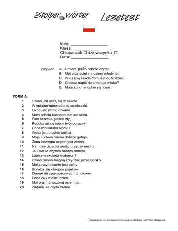 Imię: ________________ Klasa: ________________ Chłopaczek dziewczynka Data: ________________ przykład FORM A 1 2 3 4 5 6 7 8 9 10 11 12 13 14 15 16 17 18 19 20 A B C D E Umiem słowo dobrze czytać. Mój przyjaciel ma osiem młody lat. W naszej szkole dom jest dużo dzieci. Chcesz napić się smakuje mleka? Moje spodnie ładne są nowe. Dzieci jest uczą się w szkole. W ksiażce opowiadania są obrazki. Okno jest zimno otwarte. Moja babcia kochana jest już stara. Pies szczeka głośno zły. Podoba mi się ładny twój obrazek. Chcesz cukierka słodki? Woda jest brudna tablica. Moja kuchnia mama dobrze gotuje. Zima lodowato często jest zimno. Na nosie dziadka siedzi brzęczy mucha. Ja ksiażka czytam bardzo dobrze. Lubisz czekolada makaron? Dzieci głośno biegną krzyczac przez boisko. Moj zeszyt pisanie jest pełny. Brzydzę się okropne pająków. Złamał się zatemperować mój ołowek. Pada cały mokro dzień. Moj brat ma wczoraj osiem lat. Zadania są czyta trudne. Übersetzung der polnischen Fassung von Barbara und Peter Ostapczuk Imię: ________________ Klasa: ________________ Chłopaczek dziewczynka Data: ________________ przykład FORM A 1 2 3 4 5 6 7 8 9 10 11 12 13 14 15 16 17 18 19 20 A B C D E Umiem słowo dobrze czytać. Mój przyjaciel ma osiem młody lat. W naszej szkole dom jest dużo dzieci. Chcesz napić się smakuje mleka? Moje spodnie ładne są nowe. Dzieci jest uczą się w szkole. W ksiażce opowiadania są obrazki. Okno jest zimno otwarte. Moja babcia kochana jest już stara. Pies szczeka głośno zły. Podoba mi się ładny twój obrazek. Chcesz cukierka słodki? Woda jest brudna tablica. Moja kuchnia mama dobrze gotuje. Zima lodowato często jest zimno. Na nosie dziadka siedzi brzęczy mucha. Ja ksiażka czytam bardzo dobrze. Lubisz czekolada makaron? Dzieci głośno biegną krzyczac przez boisko. Moj zeszyt pisanie jest pełny. Brzydzę się okropne pająków. Złamał się zatemperować mój ołowek. Pada cały mokro dzień. Moj brat ma wczoraj osiem lat. Zadania są czyta trudne. Übersetzung der polnischen Fassung von Barbara und Peter Ostapczuk