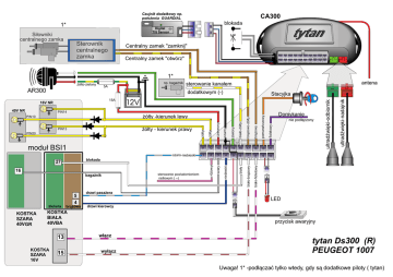 Czujnik dodatkowy np. po³o¿enia GUARDIAL blokada 1* Si³owniki centralnego zamka Sterownik centralnego zamka CA300 Centralny zamek "zamknij" Centralny zamek "otwórz" 1* AR300 dodatkowym (-) PIN14 zielona 5 4 br¹zowa KOSTKA SZARA 16V 15 bia³o-¿ó³ty br¹zowo-¿ó³ty br¹zowy pomarañczowy fioletowy 12 13 14 15 16 17 18 19 20 1 2 3 4 5 6 7 8 9 10 bia³y bia³o-br¹zowy bia³o-fioletowy nie pod³¹czony drzwi pasa¿era LED drzwi kierowcy KOSTKA BIA£A 40VBA 13 sterowanie powiadomieniem radiowym ( --) zielony baga¿nik czarny 16 11 niebieski blokada 27 czerwony szaro-niebieski szary modu³ BSI1 ¿ó³ty ¿ó³ty - kierunek prawy PIN13 PIN20 Domykanie ró¿owy ¿ó³ty -kierunek lewy PIN10 ¿ó³ty 40V NR Stacyjka 15A 16V NR KOSTKA SZARA 40VGR antena sterowanie kana³em ultradŸwiêki-nadajnik np. baga¿nik 5A ultradŸwiêki-odbiornik ¿ó³to-zielony przycisk awaryjny w³¹cz wy³¹cz tytan Ds300 (R) PEUGEOT 1007 Uwaga! 1* -pod³¹czaæ tylko wtedy, gdy s¹ dodatkowe piloty ( tytan)