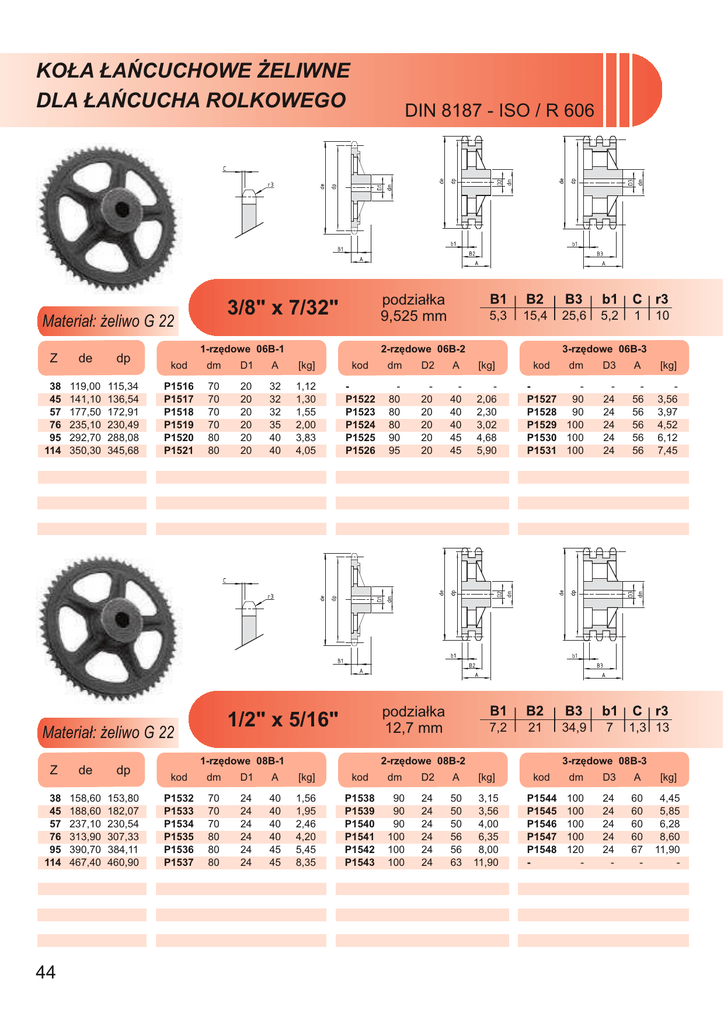 KO£A £AÑCUCHOWE ¯ELIWNE DLA £AÑCUCHA ROLKOWEGO de dp 38 45 57 76 95 114 119,00 141,10 177,50 235,10 292,70 350,30 115,34 136,54 172,91 230,49 288,08 345,68 1-rzêdowe 06B-1 de dp 38 45 57 76 95 114 158,60 188,60 237,10 313,90 390,70 467,40 153,80 182,07 230,54 307,33 384,11 460,90 44 5,3 15,4 2-rzêdowe 06B-2 dm D1 A [kg] kod dm D2 A [kg] P1516 P1517 P1518 P1519 P1520 P1521 70 70 70 70 80 80 20 20 20 20 20 20 32 32 32 35 40 40 1,12 1,30 1,55 2,00 3,83 4,05 P1522 P1523 P1524 P1525 P1526 80 80 80 90 95 20 20 20 20 20 40 40 40 45 45 2,06 2,30 3,02 4,68 5,90 podzia³ka 12,7 mm 1/2" x 5/16" 5,2 1 10 7,2 dm D3 A [kg] P1527 90 P1528 90 P1529 100 P1530 100 P1531 100 24 24 24 24 24 56 56 56 56 56 3,56 3,97 4,52 6,12 7,45 21 7 kod 2-rzêdowe 08B-2 1-rzêdowe 08B-1 25,6 3-rzêdowe 06B-3 kod Materia³: ¿eliwo G 22 Z podzia³ka 9,525 mm 3/8" x 7/32" Materia³: ¿eliwo G 22 Z DIN 8187 - ISO / R 606 34,9 1,3 13 3-rzêdowe 08B-3 kod dm D1 A [kg] kod dm D2 A [kg] kod dm D3 A [kg] P1532 P1533 P1534 P1535 P1536 P1537 70 70 70 80 80 80 24 24 24 24 24 24 40 40 40 40 45 45 1,56 1,95 2,46 4,20 5,45 8,35 P1538 P1539 P1540 P1541 P1542 P1543 90 90 90 100 100 100 24 24 24 24 24 24 50 50 50 56 56 63 3,15 3,56 4,00 6,35 8,00 11,90 P1544 P1545 P1546 P1547 P1548 - 100 100 100 100 120 - 24 24 24 24 24 - 60 60 60 60 67 - 4,45 5,85 6,28 8,60 11,90 - KO£A £AÑCUCHOWE ¯ELIWNE DLA £AÑCUCHA ROLKOWEGO de dp 38 45 57 76 95 114 199,10 236,00 296,60 392,50 488,50 584,50 192,24 227,58 288,18 384,16 480,14 576,13 1-rzêdowe 10B-1 de dp 38 45 57 76 95 114 238,90 283,20 355,90 471,10 586,20 701,40 230,69 273,10 345,81 460,99 576,17 691,36 9,1 25,5 2-rzêdowe 10B-2 42,1 9 1,6 16 3-rzêdowe 10B-3 kod dm D1 A [kg] kod dm D2 A [kg] kod dm D3 A [kg] P1549 P1550 P1551 P1552 P1553 P1554 80 80 90 90 100 100 24 24 24 24 24 24 40 40 45 50 56 56 2,32 2,88 4,30 7,00 10,65 14,50 P1555 P1556 P1557 P1558 P1559 P1560 100 100 100 100 110 125 30 30 30 30 30 30 50 50 56 63 63 70 4,56 4,93 6,50 9,10 12,60 17,80 P1561 P1562 P1563 P1564 P1565 P1566 100 100 100 110 125 125 32 32 32 35 35 35 60 60 63 67 70 80 6,50 7,04 8,00 12,00 19,40 24,00 podzia³ka 19,05 mm 3/4" x 7/16" Materia³: ¿eliwo G 22 Z podzia³ka 15,875 mm 5/8" x 3/8" Materia³: ¿eliwo G 22 Z DIN 8187 - ISO / R 606 11,1 30,3 2-rzêdowe 12B-2 1-rzêdowe 12B-1 49,8 10,8 2 19 3-rzêdowe 12B-3 kod dm D1 A [kg] kod dm D2 A [kg] kod dm D3 A [kg] P1567 P1568 P1569 P1570 P1571 P1572 100 100 100 100 100 100 24 24 30 30 30 30 56 56 56 56 65 65 4,75 5,90 6,45 12,30 15,40 24,80 P1573 P1574 P1575 P1576 P1577 P1578 110 110 120 135 135 135 25 30 30 30 30 45 63 63 63 63 70 70 7,50 8,30 10,30 15,20 20,20 30,40 P1579 P1580 P1581 P1582 P1583 P1584 115 140 140 160 170 170 30 30 40 40 40 50 70 70 70 75 82 82 10,00 13,30 15,25 27,20 36,40 41,10 45 KO£A £AÑCUCHOWE ¯ELIWNE DLA £AÑCUCHA ROLKOWEGO Materia³: ¿eliwo G 22 Z de dp 38 45 57 76 95 114 319,20 377,90 474,90 628,40 782,00 935,60 307,59 364,12 461,07 614,65 768,22 921,81 de dp 38 399,40 384,49 57 592,30 576,36 76 784,30 768,32 46 podzia³ka 25,4 mm 1" x 17,02 mm 1-rzêdowe 16B-1 16,2 47,7 2-rzêdowe 16B-2 79,6 15,8 2,5 26 3-rzêdowe 16B-3 kod dm D1 A [kg] kod dm D2 A [kg] kod dm D3 A [kg] P1585 P1586 P1587 P1588 P1589 P1590 110 125 125 140 140 150 30 30 35 35 40 40 65 70 70 80 80 80 8,26 10,75 12,90 24,70 32,00 45,50 P1591 P1592 P1593 P1594 P1595 P1596 140 150 170 175 175 180 40 40 40 40 45 45 75 75 90 95 95 95 16,45 19,20 29,50 46,30 53,00 74,00 P1597 P1598 P1599 P1600 P1601 P1602 160 160 180 200 200 200 45 45 45 45 50 50 100 100 100 110 110 115 25,40 33,60 44,70 63,10 77,00 97,00 podzia³ka 31,75 mm 1"1/4 x 3/4" Materia³: ¿eliwo G 22 Z DIN 8187 - ISO / R 606 1-rzêdowe 20B-1 18,5 54,6 2-rzêdowe 20B-2 kod dm D1 A [kg] kod dm D2 P1603 P1604 P1605 125 135 140 35 40 50 70 80 90 12,30 25,60 29,10 P1606 P1607 P1608 140 170 180 45 50 50 A 91 18,2 3,5 32 3-rzêdowe 20B-3 [kg] 90 24,80 100 43,00 110 62,50 kod dm D3 P1609 P1610 P1611 180 180 200 50 50 50 A [kg] 115 52,00 130 71,50 140 115,00 KO£A £AÑCUCHOWE ¯ELIWNE DLA £AÑCUCHA ROLKOWEGO de dp 38 476,50 461,39 57 707,50 691,63 76 939,00 921,98 podzia³ka 38,1 mm 1"1/2 x 1" Materia³: ¿eliwo G 22 Z DIN 8187 - ISO / R 606 1-rzêdowe 24B-1 24,1 72 dm D1 A [kg] kod dm D2 P1612 P1613 P1614 140 160 180 45 45 45 90 100 100 21,80 46,20 63,60 P1615 P1616 P1617 180 200 220 45 50 55 A 38 3-rzêdowe 24B-3 2-rzêdowe 24B-2 kod 120,3 23,6 4 [kg] 100 42,20 110 72,70 120 125,00 dm D3 P1618 200 P1619 200 - 50 55 - kod A [kg] 150 42,50 150 119,40 - 47