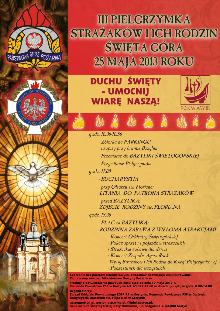 III PIELGRZYMKA STRAŻAKÓW I ICH RODZIN ŚWIĘTA GÓRA 25 maja 2013 roku DUCHU ŚWIĘTY - UMOCNIJ WIARĘ NASZĄ! godz. 16.30-16.50 - Zbiórka na parkingu i zapisy przy bramie Bazyliki - Przemarsz do BazylikI ŚwiętogórskIEJ - Przywitanie Pielgrzymów godz. 17.00 - EUCHARYSTIA - przy Ołtarzu św. Floriana: LITANIA DO PATRONA STRAŻAKÓW - przed BAZYLIKĄ: ZDJĘCIE RODZINY św. FLORIANA godz. 18.30 - PLAC za BAZYLIKĄ: RODZINNA ZABAWA Z WIELOMA ATRAKCJAMI - Koncert Orkiestry Świętogórksiej - Pokaz sprzętu i pojazdów strażackich - Strażackie zabawy dla dzieci - Koncert Zespołu Ayers Rock -Wpisy Strażaków i Ich Rodzin do Księgi Pielgrzymkowej - Poczęstunek dla wszystkich Spotkanie bez pocztów sztandarowych. Strażaków obowiązuje umundurowanie. Zapraszamy również Młodzieżowe Drużyny Pożarnicze. Prosimy o potwierdzenie przybycia ilości osób do dnia 19 maja 2013 r. Komenda Powiatowa PSP w Gostyniu tel. 65 322 42 60 w dniach: pn.-pt., w godz. 8.00-14.00 Organizatorzy: Zarząd Oddziału Powiatowego ZOSP RP w Gostyniu, Komenda Powiatowa PSP w Gostyniu, Kongregacja Oratorium św. Filipa Neri w Gostyniu zosprpgostyn.pl, gostyn.psp.wlkp.pl, filipini.gostyn.pl, Sanktuarium Świętogórskiej Róży Duchownej, ul. Głogówko 1, 63-800 Gostyń