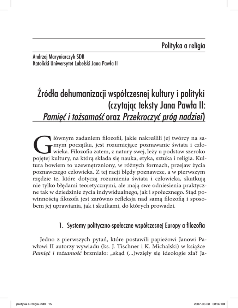 Polityka a religia Andrzej Maryniarczyk SDB Katolicki Uniwersytet Lubelski Jana Pawła II Źródła dehumanizacji współczesnej kultury i polityki (czytając teksty Jana Pawła II: Pamięć i tożsamość oraz Przekroczyć próg nadziei) G łównym zadaniem filozofii, jakie nakreślili jej twórcy na samym początku, jest rozumiejące poznawanie świata i człowieka. Filozofia zatem, z natury swej, leży u podstaw szeroko pojętej kultury, na którą składa się nauka, etyka, sztuka i religia. Kultura bowiem to uzewnętrzniony, w różnych formach, przejaw życia poznawczego człowieka. Z tej racji błędy poznawcze, a w pierwszym rzędzie te, które dotyczą rozumienia świata i człowieka, skutkują nie tylko błędami teoretycznymi, ale mają swe odniesienia praktyczne tak w dziedzinie życia indywidualnego, jak i społecznego. Stąd powinnością filozofa jest zarówno refleksja nad samą filozofią i sposobem jej uprawiania, jak i skutkami, do których prowadzi. 1. Systemy polityczno-społeczne współczesnej Europy a filozofia Jedno z pierwszych pytań, które postawili papieżowi Janowi Pawłowi II autorzy wywiadu (ks. J. Tischner i K. Michalski) w książce Pamięć i tożsamość brzmiało: „skąd (...)wzięły się ideologie zła? Ja- polityka a religia.indd 15 2007-03-28 08:32:00 Andrzej Maryniarczyk SDB kie są korzenie nazizmu i komunizmu? Jak doszło do upadku tych systemów?”. Należy odnotować, że zło nazizmu i komunizmu, które w XX wieku przybrało wymiar nieporównywalny do żadnych z minionych epok, pochłonęło około 170 milionów istnień ludzkich (około 50 mln nazizm, resztę komunizm). Jeśli dodamy do tego ofiary komunizmu w Chinach, na Kubie, w Korei oraz ofiary nienarodzonych dzieci, jako rezultat ideologii liberalistycznych forsujących ustawy proaborcyjne (w samej Polsce około 20 mln dzieci – w ciągu obowiązywania ustawy proaborcyjnej), to ofiara krwi tych ofiar „woła o pomstę do nieba”. Nie można nie zauważyć także i tego, że u podstaw tych współczesnych holokaustów leżą pewne ideologie, które zostały wygenerowane przez określone nurty filozoficzne. To one stały się „siłą napędową” machiny zła i tego filozof nie może nie widzieć, nie osądzać w świetle realnych faktów i przed tym nie przestrzegać. a) W poszukiwaniu właściwej odpowiedzi Jan Paweł II w książce Pamięć i tożsamość wskazuje obok wymiaru teologicznego także wymiar filozoficzny „inwazji” zła, z jaką mieliśmy do czynienia w XX wieku, a czego ciągle jesteśmy świadkami w rozpoczynającym się XXI wieku. Papież zwraca uwagę, że ideologia nazistowska oraz komunistyczna miała swe własne „filozofie zła”. Jeśli weźmiemy także pod uwagę to, co dzieje się we współczesnej Europie wraz z pojawieniem się idei „unii europejskiej”, w imię której narzucana jest przez unię krajom członkowskim liberalna ideologia zła obecna w prawodawstwie dotyczącym człowieka, rodziny, moralności czy religii, to także należy postawić pytanie o „filozofię unii” i nazwanie jej po imieniu. Jan Paweł II, Pamięć i tożsamość, Kraków 2005, s. 13. Tamże, s. 13. 16 polityka a religia.indd 16 2007-03-28 08:32:00 Źródła dehumanizacji współczesnej kultury i polityki „W ciągu lat – pisze Jan Paweł II – zrodziło się we mnie przeświadczenie, że ideologie zła są głęboko zakorzenione w dziejach europejskiej myśli filozoficznej. W tym miejscu muszę dotknąć pewnych faktów, które związane są z dziejami Europy, a zwłaszcza jej kultury. Kiedy ukazała się Encyklika o Duchu świętym, pewne środowiska na Zachodzie bardzo negatywnie na nią zareagowały. Z czego wynikała ta reakcja? Pochodziła ona z tych samych źródeł, z których przed ponad dwustu lat zrodziło się tak zwane europejskie oświecenie – w szczególności oświecenie francuskie, nie wykluczając jednak angielskiego, niemieckiego, hiszpańskiego i włoskiego”. 1) Źródła ideologii niemieckiego nazizmu Jana Pawła II rozpoznanie korzeni zła dla ideologii nazistowskiej (a także komunistycznej) jest bardzo jasne i czytelne. Jednym z głównych źródeł jest filozofia upatrująca w rozumie ludzkim ostateczne źródło prawdy. Chodzi zatem o taką filozofię, która zamiast poznawać realne rzeczy (realnego człowieka, realny świat) produkuje idee, utopie i narzuca je na rzeczywistość. Co więcej, do tych skonstruowanych idei chce dopasować rzeczywistość. Wskutek tego dzieje się tak, że całe społeczeństwa ludzkie są zmuszane realizować „skonstruowane ideologie i utopie” zamiast żyć godnie i rozwijać się zgodnie z własną naturą. Powstaje tu pytanie o jaką konkretnie filozofię chodzi? „Aby lepiej naświetlić ten problem – pisze Jan Paweł II – trzeba wrócić jeszcze do okresu przed oświeceniem, a przede wszystkim to tej rewolucji, jakiej w myśleniu filozoficznym dokonał KARTEZJUSZ. Cogito, ergo sum – „myślę, więc jestem”, przyniosło odwrócenie porządku w dziedzinie filozofowania. W okresie przedkartezjańskim filozofia, a więc cogito (myślę) czy raczej cognosco (poznaję), była przyporządkowana Tamże, s. 16. 17 polityka a religia.indd 17 2007-03-28 08:32:00 Andrzej Maryniarczyk SDB do esse (być), które było czymś pierwotnym. Dla Kartezjusza natomiast esse stało się czymś wtórnym, podczas gdy za pierwotne uważał cogito. W ten sposób dokonała się nie tylko zmiana kierunku filozofowania, ale również radykalne odejście od tego, czym dawnej była filozofia, czym była w szczególności filozofia św. Tomasza z Akwinu: filozofia esse. Wcześniej wszystko było interpretowane przez pryzmat istnienia (esse) i wszystko się przez ten pryzmat tłumaczyło. Bóg jako samoistne Istnienie (Ens subsistens) stanowił nieodzowne oparcie dla każdego ens non subsistens, ens participatu, czyli dla wszystkich bytów stworzonych, a więc także dla człowieka. Cogito, ergo sum przynios