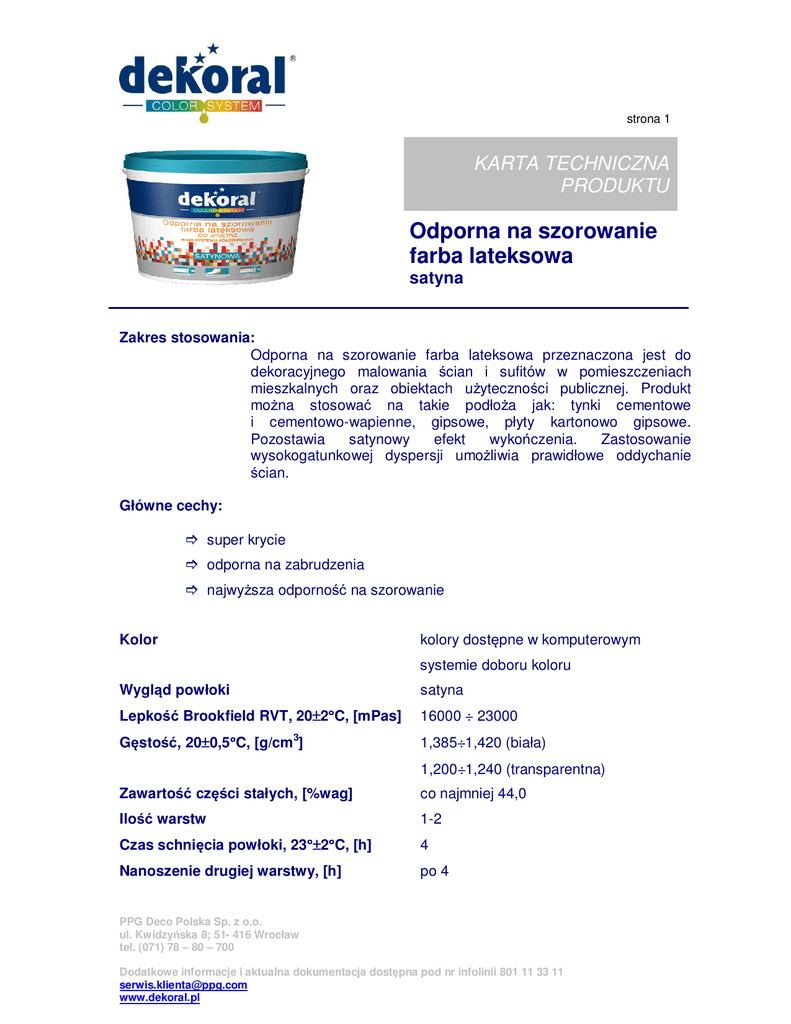 strona 1 KARTA TECHNICZNA PRODUKTU Odporna na szorowanie farba lateksowa satyna Zakres stosowania: Odporna na szorowanie farba lateksowa przeznaczona jest do dekoracyjnego malowania ścian i sufitów w pomieszczeniach mieszkalnych oraz obiektach użyteczności publicznej. Produkt można stosować na takie podłoża jak: tynki cementowe i cementowo-wapienne, gipsowe, płyty kartonowo gipsowe. Pozostawia satynowy efekt wykończenia. Zastosowanie wysokogatunkowej dyspersji umożliwia prawidłowe oddychanie ścian. Główne cechy: super krycie odporna na zabrudzenia najwyższa odporność na szorowanie Kolor kolory dostępne w komputerowym systemie doboru koloru Wygląd powłoki satyna Lepkość Brookfield RVT, 20± ±2°°C, [mPas] 16000 ÷ 23000 Gęstość, 20± ±0,5°°C, [g/cm3] 1,385÷1,420 (biała) 1,200÷1,240 (transparentna) Zawartość części stałych, [%wag] co najmniej 44,0 Ilość warstw 1-2 Czas schnięcia powłoki, 23°°±2°°C, [h] 4 Nanoszenie drugiej warstwy, [h] po 4 PPG Deco Polska Sp. z o.o. ul. Kwidzyńska 8; 51- 416 Wrocław tel. (071) 78 – 80 – 700 Dodatkowe informacje i aktualna dokumentacja dostępna pod nr infolinii 801 11 33 11 [email protected] www.dekoral.pl strona 2 Sposób nanoszenia pędzel, wałek lub natrysk Rekomendowane narzędzia marki Dekoral Gold Wałek Microfibre, Wałek Microfibre Extra, Wałek Perlon Extra Wydajność przy jednej warstwie do 14 m2/l w zależności od chłonności podłoża i koloru Rozcieńczalnik woda Sposób użycia 1.Przygotowanie podłoża • Pozostałości po farbach klejowych dokładnie usuń, a podłoże zmyj wodą. • Powierzchnia przeznaczona do malowania powinna być czysta, sucha, odpylona, bez spękań. • Świeże tynki i podłoża silnie chłonące wodę (gładzie i tynki gipsowe, płyty gipsowo-kartonowe, gazobeton, szpachlówki, podłoża nigdy nie malowane) zagruntuj preparatem Aquagrunt Koncentrat marki Dekoral lub Reno Grunt marki Malfarb. • Do wyrównania chłonności i odcienia podłoża stosuj Podkładową Farbę Gruntującą marki Dekoral. • Powierzchnie pomalowane farbami emulsyjnymi odtłuść poprzez umycie wodą z dodatkiem środków myjących (np. mydło malarskie). • Uciążliwe plamy i zatłuszczenia zabezpiecz farbą na plamy – Renostyl Plus marki Dekoral. • Dla kolorów o niestandardowym kryciu, wskazanych w bazie danych przy maszynach kolorujących należy użyć wskazanego podkładu kolorystycznego. • W przypadku posiadania produktów z różnych partii produkcyjnych zaleca się wymieszać je ze sobą w celu ujednolicenia odcienia. • Przed aplikacją wyrobu prosimy o sprawdzenie zgodności koloru we wszystkich opakowaniach ze złożonym zamówieniem. 2. Malowanie • Przed użyciem wyrób dokładnie wymieszaj. • W razie potrzeby pierwszą warstwę rozcieńcz woda w ilości max. 5% obj. • Maluj w temperaturze od + 10° C do + 25° C. • Świeże tynki maluj po 3-4 tygodniach od ich nałożenia. • Pełne właściwości użytkowe powłoka uzyskuje po 4 tygodniach od pomalowania. 3. Dodatkowe informacje • Po zakończeniu malowania narzędzia umyj wodą. PPG Deco Polska Sp. z o.o. ul. Kwidzyńska 8; 51- 416 Wrocław tel. (071) 78 – 80 – 700 Dodatkowe informacje i aktualna dokumentacja dostępna pod nr infolinii 801 11 33 11 [email protected] www.dekoral.pl strona 3 • W czasie prac malarskich i po ich zakończeniu pomieszczenia przed użytkowaniem wywietrz do zaniku charakterystycznego zapachu. 4. Wskazówki BHP i PPOŻ • Stosować się do zaleceń podanych na opakowaniu. • Szczegółowe informacje zamieszczone są w Karcie Charakterystyki. Atesty: Posiada Atest Higieniczny PN-C-81914 Rodzaj I (odporne na szorowanie na mokro) zgodna z PN-EN-13300 PKWiU: Data ważności: 20.30.11.0. 36 miesięcy od daty produkcji Limit zawartości LZO wg Dyrektywy 2004/42/WE (kat.A/a/FW): 30 g/l (2010). Produkt zawiera max. 30 g/l. Opakowanie handlowe 1 L, 2,5L PPG Deco Polska Sp. z o.o. ul. Kwidzyńska 8; 51- 416 Wrocław tel. (071) 78 – 80 – 700 Dodatkowe informacje i aktualna dokumentacja dostępna pod nr infolinii 801 11 33 11 [email protected] www.dekoral.pl