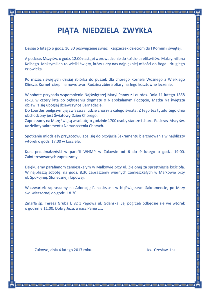 PIĄTA NIEDZIELA ZWYKŁA Dzisiaj 5 lutego o godz. 10.30 poświęcenie świec i książeczek dzieciom do I Komunii świętej. A podczas Mszy św. o godz. 12.00 nastąpi wprowadzenie do kościoła relikwii św. Maksymiliana Kolbego. Maksymilian to wielki święty, który uczy nas najpiękniej miłości do Boga i drugiego człowieka. Po mszach świętych dzisiaj zbiórka do puszek dla chorego Kornela Woźnego z Wielkiego Klincza. Kornel cierpi na nowotwór. Rodzina zbiera ofiary na Jego kosztowne leczenie. W sobotę przypada wspomnienie Najświętszej Maryi Panny z Lourdes. Dnia 11 lutego 1858 roku, w cztery lata po ogłoszeniu dogmatu o Niepokalanym Poczęciu, Matka Najświętsza objawiła się ubogiej dziewczynce Bernadecie. Do Lourdes pielgrzymują zwłaszcza ludzie chorzy z całego świata. Z tego też tytułu tego dnia obchodzony jest Światowy Dzień Chorego. Zapraszamy na Mszę świętą w sobotę o godzinie 1700 osoby starsze i chore. Podczas Mszy św. udzielimy sakramentu Namaszczenia Chorych. Spotkanie młodzieży przygotowującej się do przyjęcia Sakramentu bierzmowania w najbliższy wtorek o godz. 17.00 w kościele. Kurs przedmałżeński w parafii WNMP w Żukowie od 6 do 9 lutego o godz. 19.00. Zainteresowanych zapraszamy Dziękujemy parafianom zamieszkałym w Małkowie przy ul. Zielonej za sprzątnięcie kościoła. W najbliższą sobotę, na godz. 8.30 zapraszamy wiernych zamieszkałych w Małkowie przy ul. Spokojnej, Słonecznej i Lipowej. W czwartek zapraszamy na Adorację Pana Jezusa w Najświętszym Sakramencie, po Mszy św. wieczornej do godz. 18.30. Zmarła śp. Teresa Gruba l. 82 z Pępowa ul. Gdańska. Jej pogrzeb odbędzie się we wtorek o godzinie 11.00. Dobry Jezu, a nasz Panie ….. Żukowo, dnia 4 lutego 2017 roku. Ks. Czesław Las