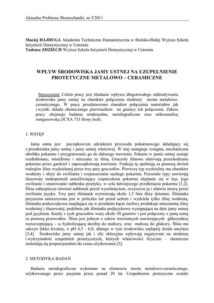 Aktualne Problemy Biomechaniki, nr 5/2011 Maciej HAJDUGA Akademia Techniczno Humanistyczna w Bielsku-Białej Wyższa Szkoła Inżynierii Dentystycznej w Ustroniu Tadeusz ZDZIECH Wyższa Szkoła Inżynierii Dentystycznej w Ustroniu WPŁYW ŚRODOWISKA JAMY USTNEJ NA UZUPEŁNIENIE PROTETYCZNE METALOWO – CERAMICZNE Streszczenie Celem pracy jest zbadanie wpływu długotrwałego oddziaływania środowiska jamy ustnej na charakter połączenia struktury mostu metalowoceramicznego. W pracy przedstawiono charakter połączenia materiałów jak i wyniki składu chemicznego pierwiastków na granicy ich połączenia. Zakres pracy obejmuje badania strukturalne, metalograficzne oraz mikroanalizę rentgenowską (JCXA 733 firmy Jeol). 1. WSTĘP Jama ustna jest początkowym odcinkiem przewodu pokarmowego składający się z przedsionka jamy ustnej i jamy ustnej właściwej. W niej następuje wstępna, mechaniczna obróbka pokarmu i przygotowanie go do dalszego trawienia. Pokarm w jamie ustnej zostaje rozdrabniany, miażdżony i mieszany ze śliną. Gruczoły ślinowe ułatwiają przechodzenie pokarmu przez gardziel i zapoczątkowują trawienie. Funkcję tę spełniają za pomocą dwóch rodzajów śliny wydzielanej przez trzy pary gruczołów. Pierwszy typ wydzieliny ma charakter wodnisty i służy do zwilżania i rozpuszczania suchego pokarmu. Pozostałe typy zawierają śluzowaty mukoproteid umożliwiający cząsteczkom pokarmu zlepianie się w kęs, jego zwilżanie i smarowanie nabłonka przełyku, w celu łatwiejszego przełknięcia pokarmu [1,2]. Ślina zabezpiecza również nabłonek przed wyschnięciem, oczyszcza ją i ułatwia mowę przez zwilżanie języka. Trzy pary ślinianek wytwarzają około 1,5 litra śliny dziennie. Ślinianka przyuszna umieszczona jest w policzku tuż przed uchem i wydziela tylko ślinę wodnistą, ślinianka podszczękowa znajdująca się w przednim kącie żuchwy produkuje mieszaninę śliny wodnistej i śluzowatej, podobnie jak ślinianka podjęzykowa występująca na dnie jamy ustnej pod językiem. Każdy z tych gruczołów waży około 30 gramów i jest połączony z jamą ustną za pomocą przewodów. Ślina jest jednym z soków trawiennych zawierających glikozydazę rozszczepiającą hydrolizującą skrobię do maltozy, oraz maltozę do glukozy. Ślina ma odczyn lekko kwaśny, o pH 6,5 - 6,8, dlatego w tym środowisku najlepiej działa amylaza [3,4]. Środowisko jamy ustnej jak i siły okluzyjne wpływają negatywnie na strukturę i wytrzymałość uzupełnień protetycznych, których właściwości fizyczno – chemiczne zmieniają się proporcjonalnie do czasu użytkowania [5]. 2. METODYKA BADAŃ Badania metalograficzne wykonano na elemencie mostu metalowo-ceramicznego, użytkowanego przez pacjenta przez ponad 20 lat. Uzupełnienie protetyczne zostało 46 M. Hajduga, T. Zdziech wymienione na nowe, ze względu na zaniki filarowych. 3. przyzębia - obnażanie się korzeni zębów MATERIAŁY PRZEZNACZONE DO BADAŃ 3.1. Materiał ceramiczny Badaniu został poddany materiał ceramicznym o nazwie VMK 68 napalony na konstrukcję metalową ponad 20 lat temu. Porcelana ta została wprowadzona na rynek w 1963 rok przez firmę VITA Zahnfabrik. Most metalowo ceramiczny przedstawia rysunek 1, a odciętą koronę przeznaczoną do analizy metalograficznej pokazano na rysunku 2. Rys.1. Most metalowo-ceramiczny Rys. 2. Korona przeznaczona do badań 3. 2. Materiał metaliczny Materiałem metalicznym jest stop nieszlachetny chromowo-niklowy, o nieznanej nazwie ani wytwórcy. 4. WYNIKI BADAŃ METALOGRAFICZNYCH Rozkład powierzchniowy poszczególnych pierwiastków występujących w warstwie metal ceramika próbki przedstawiono na rysunku 3 i 8 – strona licowa zęba. Analizowane punkty Wpływ środowiska jamy ustnej… 47 znajdują się w części ceramicznej próbki rys. 2. Zaobserwowano mikrorozszczelnienia i niejednorodne cienie w warstwach ceramiki. Procentową zawartość analizowanych pierwiastków dla przekroju próbki zestawiono w tabeli 1. Rys. 3. Struktura na granicy metal-ceramika, strona licowa zęba. Pow. 400x. Załączone widma energodyspersyjnego (EDS) z analizowanych miejsc dla punktów 7, 9, 10, 11 korony, zamieszczono na rysunku 4 – 7. Rys. 4. Widmo EDS, punktu 7 5 μm od granicy Rys.5. Widmo EDS, punkt 9 20 μm od granicy 48 M. Hajduga, T. Zdziech Tabela 1. Procentowa zawartość analizowanych pierwiastków dla mostu metal-ceramika. Analizowany pierwiastek O Na Al Si Ba Ca K Zr Cr Ni Zn 7 60,76 1,26 6,14 19,67 0,28 0,71 7,14 3,03 0,08 0,03 0,34 Miejsca analizy 9 10 Zawartość wg [%] 60,43 60,07 3,47 3,55 2,38 6,67 11,96 19,96 0,28 0,11 0,92 0,51 2,47 6,91 17,72 2,07 0,00 0,00 0,20 0,15 0,00 0,00 11 60,08 7,75 3,68 16,58 0,21 1,19 3,26 7,25 0,00 0,00 0,00 Rys. 8. Struktura materiału ceramicznego, strona licowa zęba. Pow. 400x. Załączone widma energodyspersyjnego (EDS) z zaznaczonych punktów 3, 11, 14 od strony policzkowej korony, zamieszczono na rys. 9 – 12. Natomiast od strony podniebiennej na rysunku 12. Rys.9. Widmo EDS, punkt 5, 5 μm od granicy pomiędzy warstwami Rys. 10. Widmo EDS, punkt 8 10 μm od granicy metalu Wpływ środowiska jamy ustnej… 49 Rys. 11. Widmo EDS punktu 11 30 μm w drugiej warstwie Rys. 12. Widmo EDS punktu 12 50 μm w drugiej warstwie Procentową zawartość analizowanych pierwiastków dla przekroju próbki materiału ceramicznego przedstawiono w tabeli 2. Tabela 2. Procentowa zawartość analizowanych pierwiastków dla materiału ceramicznego. Analizowany pierwiastek 5 O Na Al Si Ba Ca K Zr Cr Fe Zn Mg 60,69 6,38 6,30 22,75 0,28 0,85 2,72 0,04 0,00 0,00 0,00 0,00 Miejsca analizy 7 11 Zawartość wg [%] 61,61 6,10 3,77 4,46 5,99 13,04 16,34 11,94 0,04 0,11 0,28 0,00 4,14 2,82 7,84 4,84 0,00 0,67 0,00 0,42 0,00 1,03 0,00 0,57 12 60,18 2,65 7,26 20,36 0,10 0,33 6,54 2,34 0,00 0,12 0,00 0,11 Rysunek 13 przedstawia rozkład powierzchniowy poszczególnych pierwiastków występujących w warstwie ceramiki - strona styczna w mi