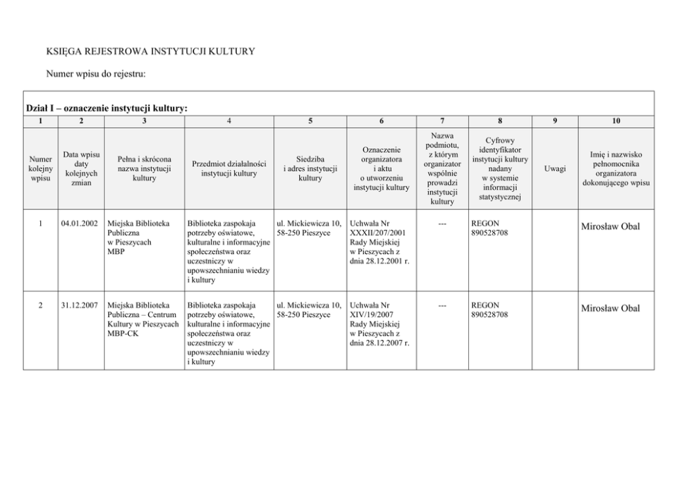 KSIĘGA REJESTROWA INSTYTUCJI KULTURY Numer wpisu do rejestru: Dział I – oznaczenie instytucji kultury: 1 2 3 4 5 6 7 8 Oznaczenie organizatora i aktu o utworzeniu instytucji kultury Nazwa podmiotu, z którym organizator wspólnie prowadzi instytucji kultury Cyfrowy identyfikator instytucji kultury nadany w systemie informacji statystycznej 9 10 Uwagi Imię i nazwisko pełnomocnika organizatora dokonującego wpisu Numer kolejny wpisu Data wpisu daty kolejnych zmian Pełna i skrócona nazwa instytucji kultury 1 04.01.2002 Miejska Biblioteka Publiczna w Pieszycach MBP Biblioteka zaspokaja ul. Mickiewicza 10, potrzeby oświatowe, 58-250 Pieszyce kulturalne i informacyjne społeczeństwa oraz uczestniczy w upowszechnianiu wiedzy i kultury Uchwała Nr XXXII/207/2001 Rady Miejskiej w Pieszycach z dnia 28.12.2001 r. --- REGON 890528708 Mirosław Obal 2 31.12.2007 Miejska Biblioteka Publiczna – Centrum Kultury w Pieszycach MBP-CK Biblioteka zaspokaja ul. Mickiewicza 10, potrzeby oświatowe, 58-250 Pieszyce kulturalne i informacyjne społeczeństwa oraz uczestniczy w upowszechnianiu wiedzy i kultury Uchwała Nr XIV/19/2007 Rady Miejskiej w Pieszycach z dnia 28.12.2007 r. --- REGON 890528708 Mirosław Obal Przedmiot działalności instytucji kultury Siedziba i adres instytucji kultury Dział II – Organizacja instytucji kultury 1 Numer kolejny wpisu 1 2 4 2 Data wpisu daty kolejnych zmian 04.01.2002 r. 3 Informacja o złożeniu do rejestru statutu Statut Miejskiej Biblioteki Publicznej załącznik do Uchwały nr XXXII/207/2001 Rady Miejskiej w Pieszycach z dnia 28.12.2001 r. 08.08.2007 r. 31.12.2007 r. Statut Miejskiej Biblioteki Publicznej – Centrum Kultury załącznik do Uchwały nr XIV/93/2007 Rady Miejskiej w Pieszycach z dnia 28 grudnia 2007r. 4 5 6 7 8 Imię i nazwisko dyrektora instytucji kultury i jego następców lub oznaczenie osoby fizycznej lub prawnej której powierzono zarządzanie instytucją kultury Imiona i nazwiska pełnomocników do instytucji kultury uprawnionych do dokonywania czynności prawnych w imieniu o instytucji oraz zakres ich uprawnień Nazwa oraz siedziba wyodrębnionych jednostek organizacyjnych instytucji kultury ich cyfrowe identyfikatory nadane w systemie informacji statystycznej Uwagi Imię i nazwisko pełnomocnika organizatora dokonującego wpisu Marianna Konieczna-Marjan do dnia 31.07.2007 r. (przejście na emeryturę) Miejska Biblioteka Publiczna w Pieszycach ul. Mickiewicza 10, 58-250 Pieszyce REGON 890528708 Lidia Zakrzewska-Strózik od dnia 01.08.2007 r. Miejska Biblioteka Publiczna w Pieszycach ul. Mickiewicza 10, 58-250 Pieszyce REGON 890528708 Miejska Biblioteka Publiczna – Centrum Kultury w Pieszycach ul. Mickiewicza 10, 58-250 Pieszyce REGON 890528708 Anna Wojtal główna księgowa Mirosław Obal Mirosław Obal Mirosław Obal Dział III – Mienie instytucji kultury: 1 2 3 Numer kolejny wpisu Data wpisu daty kolejnych zmian Informacja o złożeniu do rejestru rocznego sprawozdania finansowego 4 Informacja o obciążeniu środków trwałych instytucji kultury ograniczonymi prawami rzeczowymi 5 6 Uwagi Imię i nazwisko pełnomocnika organizatora dokonującego wpisu 1 29.03.2002 r. Bilans za 2001 r. --- Mirosław Obal 2 18.03.2003 r. Bilans za 2002 r. --- Mirosław Obal 3 25.03.2004 r. Bilans za 2003 r. --- Mirosław Obal 4 23.03.2005 r. Bilans za 2004 r. --- Mirosław Obal 5 30.032006 r. Bilans za 2005 r. --- Mirosław Obal 6 21.03.2007 r. Bilans za 2006 r. --- Mirosław Obal 7 24.04.2008 r. Bilans za 2007 r. --- Mirosław Obal 8 30.03.2009 r. Bilans za 2008 r. --- Mirosław Obal 9 16.06.2010 r. Bilans za 2009 r. --- Mirosław Obal 10 28.04.2011 r. Bilans za 2010 r. --- Mirosław Obal Dział III – Mienie instytucji kultury: 1 2 Numer kolejny wpisu Data wpisu daty kolejnych zmian 3 4 5 6 Informacja o złożeniu do rejestru rocznego sprawozdania finansowego Informacja o obciążeniu środków trwałych instytucji kultury ograniczonymi prawami rzeczowymi Uwagi Imię i nazwisko pełnomocnika organizatora dokonującego wpisu 11 26.04.2012 r. Bilans za 2011 r. --- Mirosław Obal 12 25.04.2013 r. Bilans za 2012 r. --- Mirosław Obal Dział IV – Połączenie, podział i likwidacja instytucji kultury: 1 2 3 4 5 Numer kolejny wpisu Data wpisu daty kolejnych zmian Informacja o połączeniu, podziale lub likwidacji instytucji kultury Imię i nazwisko likwidatora Uwagi --- --- --- --- 6 Imię i nazwisko pełnomocnika organizatora dokonującego wpisu Mirosław Obal