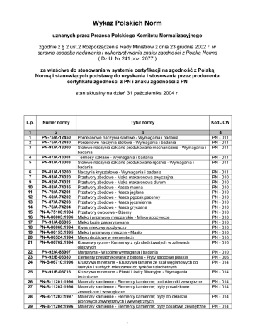 Wykaz Polskich Norm uznanych przez Prezesa Polskiego Komitetu Normalizacyjnego zgodnie z § 2 ust.2 Rozporządzenia Rady Ministrów z dnia 23 grudnia 2002 r. w sprawie sposobu nadawania i wykorzystywania znaku zgodności z Polską Normą ( Dz.U. Nr 241 poz. 2077 ) za właściwe do stosowania w systemie certyfikacji na zgodność z Polską Normą i stanowiących podstawę do uzyskania i stosowania przez producenta certyfikatu zgodności z PN i znaku zgodności z PN stan aktualny na dzień 31 października 2004 r. L.p. Numer normy Tytuł normy Kod JCW 1 1 2 3 2 PN-75/A-12450 PN-75/A-12480 PN-91/A-13000 4 PN - 011 PN - 011 PN - 011 4 5 PN-87/A-13001 PN-91/A-13003 6 7 9 10 11 12 13 14 15 16 17 18 19 20 21 PN-81/A-13200 PN-93/A-74020 PN-92/A-74021 PN-88/A-74036 PN-79/A-74201 PN-60/A-74202 PN-87/A-74203 PN-76/A-74204 PN-A-75100:1994 PN-A-86003:1996 PN-91/A-86005 PN-A-86060:1994 PN-A-86155:1995 PN-A-86524:1994 PN-A-86762:1994 22 23 24 PN-92/A-86907 PN-92/B-03380 PN-B-06710:1996 25 PN-91/B-06716 26 27 PN-B-11201:1996 PN-B-11202:1996 28 PN-B-11203:1997 29 PN-B-11204:1996 3 Porcelanowe naczynia stołowe - Wymagania i badania Porcelitowe naczynia stołowe - Wymagania i badania Stołowe naczynia szklane produkowane mechanicznie - Wymagania i badania Termosy szklane - Wymagania i badania Stołowe naczynia szklane produkowane ręcznie - Wymagania i badania Naczynia kryształowe - Wymagania i badania Przetwory zbożowe - Mąka makaronowa zwyczajna Przetwory zbożowe - Mąka makaronowa durum Przetwory zbożowe - Kasza manna Przetwory zbożowe - Kasza jaglana Przetwory zbożowe - Kasza pęczak pszenny Przetwory zbożowe - Kasza jęczmienna Przetwory zbożowe - Kasza gryczana Przetwory owocowe - Dżemy Mleko i przetwory mleczarskie - Mleko spożywcze Mleko kozie pasteryzowane Kwas mlekowy spożywczy Mleko i przetwory mleczne - Masło Mięso drobiowe w elementach Konserwy rybne - Konserwy z ryb śledziowatych w zalewach olejowych Margaryna - Wspólne wymagania i badania Elementy prefabrykowane z betonu - Płyty stropowe płaskie Kruszywa mineralne - Kruszywa łamane ze skał węglanowych do lastryko i suchych mieszanek do tynków szlachetnych Kruszywa mineralne - Piaski i żwiry filtracyjne - Wymagania techniczne Materiały kamienne - Elementy kamienne; podokienniki zewnętrzne Materiały kamienne - Elementy kamienne; płyty posadzkowe zewnętrzne i wewnętrzne Materiały kamienne - Elementy kamienne; płyty do okładzin pionowych zewnętrznych i wewnętrznych Materiały kamienne - Elementy kamienne; płyty cokołowe zewnętrzne 1 PN - 011 PN - 011 PN - 011 PN - 010 PN - 010 PN - 010 PN - 010 PN - 010 PN - 010 PN - 010 PN - 010 PN - 010 PN - 010 PN - 010 PN - 010 PN - 010 PN - 010 PN - 010 PN - 005 PN - 014 PN - 014 PN - 014 PN - 014 PN - 014 PN - 014 1 30 2 PN-B-11205:1996 3 Materiały kamienne - Elementy kamienne; stopnie monolityczne i okładzina stopni Materiały kamienne - Elementy kamienne; podokienniki wewnętrzne Materiały kamienne - Elementy kamienne; płyty posadzkowe z odpadów kamiennych Materiały kamienne - Kamień łamany Materiały kamienne - Elementy kamienne; płyty z konglomeratów kamiennych Materiały kamienne - Elementy kamienne; krawężniki uliczne, mostowe i drogowe Wyroby budowlane ceramiczne - Cegły dziurawki Wyroby budowlane ceramiczne - Pustaki stropowe ACKERMANA 4 PN - 014 31 32 PN-B-11206:1996 PN-B-11208:1996 33 34 PN-B-11210:1996 PN-B-11212:1997 35 PN-B-11213:1997 36 37 PN-B-12002:1997 PN-B-12005:1996 38 PN-B-12006:1997 PN - 008 PN-B-12007:1997 Wyroby budowlane ceramiczne - Pustaki do przewodów wentylacyjnych Wyroby budowlane ceramiczne - Pustaki do przewodów dymowych 39 40 PN-B-12008:1996 Wyroby budowlane ceramiczne - Cegły klinkierowe budowlane PN - 008 41 42 43 44 PN-B-12011:1997 PN-B-12050:1996 PN-B-12051:1996 PN-B-12054:1996 PN - 008 PN - 008 PN - 008 PN - 008 45 PN-B-12055:1996 Wyroby budowlane ceramiczne - Cegły kratówki Wyroby budowlane ceramiczne - Cegły budowlane Wyroby budowlane ceramiczne - Cegły modularne Wyroby budowlane silikatowe - Kształtki ścienne, pustaki wentylacyjne, pustaki ogrodzeniowe Wyroby budowlane ceramiczne - Pustaki ścienne modularne 46 PN-B-12057:1996 Wyroby budowlane ceramiczne - Pustaki do ścian działowych PN - 008 47 PN-B-12058:1997 Wyroby budowlane ceramiczne - Płytki elewacyjne PN - 008 48 49 50 51 52 53 PN-B-12059:1996 PN-B-12061:1997 PN-B-12062:1997 PN-B-12066:1998 PN-B-12067:1999 PN-B-12069:1998 PN - 008 PN - 008 PN - 008 PN - 008 PN - 008 PN - 008 54 55 PN-76/B-13074 PN-75/B-13078 56 57 PN-B-19502:1996 PN-B-19507:1997 58 59 PN-B-23003:1996 PN-B-23118:1997 60 PN-B-23119:1997 Wyroby budowlane ceramiczne - Pustaki stropowe DZ3 Wyroby budowlane ceramiczne - Cegły i kształtki elewacyjne Wyroby budowlane silikatowe - Elementy elewacyjne Wyroby budowlane silikatowe - Cegły, bloki, elementy Wyroby budowlane ceramiczne - Elementy ogrodzeniowe Wyroby budowlane ceramiczne - Cegły, pustaki, elementy poryzowane Szklo budowlane - Luksfery Szkło budowlane - Pustaki szklane - Wymagania, badania i wytyczne stosowania Prefabrykaty z betonu - Płyty żebrowe Prefabrykaty z betonu - Wielkowymiarowe elementy klatek schodowych Kruszywa mineralne - Łupkoporyt ze zwałów Wyroby do izolacji cieplnej w budownictwie - Otuliny z wełny mineralnej Welon z włókien szklanych 61 PN-B-24000:1997 Dyspersyjna masa asfaltowo-kauczukowa 62 PN-B-24002:1997 Asfaltowa emulsja anionowa 63 PN-B-24003:1997 Asfaltowa emulsja kationowa 64 PN-B-24004:1997 Masa asfaltowo-aluminiowa 65 PN-B-24005:1997 Asfaltowa masa zalewowa 2 PN - 014 PN - 014 PN - 014 PN - 014 PN - 014 PN - 008 PN - 008 PN - 008 PN - 008 PN - 011 PN - 011 PN - 005 PN - 005 PN - 014 PN - 008 PN - 015 PN - 008 PN - 015 PN - 008 PN - 015 PN - 008 PN - 015 PN - 008 PN - 015 PN - 008 PN - 015 PN - 008 PN - 015 1 66 2 PN-B-24006:1997 Masa asfaltowo-kauczukowa 67 PN-B-24008:1997 Masa uszczelniająca 68 PN-B-24620:1998 Lepiki, masy i roztwory asfaltowe stosowane na zimno 69 PN-B-24625:1998 70 PN-89