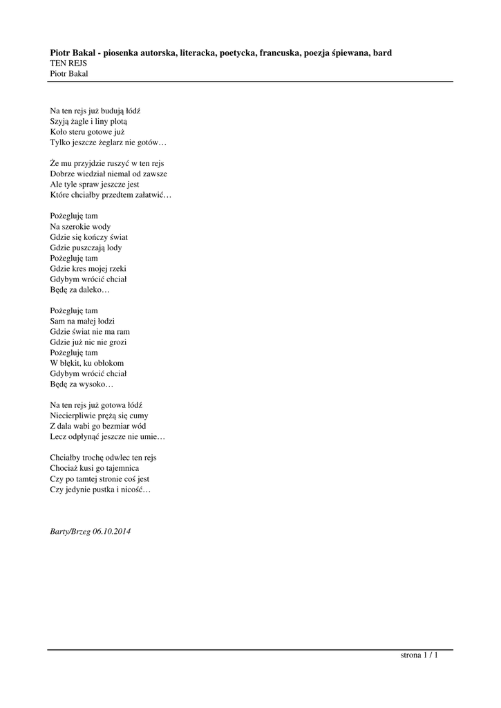 Piotr Bakal - piosenka autorska, literacka, poetycka, francuska, poezja śpiewana, bard TEN REJS Piotr Bakal Na ten rejs już budują łódź Szyją żagle i liny plotą Koło steru gotowe już Tylko jeszcze żeglarz nie gotów… Że mu przyjdzie ruszyć w ten rejs Dobrze wiedział niemal od zawsze Ale tyle spraw jeszcze jest Które chciałby przedtem załatwić… Pożegluję tam Na szerokie wody Gdzie się kończy świat Gdzie puszczają lody Pożegluję tam Gdzie kres mojej rzeki Gdybym wrócić chciał Będę za daleko… Pożegluję tam Sam na małej łodzi Gdzie świat nie ma ram Gdzie już nic nie grozi Pożegluję tam W błękit, ku obłokom Gdybym wrócić chciał Będę za wysoko… Na ten rejs już gotowa łódź Niecierpliwie prężą się cumy Z dala wabi go bezmiar wód Lecz odpłynąć jeszcze nie umie… Chciałby trochę odwlec ten rejs Chociaż kusi go tajemnica Czy po tamtej stronie coś jest Czy jedynie pustka i nicość… Barty/Brzeg 06.10.2014 strona 1 / 1