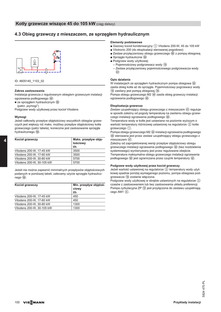 Kotły grzewcze wiszące 45 do 105 kW (ciąg dalszy) 4.3 Obieg grzewczy z mieszaczem, ze sprzęgłem hydraulicznym Elementy podstawowe ■ Gazowy kocioł kondensacyjny 1 Vitodens 200-W, 45 do 105 kW ■ Vitotronic 200 (do eksploatacji sterowanej pogodowo) ■ Zestaw przyłączeniowy obiegu grzewczego iP z pompą obiegową ■ Sprzęgło hydrauliczne tP ■ Podgrzew wody użytkowej: – Pojemnościowy podgrzewacz wody qP – Zestaw przyłączeniowy pojemnościowego podgrzewacza wody iQ ID: 4605140_1103_02 Zakres zastosowania Instalacja grzewcza z regulowanym obiegiem grzewczym instalacji ogrzewania podłogowego rP: ■ ze sprzęgłem hydraulicznym tP (patrz „wymogi”) Podgrzew wody użytkowej przez kocioł Vitodens Wymogi Jeżeli całkowity przepływ objętościowy wszystkich obiegów grzewczych jest większy niż maks. możliwy przepływ objętościowy kotła grzewczego (patrz tabela), konieczne jest zastosowanie sprzęgła hydraulicznego tP. Kocioł grzewczy Vitodens 200-W, 17-45 kW Vitodens 200-W, 17-60 kW Vitodens 200-W, 30-80 kW Vitodens 200-W, 30-105 kW Maks. przepływ objętościowy l/h 3500 3500 5700 5700 Jeżeli nie można zapewnić minimalnych przepływów objętościowych podanych w poniższej tabeli, zalecamy użycie sprzęgła hydraulicznego tP. Kocioł grzewczy Vitodens 200-W, 17-45 kW Vitodens 200-W, 17-60 kW Vitodens 200-W, 30-80 kW Vitodens 200-W, 30-105 kW Min. przepływ objętościowy l/h 450 450 1300 1300 Eksploatacja grzewcza Zestaw uzupełniający obiegu grzewczego z mieszaczem rQ reguluje w sposób zależny od pogody temperaturę na zasilaniu obiegu grzewczego instalacji ogrzewania podłogowego rP. Temperatura wody w kotle jest ustawiana na poziomie wyższym o wartość temperatury różnicowej ustawionej na regulatorze 2 kotła grzewczego 1. Pompa obiegu grzewczego M2 rR instalacji ogrzewania podłogowego rP sterowana jest przez zestaw uzupełniający obiegu grzewczego z mieszaczem rQ. Zależny od zaprojektowanej wersji przepływ objętościowy obiegu grzewczego instalacji ogrzewania podłogowego rP (bez rozdzielenia systemowego) wyrównywany jest przez regulowane obejście. Temperatura maksymalna obiegu grzewczego instalacji ogrzewania podłogowego rP jest ograniczana przez czujnik temperatury rW. Podgrzew wody użytkowej przez kocioł grzewczy Jeżeli wartość ustawionej na regulatorze 2 temperatury wody użytkowej spadnie poniżej wymaganego poziomu, pompa obiegowa podgrzewacza qZ zostanie włączona. Podgrzew wody użytkowej w obrębie ustawionych na regulatorze 2 czasów z zastosowaniem lub bez zastosowania układu preferencji. Pompa cyrkulacyjna ZP qW jest przyłączona do zestawu uzupełniającego AM1 6. 5824 470 PL 4 Opis działania W instalacjach ze sprzęgłem hydraulicznym pompa obiegowa tW zasila obieg kotła aż do sprzęgła. Pojemnościowy pogrzewacz wody qP zasilany jest pompą obiegową qZ. Pompa obiegu grzewczego M2 rR zasila obieg grzewczy instalacji ogrzewania podłogowego rP. 100 VIESMANN Przykłady instalacji Kotły grzewcze wiszące 45 do 105 kW (ciąg dalszy) Schemat instalacji hydraulicznej ID: 4605140_1103_02 40 42 --41/20-43 --41/2---41/20-- 44 --41/52-- WW 45 51 -2/X3- --2-- 50 1 11 --2/5-- --230V---52---20-- 41 16 52 --2/20-- --x/x-- -KM-Bus- 6 --40-- 7 --40A-- 4 5 --230V---28---96---20-- 2 80 -KM-Bus- 81 4 --40---A2-- 10 --5---X3---X3--KM-Bus- KW --KM-Bus-- 3 --2/X3-- 12 --6/A2-- Wskazówka: Niniejszy schemat jest przykładem podstawowej instalacji bez urządzeń odcinających i zabezpieczających. Nie zastępuje on fachowego projektu w miejscu montażu. Wskazówka W zależności od wyposażenia instalacji pompa obiegowa podgrzewacza UPSB qZ jest podłączana do wewnętrznego zestawu uzupełniającego H1 4/H2 5 lub zestawu uzupełniającego AM1 6. Wymagane urządzenia 5824 470 PL ID: 4605140_1103_02 Poz. Oznaczenie Kocioł grzewczy 1 wyposażony w Regulator pogodowy 2 Czujnik temperatury zewnętrznej ATS 3 Instalacja bez cyrkulacji: – Wewnętrzny zestaw uzupełniający H1 4 lub – Wewnętrzny zestaw uzupełniający H2 5 Instalacja z cyrkulacją: – Zestaw uzupełniający AM1 6 Zestaw uzupełniający EA1 7 Podgrzew wody użytkowej przez kocioł grzewczy 1 Pojemnościowy podgrzewacz wody qP Czujnik temperatury wody w podgrzewaczu STS qQ qW qZ Pompa cyrkulacyjna wody użytkowej ZP Pompa obiegowa podgrzewacza UPSB Przykłady instalacji Nr katalog. patrz cennik firmy Viessmann 7179 057 7179 144 7452 092 7452 091 patrz cennik firmy Viessmann Zakres dostawy zestawu przyłączeniowego iQ patrz cennik Vitoset VIESMANN 101 Kotły grzewcze wiszące 45 do 105 kW (ciąg dalszy) ID: 4605140_1103_02 Poz. Oznaczenie – 45 i 60 kW rP rQ rW rE rR rT tP tQ 4 tW zP zQ zW zE zR zT zZ zU zI uP Pompa obiegu grzewczego M2 i Mieszacz 3-drogowy lub Divicon (z mieszaczem 3-drogowym, pompą obiegu grzewczego, czujnikiem temperatury wody na zasilaniu i silnikiem mieszacza) Oddzielny silnik mieszacza Sprzęgło hydrauliczne – 45 i 60 kW – 80 i 105 kW Czujnik temperatury wody na zasilaniu sprzęgła hydraulicznego – 45 i 60 kW – 80 i 105 kW Pompa obiegowa Wyposażenie dodatkowe Zewnętrzny elektromagnetyczny zawór bezpieczeństwa gazu płynnego (wymagany wewnętrzny zestaw uzupełniający H1) Blokada wentylatora wywiewnego (wymagany wewnętrzny zestaw uzupełniający H2) Zbiorcze zgłaszanie usterek (wymagany zestaw uzupełniający EA1) Przełączanie z zewnątrz: – Blokowanie z zewnątrz – Blokowanie poprzez zbiorcze zgłaszanie usterek – Komunikaty o błędach – Krótkotrwała eksploatacja pompy cyrkulacyjnej wody użytkowej – Zapotrzebowanie z zewnątrz – Przełączanie programu roboczego z zewnątrz (tylko przy regulacji pogodowej) Zewnętrzna wartość wymagana 0 do 10 V (wymagany zestaw uzupełniający EA1) Vitotrol 200A (odbiornik magistrali KM) Vitotrol 300A (odbiornik magistrali KM) Odbiornik sygnałów radiowych Rozdzielacz magistrali KM, w przypadku kilku odbiorników magistrali KM Odbiorniki magistrali KM: – Zestaw uzupeł