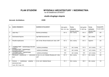 PLAN STUDIÓW WYDZIAŁU ARCHITEKTURY I WZORNICTWA na rok akademicki 2016/2017 studia drugiego stopnia I ROK kierunek: Architektura Lp NAZWISKO WYKŁADOWCY NAZWA PRZEDMIOTU 1/ 1. Język obcy Wybrany prowadzący 2. Wychowanie fizyczne Ilość godzin Forma Ilość godzin Forma Punkty ECTS Sem. zim./ tyg. zaliczenia S. letni/ tyg. zaliczenia S. zim/ s.letni 30 / 2 mgr Rafał Nuckowski inst. - 3. Filozofia współczesna 4. I KONSULTANT – reprezentujący kierunek 2/ studiów II KONSULTANT – reprezentujący 3/ dyscyplinę pokrewną III KONSULTANT – reprezentujący 4/ dyscyplinę pokrewną Planowanie przestrzenne z elementami 5. 6. 7. teorii 8. Ochrona Semestr zimowy Zal. z oceną 30 / 2 Semestr letni Egzamin 2/2 30/2 Żal. z oceną 0/1 30 / 2 Egzamin 2/2 Zal. z oceną prof. dr hab. Roman Kubicki prof. ndzw. UAP 30 / 2 - wybrany prowadzący 75 / 5 zal. z oceną 75 / 5 zal. z oceną 7/7 - wybrany prowadzący 15/1 zal. z oceną 15/1 zal. z oceną 1/1 - wybrany prowadzący 15/1 zal. z oceną 15/1 zal. z oceną 1/1 dr hab. inż. arch. Elżbieta Raszeja prof. ndzw. 45 / 3 Zal. z oceną 45 / 3 Zal. z oceną 2/2 15 / 1 Zal. z oceną 30/ 2 Zal. z oceną 1/2 UAP i rewitalizacja elementami teorii I sem. (W), II sem. (Ć) zabytków z dr inż. arch. Gabriela Klause 9. Projektowanie detalu z elementami teorii mgr Miron Regulski wykł. 30 / 2 Zal. z oceną 30 / 2 Zal. z oceną 3/2 10. Projektowanie wnętrz prof. dr hab. Janusz Stankowski prof. zw. 30 / 2 Zal. z oceną 30 / 2 Zal. z oceną 3/3 UAP dr hab. Marta Węcławska-Lipowicz prof. ndzw. UAP prof. dr hab. Józef Jurek prof. zw. UAP dr Maciej Basałygo ad. prof. dr hab. Eugeniusz Matejko prof. ndzw. UAP dr hab. Piotr Machowiak prof. ndzw. UAP dr hab. Konstancja Pleskaczyńska prof. ndzw. UAP dr Szymon Nawój ad. 11. Rysunek Wybór konsultanta 45/ 3 Zal. z oceną 45/3 Zal. z oceną 3/3 12. Wykłady monograficzne dr Justyna Ryczek ad. sem. zimowy 30 / 2 Zal. z oceną 30 / 2 Zal. z oceną 2/2 Sztuka i architektura współczesna vacat sem. letni Teoria architektury dr hab. inż. arch. Teresa Bardzińska-Bonenberg 30 / 2 Zal. z oceną 30 / 2 Egzamin 2/1 30 / 2 Zal. z oceną 30 / 2 Zal. z oceną 1/1 14. prof. ndzw. UAP 15. Nowoczesne technologie i konstrukcje w mgr inż. arch. Andrzej Kurzawski st. wykł. obiektach budowlanych 30 / 30 Ad.1. Język obcy – do wyboru: Język angielski - mgr Anna Łosińska st. wykł. - mgr J. Kalinowska-Kuchno, st. wykł. - mgr Leszek Ratajczak - mgr Ewa Tomaszewska Język francuski - mgr D. Ryglewicz st. wykł. Język niemiecki - dr P. Wałowski wykł Ad.2. PIERWSZY KONSULTANT– reprezentujący kierunek studiów do wyboru z listy konsultantów z Katedry Architektury i Urbanistyki prof. dr hab. inż. arch. W. Bonenberg prof. ndzw. UAP dr hab. inż. arch. W. Wawrzyniak prof. ndzw. UAP/ p.o Kier. dr inż. arch. Tomasz Piwiński ad. dr hab. inż. arch. S. Sipiński prof. ndzw. UAP dr hab.inż. arch. E. Skrzypczak prof. ndzw. UAP mgr inż. arch. A. Kurzawski st. wykł./p.o Kier. mgr inż. arch. Hugon Kowalski as. dr hab. inż. arch. Elżbieta Raszeja prof. ndzw. UAP Ad.3. DRUGI KONSULTANT– reprezentujący kierunek studiów lub dyscyplinę pokrewną - do wyboru spośród: wszystkich Katedr Wydziału Architektury i Wzornictwa: dr hab. Joanna Barańska-Woźny prof. ndzw. UAP dr hab.inż arch. Elżbieta Raszeja prof. nadzw. UAP prof. dr hab. Wojciech Hora, prof.zw.UAP prof. dr hab. Katarzyna Jeziorkowska, prof. ndzw. UAP prof. dr hab. Bogumiła Jung, prof. zw. UAP dr hab. Dariusz Kuźma, prof. nadzw. UAP prof. dr hab. Katarzyna Laskowska, prof. nadzw. UAP prof. dr hab. Marek Owsian, prof. zw. UAP dr hab. inż arch. Stanisław Sipiński prof.ndzw. UAP dr hab. Piotr Szwiec, prof. nadzw. UAP prof. dr hab. Ewa Twarowska-Sioda, prof. zw. UAP prof. dr hab. Jolanta Usarewicz-Owsian, prof. zw. UAP prof. dr hab. Andrzej Wielgosz, prof. zw.UAP dr hab. Marzena Wolińska, prof. nadzw. UAP dr hab. inż. arch. Eugeniusz Skrzypczak, prof. ndzw. UAP dr hab. inż. arch. Bardzinska-Bonenberg Teresa prof. ndzw. UAP dr hab. Sławoj Dreszer prof. ndzw. UAP dr hab. Izabela Idzikowska-Bzdręga prof. ndzw. UAP dr hab. Jacek Mikołajczak prof. ndzw. UAP dr hab. Agnieszka Meller Kawa prof. ndzw. UAP prof. dr hab. inż. arch. W. Bonenberg prof. ndzw. UAP dr Mateusz Wróblewski ad. dr Miron Regulski ad. dr inż. arch. Michał Ankiersztajn ad. dr Paweł Buszko ad. (urlop) dr Marcin Konicki ad. dr Karolina Tylka-Tomczyk ad. dr Magdalena Grenda ad. dr Łukasz Stawarski ad. dr Michał Filipiak ad. dr Piotr Kęska ad. dr Dorota Januszek – Krakowska ad. dr inż. arch. Tomasz Piwiński ad. dr inż. arch. Natalia Regimowicz ad. Ad.4. TRZECI KONSULTANT – reprezentujący dyscyplinę pokrewną lub artystyczną – do wyboru spośród wszystkich Katedr Wydziału Architektury i Wzornictwa oraz innych całej Uczelni, reprezentujących dyscyplinę artystyczną (oprócz rysunku) albo techniczną. Musi to być Pracownik Uczelni, posiadający tytuł profesora lub stopień dr hab., tytuł niższy (za zgodą Rady Wydziału A i W). Ad.5 Rysunek - do wyboru z Katedry Rysunku, posiadający tytuł profesora lub stopień dr hab. Wyboru drugiego i trzeciego konsultanta student dokonuje za zgodą i w porozumieniu z konsultantem głównym. Po uzgodnieniu z I Konsultantem dopuszcza się prowadzenie niezależnych tematów semestralnych (rocznych) z II i III konsultantem. Student z I Konsultantem wybiera Konsultanta II i III. Student zobowiązany jest do minimum 5 konsultacji w semestrze z każdym z konsultantów. PLAN STUDIÓW WYDZIAŁU ARCHITEKTURY I WZORNICTWA na rok akademicki 2016/2017 studia drugiego stopnia II ROK kierunek: Architektura Lp NAZWISKO WYKŁADOWCY NAZWA PRZEDMIOTU 1/ 1. Fakultet 2. I KONSULTANT – reprezentujący kierunek 2/ studiów II KONSULTANT – reprezentujący dyscyplinę 3/ pokrewną III KONSULTANT – reprezentujący dyscyplinę 4/ pokrewną Nowoczesne technologie i konstrukcje w 3. 4. 5. Ilość godzin Forma Ilość godzin Forma Punkty ECTS Sem. zim./