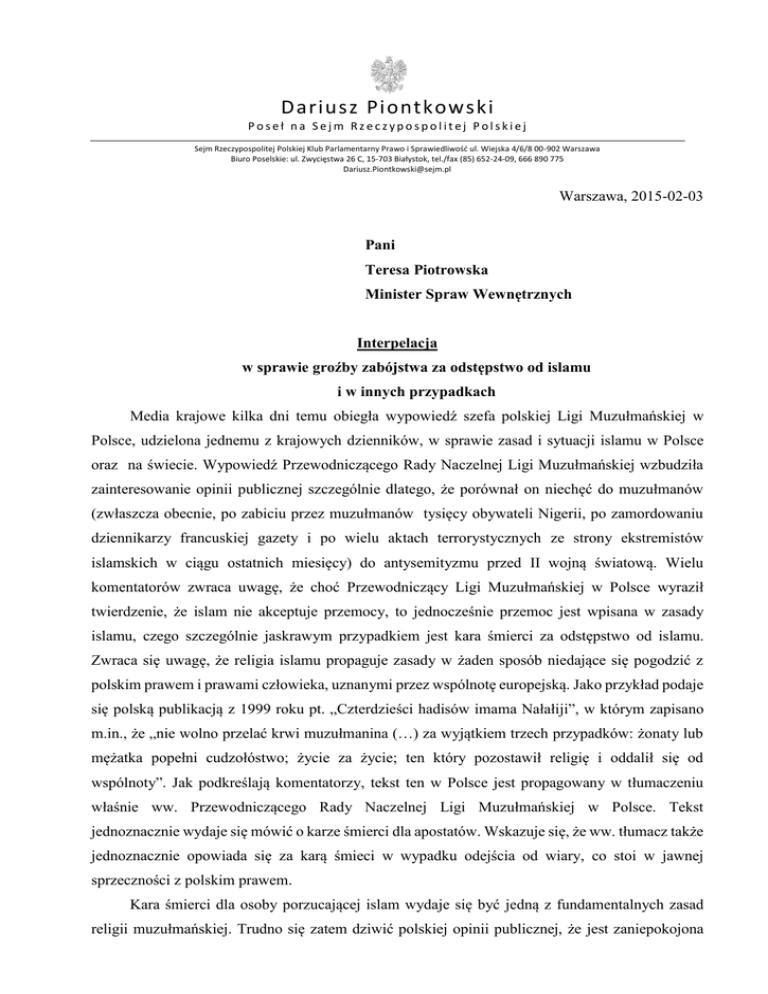 Dariusz Piontkowski Poseł na Sejm Rzeczypospolitej Polskiej Sejm Rzeczypospolitej Polskiej Klub Parlamentarny Prawo i Sprawiedliwość ul. Wiejska 4/6/8 00-902 Warszawa Biuro Poselskie: ul. Zwycięstwa 26 C, 15-703 Białystok, tel./fax (85) 652-24-09, 666 890 775 [email protected] Warszawa, 2015-02-03 Pani Teresa Piotrowska Minister Spraw Wewnętrznych Interpelacja w sprawie groźby zabójstwa za odstępstwo od islamu i w innych przypadkach Media krajowe kilka dni temu obiegła wypowiedź szefa polskiej Ligi Muzułmańskiej w Polsce, udzielona jednemu z krajowych dzienników, w sprawie zasad i sytuacji islamu w Polsce oraz na świecie. Wypowiedź Przewodniczącego Rady Naczelnej Ligi Muzułmańskiej wzbudziła zainteresowanie opinii publicznej szczególnie dlatego, że porównał on niechęć do muzułmanów (zwłaszcza obecnie, po zabiciu przez muzułmanów tysięcy obywateli Nigerii, po zamordowaniu dziennikarzy francuskiej gazety i po wielu aktach terrorystycznych ze strony ekstremistów islamskich w ciągu ostatnich miesięcy) do antysemityzmu przed II wojną światową. Wielu komentatorów zwraca uwagę, że choć Przewodniczący Ligi Muzułmańskiej w Polsce wyraził twierdzenie, że islam nie akceptuje przemocy, to jednocześnie przemoc jest wpisana w zasady islamu, czego szczególnie jaskrawym przypadkiem jest kara śmierci za odstępstwo od islamu. Zwraca się uwagę, że religia islamu propaguje zasady w żaden sposób niedające się pogodzić z polskim prawem i prawami człowieka, uznanymi przez wspólnotę europejską. Jako przykład podaje się polską publikacją z 1999 roku pt. „Czterdzieści hadisów imama Nałałiji”, w którym zapisano m.in., że „nie wolno przelać krwi muzułmanina (…) za wyjątkiem trzech przypadków: żonaty lub mężatka popełni cudzołóstwo; życie za życie; ten który pozostawił religię i oddalił się od wspólnoty”. Jak podkreślają komentatorzy, tekst ten w Polsce jest propagowany w tłumaczeniu właśnie ww. Przewodniczącego Rady Naczelnej Ligi Muzułmańskiej w Polsce. Tekst jednoznacznie wydaje się mówić o karze śmierci dla apostatów. Wskazuje się, że ww. tłumacz także jednoznacznie opowiada się za karą śmieci w wypadku odejścia od wiary, co stoi w jawnej sprzeczności z polskim prawem. Kara śmierci dla osoby porzucającej islam wydaje się być jedną z fundamentalnych zasad religii muzułmańskiej. Trudno się zatem dziwić polskiej opinii publicznej, że jest zaniepokojona Dariusz Piontkowski Poseł na Sejm Rzeczypospolitej Polskiej Sejm Rzeczypospolitej Polskiej Klub Parlamentarny Prawo i Sprawiedliwość ul. Wiejska 4/6/8 00-902 Warszawa Biuro Poselskie: ul. Zwycięstwa 26 C, 15-703 Białystok, tel./fax (85) 652-24-09, 666 890 775 [email protected] głoszeniem tej i podobnych zasad. Godnym uznania (choć trudno wyobrazić sobie, aby inne były oficjalne deklaracje) jest, że władze organizacji muzułmańskich odcinają się od islamskich terrorystów, jednak niepokoi, że w pewnych sytuacjach przemoc akceptują, aż po zabójstwo, w dodatku w sytuacji tak bardzo osobistego wyboru, jakim jest wybór i praktykowanie wiary. Komentatorzy zwracają uwagę, że głoszenie kary zabójstwa za odstępstwo od wiary stanowi groźbę karalną z art. 190 Kodeksu karnego („Kto grozi innej osobie popełnieniem przestępstwa na jej szkodę lub szkodę osoby najbliższej, jeżeli groźba wzbudza w zagrożonym uzasadnioną obawę, że będzie spełniona, podlega grzywnie, karze ograniczenia wolności albo pozbawienia wolności do lat 2”) oraz jest łamaniem art. 194 KK („Kto ogranicza człowieka w przysługujących mu prawach ze względu na jego przynależność wyznaniową albo bezwyznaniowość, podlega grzywnie, karze ograniczenia wolności albo pozbawienia wolności do lat 2”). Stoją one w jawnej sprzeczności z polskim prawem karnym. Rodzi się zatem pytanie, jak postępują organy państwa polskiego wobec głoszenia tak ewidentnie niedopuszczalnych w polskim porządku prawnym zasad i tego, jak wyjaśniają to polskim organom sami muzułmanie. W Polsce co najmniej od sześciu wieków zamieszkiwali muzułmanie, w tym od 300 lat, od czasu króla Jana III Sobieskiego, na Podlasiu, dla których Polska stała się Ojczyzna, a ich patriotyzm był zawsze godny uznania i podziwu. Dzisiaj jednak, gdy świat się globalizuje, a islam przyjmuje różne formy, w tym, niestety, także niezwykle groźne, nie da się odsunąć poważnej debaty o wszystkich aspektach tej religii. Warto przypomnieć, jak przed dwoma laty jedno z ugrupowań politycznych występowało z postulatem, aby Generalny Inspektor Ochrony Danych Osobowych (GIODO) mógł kontrolować Kościoły i Związki Wyznaniowe pod kątem tego, czy zgodnie z prawem gromadzą i przechowują dane swoich wiernych. Motywowano to tym, że obywatele, którzy wystąpili z danego Kościoła (wnioskodawcy głównie odnosili to do Kościoła katolickiego), sprzeciwiali się temu, aby Kościół nadal przechowywał i przetwarzał ich dane osobowe. Oto mamy sytuację skrajnie nieporównywalnie groźniejszą – chodzi nie tylko o dane osobowe osób, wyznających daną religię, ale niemożliwość faktycznego odejścia od tej wspólnoty, a więc zmiany religii, pod groźbą śmierci. Niestety, dotychczas nie znam przykładu, aby ta kwestia była badana i wyjaśniana. Odnoszę wrażenie, jakby był to temat tabu, którego organy i instytucje państwowe wolą unikać, mimo że do wyjaśnienia tej kwestii obligują zapisy ustawowe. A przecież już nie chodzi tylko o ochronę danych osobowych obywateli, ale ochronę obywateli, ochronę podstawowych praw w wypadku apostazji – prawa do życia, do wolności Dariusz Piontkowski Poseł na Sejm Rzeczypospolitej Polskiej Sejm Rzeczypospolitej Polskiej Klub Parlamentarny Prawo i Sprawiedliwość ul. Wiejska 4/6/8 00-902 Warszawa Biuro Poselskie: ul. Zwycięstwa 26 C, 15-703 Białystok, tel./fax (85) 652-24-09, 666 890 775 [email prot