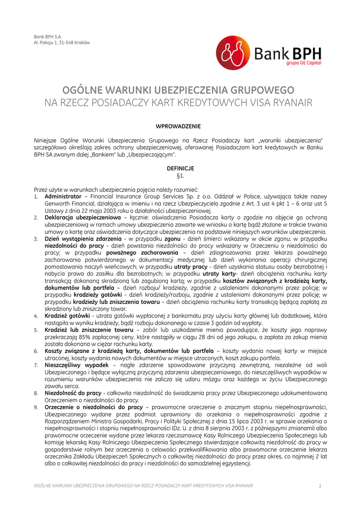 Bank BPH S.A. Al. Pokoju 1, 31-548 Kraków OGÓLNE WARUNKI UBEZPIECZENIA GRUPOWEGO NA RZECZ POSIADACZY KART KREDYTOWYCH VISA RYANAIR WPROWADZENIE Niniejsze Ogólne Warunki Ubezpieczenia Grupowego na Rzecz Posiadaczy kart „warunki ubezpieczenia” szczegółowo określają zakres ochrony ubezpieczeniowej, oferowanej Posiadaczom kart kredytowych w Banku BPH SA zwanym dalej „Bankiem” lub „Ubezpieczającym”. DEFINICJE §1. Przez użyte w warunkach ubezpieczenia pojęcia należy rozumieć: 1. Administrator – Financial Insurance Group Services Sp. z o.o. Oddział w Polsce, używająca także nazwy Genworth Financial, działająca w imieniu i na rzecz Ubezpieczyciela zgodnie z Art. 3 ust 4 pkt 1 – 6 oraz ust 5 Ustawy z dnia 22 maja 2003 roku o działalności ubezpieczeniowej. 2. Deklaracja ubezpieczeniowa – łącznie: oświadczenia Posiadacza karty o zgodzie na objęcie go ochroną ubezpieczeniową w ramach umowy ubezpieczenia zawarte we wniosku o kartę bądź złożone w trakcie trwania umowy o kartę oraz oświadczenia dotyczące ubezpieczenia na podstawie niniejszych warunków ubezpieczenia. 3. Dzień wystąpienia zdarzenia - w przypadku zgonu - dzień śmierci wskazany w akcie zgonu; w przypadku niezdolności do pracy - dzień powstania niezdolności do pracy wskazany w Orzeczeniu o niezdolności do pracy; w przypadku poważnego zachorowania – dzień zdiagnozowania przez lekarza poważnego zachorowania potwierdzonego w dokumentacji medycznej lub dzień wykonania operacji chirurgicznej pomostowania naczyń wieńcowych; w przypadku utraty pracy - dzień uzyskania statusu osoby bezrobotnej i nabycia prawa do zasiłku dla bezrobotnych; w przypadku utraty karty- dzień obciążenia rachunku karty transakcją dokonaną skradzioną lub zagubioną kartą; w przypadku kosztów związanych z kradzieżą karty, dokumentów lub portfela – dzień rozboju/ kradzieży, zgodnie z ustaleniami dokonanymi przez policję; w przypadku kradzieży gotówki - dzień kradzieży/rozboju, zgodnie z ustaleniami dokonanymi przez policję; w przypadku kradzieży lub zniszczenia towaru – dzień obciążenia rachunku karty transakcją będącą zapłatą za skradziony lub zniszczony towar. 4. Kradzież gotówki - utrata gotówki wypłaconej z bankomatu przy użyciu karty głównej lub dodatkowej, która nastąpiła w wyniku kradzieży, bądź rozboju dokonanego w czasie 3 godzin od wypłaty. 5. Kradzież lub zniszczenie towaru – zabór lub uszkodzenie mienia powodujące, że koszty jego naprawy przekraczają 85% zapłaconej ceny, które nastąpiły w ciągu 28 dni od jego zakupu, a zapłata za zakup mienia została dokonana w ciężar rachunku karty. 6. Koszty związane z kradzieżą karty, dokumentów lub portfela – koszty wydania nowej karty w miejsce utraconej, koszty wydania nowych dokumentów w miejsce utraconych, koszt zakupu portfela. 7. Nieszczęśliwy wypadek – nagłe zdarzenie spowodowane przyczyną zewnętrzną, niezależne od woli Ubezpieczonego i będące wyłączną przyczyną zdarzenia ubezpieczeniowego, do nieszczęśliwych wypadków w rozumieniu warunków ubezpieczenia nie zalicza się udaru mózgu oraz każdego w życiu Ubezpieczonego zawału serca. 8. Niezdolność do pracy - całkowita niezdolność do świadczenia pracy przez Ubezpieczonego udokumentowana Orzeczeniem o niezdolności do pracy. 9. Orzeczenie o niezdolności do pracy – prawomocne orzeczenie o znacznym stopniu niepełnosprawności, Ubezpieczonego wydane przez podmiot uprawniony do orzekania o niepełnosprawności zgodnie z Rozporządzeniem Ministra Gospodarki, Pracy i Polityki Społecznej z dnia 15 lipca 2003 r. w sprawie orzekania o niepełnosprawności i stopniu niepełnosprawności (Dz. U. z dnia 8 sierpnia 2003 r. z późniejszymi zmianami) albo prawomocne orzeczenie wydane przez lekarza rzeczoznawcę Kasy Rolniczego Ubezpieczenia Społecznego lub komisję lekarską Kasy Rolniczego Ubezpieczenia Społecznego stwierdzające całkowitą niezdolność do pracy w gospodarstwie rolnym bez orzeczenia o celowości przekwalifikowania albo prawomocne orzeczenie lekarza orzecznika Zakładu Ubezpieczeń Społecznych o całkowitej niezdolności do pracy przez okres, co najmniej 2 lat albo o całkowitej niezdolności do pracy i niezdolności do samodzielnej egzystencji. OGÓLNE WARUNKI UBEZPIECZENIA GRUPOWEGO NA RZECZ POSIADACZY KART KREDYTOWYCH VISA RYANAIR 1 10. Pakiet Bezpieczny portfel – pakiet obejmujący ubezpieczenia utraty karty, kradzieży gotówki oraz kosztów związanych z kradzieżą karty, dokumentów lub portfela. Ubezpieczenia z Pakietu Bezpieczny portfel obejmują zdarzenia powstałe na terenie Rzeczypospolitej Polskiej oraz pozostałych krajów Unii Europejskiej. 11. Posiadacz karty - osoba fizyczna, której na podstawie umowy o kartę, Bank przyznał limit kredytu i wydał kartę. 12. Poważne zachorowanie – co najmniej jedna z niżej zdefiniowanych chorób, o ile jej zdiagnozowanie przez lekarza nastąpiło po dniu objęcia Ubezpieczonego ochroną ubezpieczeniową: 1) zawał serca –pierwsza w życiu ubezpieczonego martwica części mięśnia sercowego w następstwie nagłego przerwania dopływu krwi. Rozpoznanie musi być oparte na łącznym wystąpieniu typowych objawów: bóle klatki piersiowej, świeże zmiany w zapisie EKG charakterystyczne dla świeżo przebytego zawału serca oraz znacznie zwiększony poziom enzymów sercowych we krwi; 2) udar mózgu – nagłe, ogniskowe uszkodzenie mózgu powstałe w następstwie zmian naczyniowych, powodujące powstanie trwałych ubytków neurologicznych. Rozpoznanie musi zostać poparte świeżymi zmianami w obrazie tomografii komputerowej lub jądrowego rezonansu magnetycznego. Ubezpieczeniem nie są objęte jakiekolwiek epizody przemijającego niedokrwienia mózgu; 3) niewydolność nerek – schyłkowe stadium choroby nerek wyrażające się nieodwracalnym upośledzeniem czynności obu nerek oraz stanowiące bezwzględne wskazanie do przewlekłe