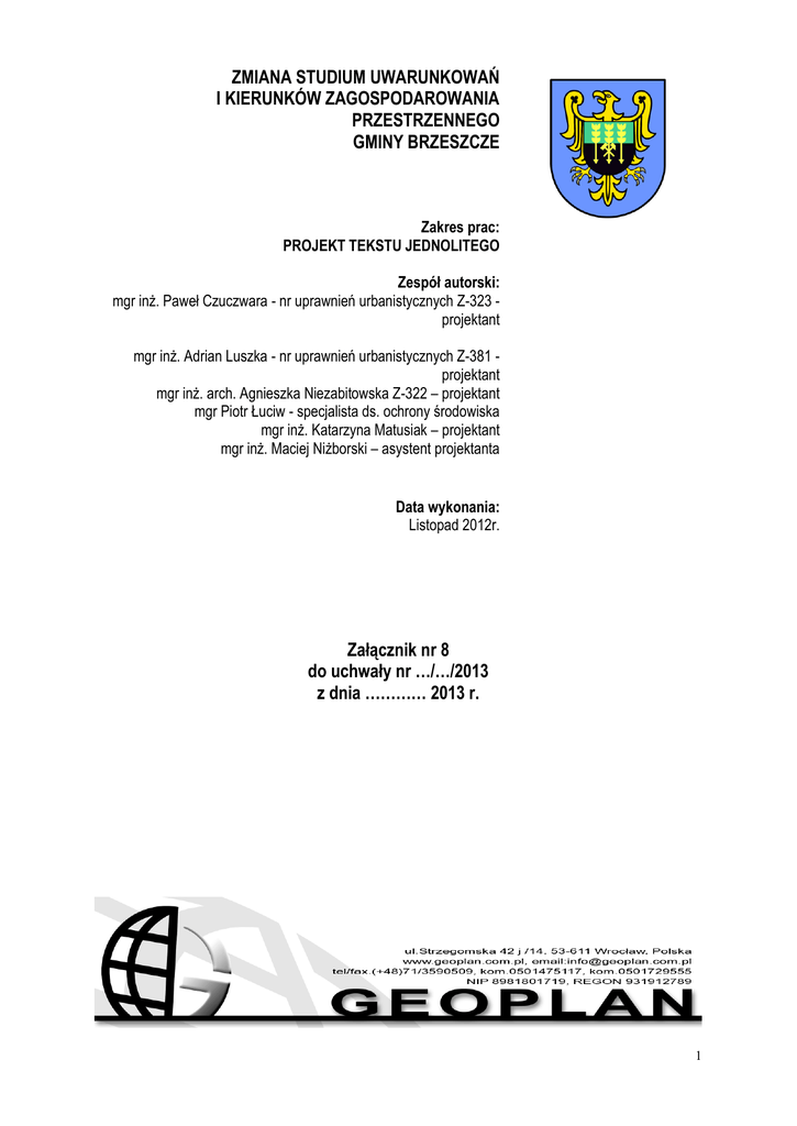 ZMIANA STUDIUM UWARUNKOWAŃ I KIERUNKÓW ZAGOSPODAROWANIA PRZESTRZENNEGO GMINY BRZESZCZE Zakres prac: PROJEKT TEKSTU JEDNOLITEGO Zespół autorski: mgr inż. Paweł Czuczwara - nr uprawnień urbanistycznych Z-323 projektant mgr inż. Adrian Luszka - nr uprawnień urbanistycznych Z-381 projektant mgr inż. arch. Agnieszka Niezabitowska Z-322 – projektant mgr Piotr Łuciw - specjalista ds. ochrony środowiska mgr inż. Katarzyna Matusiak – projektant mgr inż. Maciej Niżborski – asystent projektanta Data wykonania: Listopad 2012r. Załącznik nr 8 do uchwały nr …/…/2013 z dnia ………… 2013 r. 1 SPIS ZAWARTOŚCI STUDIUM A. CZĘŚĆ TEKSTOWA – TEKST UJEDNOLICONY - OBEJMUJE: 1. Rozdział 1 - Informacje wstępne 2. Rozdział 2 - Gmina Brzeszcze w układzie krajowym, regionalnym i sąsiedzkim 3. Rozdział 3 - Ocena stanu i prognozy rozwoju demograficznego oraz stopnia zrównoważenia rynku pracy w gminie Brzeszcze 4. Rozdział 4 - Uwarunkowania, prognozy i kierunki programowo-przestrzennego rozwoju gminy 5. Rozdział 5 - Zagadnienia eksploatacji górniczej 6. Rozdział 6 - Środowisko kulturowe gminy Brzeszcze 7. Rozdział 7 - Środowisko – zasoby, uwarunkowania, kierunki kształtowania i ochrony 8. Rozdział 8 - Rolnicza przestrzeń produkcyjna 9. Rozdział 9 - Zagadnienia komunikacji 10. Rozdział 10 - Zagadnienia gospodarki wodno-ściekowej 11. Rozdział 11 - Zagadnienia gospodarki energetycznej 12. Rozdział 12 - Sformułowanie polityki przestrzennej gminy – synteza Spis treści Rozdział 1 . INFORMACJE WSTĘPNE. .................................................................................................................. 7 1. Wprowadzenie .................................................................................................................................................................. 7 2. Ogólne informacje o Studium ............................................................................................................................................ 7 2.1. Podstawa prawna opracowania ................................................................................................................................ 7 2.2. Cel opracowania ....................................................................................................................................................... 8 2.3. Metoda opracowania Studium .................................................................................................................................. 8 3. Dotychczasowe plany miejscowe i aktualny stan prawny w zakresie planowania miejscowego na obszarze gminy Brzeszcze .............................................................................................................................................................................. 8 3.1. Dla obszaru gminy Brzeszcze opracowane były dotychczas następujące plany zagospodarowania przestrzennego: ............................................................................................................................................................... 8 3.2. Aktualnie na obszarze gminy Brzeszcze obowiązują następujące plany zagospodarowania przestrzennego: ....... 8 4. Ogólne informacje o obszarze opracowania Studium ....................................................................................................... 9 5. Zakres kolejnych zmian Studium: ................................................................................................................................... 10 2 Rozdział 2 . GMINA BRZESZCZE W UKŁADZIE KRAJOWYM, REGIONALNYM I SĄSIEDZKIM ....................... 12 1. Powiązania i uwarunkowania gminy Brzeszcze w ramach układu krajowego i regionalnego wynikające z wniosków do Studium ............................................................................................................................................................................... 12 1.1. Wg wniosku Wojewody Małopolskiego ................................................................................................................... 12 1.2. Wg wniosku Marszałka Województwa Małopolskiego. ........................................................................................... 12 1.3. Wg wniosku Wojewódzkiego Oddziału Służby Ochrony Zabytków w Krakowie ..................................................... 14 1.4. Wg wniosku Regionalnego Zarządu Gospodarki Wodnej w Gliwicach ................................................................... 14 1.5. Wg wniosku P.K.P. Polskie Linie Kolejowe S.A. Odział Regionalny w Krakowie ................................................... 14 1.6. Wg wniosku Generalnej Dyrekcji Dróg Krajowych i Autostrad ................................................................................ 15 1.7. Wg wniosku Dyrektora Okręgowego Urzędu Górniczego w Krakowie ................................................................... 15 1.8. Wg wniosku Kopalni Węgla Kamiennego „Brzeszcze” ........................................................................................... 15 1.9. Poza w/w wnioskami, w odpowiedzi na zawiadomienie o przystąpieniu do opracowania Studium uwarunkowań i kierunków zagospodarowania przestrzennego gminy Brzeszcze wpłynęły jeszcze wnioski i pisma od niżej wymienionych instytucji, które nie wnoszą zasadniczych uwag do Studium: ................................................................ 15 2. Powiązania obszaru gminy Brzeszcze z gminami sąsiednimi ........................................................................................ 16 2.1. Gmina Oświęcim ..................................................................................................................................................... 16 2.2. Gmina Kęty ............................................................................................................................................................. 16 2.3. Gmina