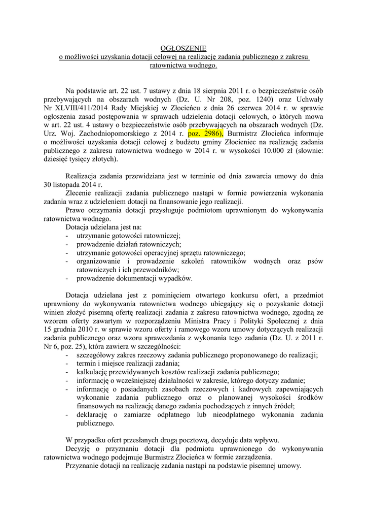 OGŁOSZENIE o możliwości uzyskania dotacji celowej na realizację zadania publicznego z zakresu ratownictwa wodnego. Na podstawie art. 22 ust. 7 ustawy z dnia 18 sierpnia 2011 r. o bezpieczeństwie osób przebywających na obszarach wodnych (Dz. U. Nr 208, poz. 1240) oraz Uchwały Nr XLVIII/411/2014 Rady Miejskiej w Złocieńcu z dnia 26 czerwca 2014 r. w sprawie ogłoszenia zasad postępowania w sprawach udzielenia dotacji celowych, o których mowa w art. 22 ust. 4 ustawy o bezpieczeństwie osób przebywających na obszarach wodnych (Dz. Urz. Woj. Zachodniopomorskiego z 2014 r. poz. 2986), Burmistrz Złocieńca informuje o możliwości uzyskania dotacji celowej z budżetu gminy Złocieniec na realizację zadania publicznego z zakresu ratownictwa wodnego w 2014 r. w wysokości 10.000 zł (słownie: dziesięć tysięcy złotych). Realizacja zadania przewidziana jest w terminie od dnia zawarcia umowy do dnia 30 listopada 2014 r. Zlecenie realizacji zadania publicznego nastąpi w formie powierzenia wykonania zadania wraz z udzieleniem dotacji na finansowanie jego realizacji. Prawo otrzymania dotacji przysługuje podmiotom uprawnionym do wykonywania ratownictwa wodnego. Dotacja udzielana jest na: - utrzymanie gotowości ratowniczej; - prowadzenie działań ratowniczych; - utrzymanie gotowości operacyjnej sprzętu ratowniczego; - organizowanie i prowadzenie szkoleń ratowników wodnych oraz psów ratowniczych i ich przewodników; - prowadzenie dokumentacji wypadków. Dotacja udzielana jest z pominięciem otwartego konkursu ofert, a przedmiot uprawniony do wykonywania ratownictwa wodnego ubiegający się o pozyskanie dotacji winien złożyć pisemną ofertę realizacji zadania z zakresu ratownictwa wodnego, zgodną ze wzorem oferty zawartym w rozporządzeniu Ministra Pracy i Polityki Społecznej z dnia 15 grudnia 2010 r. w sprawie wzoru oferty i ramowego wzoru umowy dotyczących realizacji zadania publicznego oraz wzoru sprawozdania z wykonania tego zadania (Dz. U. z 2011 r. Nr 6, poz. 25), która zawiera w szczególności: - szczegółowy zakres rzeczowy zadania publicznego proponowanego do realizacji; - termin i miejsce realizacji zadania; - kalkulację przewidywanych kosztów realizacji zadania publicznego; - informację o wcześniejszej działalności w zakresie, którego dotyczy zadanie; - informację o posiadanych zasobach rzeczowych i kadrowych zapewniających wykonanie zadania publicznego oraz o planowanej wysokości środków finansowych na realizację danego zadania pochodzących z innych źródeł; - deklarację o zamiarze odpłatnego lub nieodpłatnego wykonania zadania publicznego. W przypadku ofert przesłanych drogą pocztową, decyduje data wpływu. Decyzję o przyznaniu dotacji dla podmiotu uprawnionego do wykonywania ratownictwa wodnego podejmuje Burmistrz Złocieńca w formie zarządzenia. Przyznanie dotacji na realizację zadania nastąpi na podstawie pisemnej umowy. Złożenie oferty realizacji zadania przez podmiot uprawniony nie jest równoznaczne z zapewnieniem przyznania dotacji w wysokości wnioskowanej. W przypadku otrzymania dotacji w wysokości niższej niż wnioskowana, podmiot uprawniony zobowiązany jest do korekty kosztorysu zadania. Przy rozpatrywaniu ofert realizacji zadania Burmistrz Złocieńca: a) ocenia możliwość realizacji zadania publicznego przez podmiot uprawniony do wykonywania ratownictwa wodnego; b) ocenia przedstawioną kalkulację kosztów realizacji zadania publicznego, w tym w odniesieniu do zakresu rzeczowego zadania; c) ocenia proponowaną jakość wykonania zadania i kwalifikacje osób, przy udziale których będzie realizować zadanie publiczne; d) ocenia, czy zadanie publiczne spełnia wymogi, o których mowa w niniejszej uchwale; e) ustala zakres terytorialny realizacji zadania; f) ustala planowany udział środków finansowych własnych lub środków pochodzących z innych źródeł na realizację zadania publicznego; g) ustala planowany wkład rzeczowy, osobowy, w tym świadczenia wolontariuszy i pracę społeczną członków podmiotu uprawnionego. Oferty w sprawie realizacji zadania publicznego należy składać (pocztą lub osobiście) w sekretariacie Urzędu Miejskiego w Złocieńcu, ul. Stary Rynek 3, lub przesłać na adres korespondencyjny: Urząd Miejski w Złocieńcu, ul. Stary Rynek 3, 78-520 Złocieniec, z dopiskiem „Oferta realizacja zadania – bezpieczeństwo na obszarach wodnych na terenie gminy Złocieniec”, w nieprzekraczalnym terminie do dnia 03 września 2014 r.