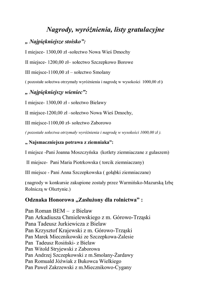 Nagrody, wyróżnienia, listy gratulacyjne „ Najpiękniejsze stoisko”: I miejsce- 1300,00 zł -sołectwo Nowa Wieś Dmochy II miejsce- 1200,00 zł– sołectwo Szczepkowo Borowe III miejsce-1100,00 zł – sołectwo Smolany ( pozostałe sołectwa otrzymały wyróżnienia i nagrodę w wysokości 1000,00 zł ) „ Najpiękniejszy wieniec”: I miejsce- 1300,00 zł - sołectwo Bielawy II miejsce-1200,00 zł –sołectwo Nowa Wieś Dmochy, III miejsce-1100,00 zł- sołectwo Zaborowo ( pozostałe sołectwa otrzymały wyróżnienia i nagrodę w wysokości 1000,00 zł ). „ Najsmaczniejsza potrawa z ziemniaka”: I miejsce -Pani Joanna Moszczyńska (kotlety ziemniaczane z gulaszem) II miejsce- Pani Maria Piotrkowska ( torcik ziemniaczany) III miejsce - Pani Anna Szczepkowska ( gołąbki ziemniaczane) ( nagrody w konkursie zakupione zostały przez Warmińsko-Mazurską Izbę Rolniczą w Olsztynie.) Odznaka Honorowa „Zasłużony dla rolnictwa” : Pan Roman BEM – z Bielaw Pan Arkadiusza Chmielewskiego z m. Górowo-Trząski Pana Tadeusz Jurkiewicza z Bielaw Pan Krzysztof Krajewski z m. Górowo-Trząski Pan Marek Miecznikowski ze Szczepkowa-Zalesie Pan Tadeusz Rosiński- z Bielaw Pan Witold Stryjewski z Zaborowa Pan Andrzej Szczepkowski z m.Smolany-Żardawy Pan Romuald Jóźwiak z Bukowca Wielkiego Pan Paweł Zakrzewski z m.Miecznikowo-Cygany PRIMUS INTER PARES znaczy „ PIERWSZY WŚRÓD RÓWNYCH SOBIE”- - Aleksandra Kownacka Nagroda Wójta Gminy Janowiec Kościelny za osiągnięcia w dziedzinie sportu: w kategorii indywidualnej: -Katarzyna Nowakowska, uczennica Zespołu Szkół w Janowcu Kościelnym, powołana do Kadry Wojewódzkiej oraz do drużyny Stomil Olsztyn, z którą zdobyła awans do Finału Klubowych Mistrzostw Polski. w kategorii drużynowej: -drużyna piłki nożnej żeńskiej uczennic gimnazjum Zespołu Szkół w Janowcu Kościelnym, za zdobycie tytułu Mistrzostw Województwa w rozgrywkach organizowanych przez Warmińsko – Mazurskie Zrzeszenie Ludowych Zespołów Sportowych w Halowej Piłce Nożnej Kobiet. List gratulacyjny i tytułu „Lider Produkcji Mleka” otrzymali Panowie : Tadeusz Szczepkowski ,Marek Moszczyński, Andrzej Szypulski, Sławomir Szwarc ,Kamil Chmielewski . Wymienieni hodowcy, według informacji Polskiej Federacji Bydła i Producentów w Olsztynie uzyskują wysoką wydajność w produkcji mleka o najwyższych parametrach jakościowych. Okolicznościowy dyplom za zajęcie III miejsca w województwie warmińskomazurskim w konkursie „ BEZPIECZNE GOSPODARSTWO ROLNE” otrzymali Państwo Beata i Witold Stryjewscy z Zaborowa, Podziękowania i słowa uznania – Ludowy Klub Sportowy „ Orzeł_- za awans do IV Ligi Okręgowej