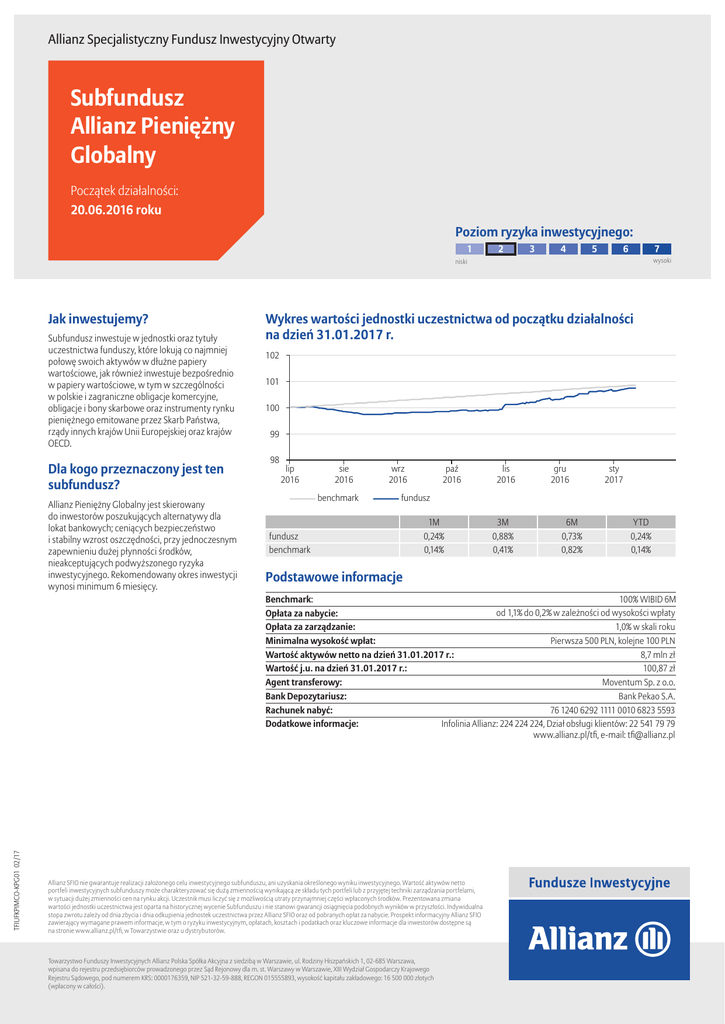 Allianz Specjalistyczny Fundusz Inwestycyjny Otwarty Subfundusz Allianz Pieniężny Globalny Początek działalności: 20.06.2016 roku Poziom ryzyka inwestycyjnego: 1 2 3 4 5 6 7 wysoki niski Jak inwestujemy? Subfundusz inwestuje w jednostki oraz tytuły uczestnictwa funduszy, które lokują co najmniej połowę swoich aktywów w dłużne papiery wartościowe, jak również inwestuje bezpośrednio w papiery wartościowe, w tym w szczególności w polskie i zagraniczne obligacje komercyjne, obligacje i bony skarbowe oraz instrumenty rynku pieniężnego emitowane przez Skarb Państwa, rządy innych krajów Unii Europejskiej oraz krajów OECD. Dla kogo przeznaczony jest ten subfundusz? Allianz Pieniężny Globalny jest skierowany do inwestorów poszukujących alternatywy dla lokat bankowych; ceniących bezpieczeństwo i stabilny wzrost oszczędności, przy jednoczesnym zapewnieniu dużej płynności środków, nieakceptujących podwyższonego ryzyka inwestycyjnego. Rekomendowany okres inwestycji wynosi minimum 6 miesięcy. Wykres wartości jednostki uczestnictwa od początku działalności na dzień 31.01.2017 r. 102 101 100 99 98 lip 2016 sie 2016 benchmark wrz 2016 paź 2016 lis 2016 gru 2016 sty 2017 fundusz fundusz benchmark 1M 0,24% 0,14% 3M 0,88% 0,41% 6M 0,73% 0,82% YTD 0,24% 0,14% Podstawowe informacje TFIUFKPIMCO-KPG01 02/17 100% WIBID 6M Benchmark: od 1,1% do 0,2% w zależności od wysokości wpłaty Opłata za nabycie: 1,0% w skali roku Opłata za zarządzanie: Pierwsza 500 PLN, kolejne 100 PLN Minimalna wysokość wpłat: 8,7 mln zł Wartość aktywów netto na dzień 31.01.2017 r.: 100,87 zł Wartość j.u. na dzień 31.01.2017 r.: Moventum Sp. z o.o. Agent transferowy: Bank Pekao S.A. Bank Depozytariusz: 76 1240 6292 1111 0010 6823 5593 Rachunek nabyć: Infolinia Allianz: 224 224 224, Dział obsługi klientów: 22 541 79 79 Dodatkowe informacje: www.allianz.pl/tfi, e-mail: [email protected] Allianz SFIO nie gwarantuje realizacji założonego celu inwestycyjnego subfunduszu, ani uzyskania określonego wyniku inwestycyjnego. Wartość aktywów netto portfeli inwestycyjnych subfunduszy może charakteryzować się dużą zmiennością wynikającą ze składu tych portfeli lub z przyjętej techniki zarządzania portfelami, w sytuacji dużej zmienności cen na rynku akcji. Uczestnik musi liczyć się z możliwością utraty przynajmniej części wpłaconych środków. Prezentowana zmiana wartości jednostki uczestnictwa jest oparta na historycznej wycenie Subfunduszu i nie stanowi gwarancji osiągnięcia podobnych wyników w przyszłości. Indywidualna stopa zwrotu zależy od dnia zbycia i dnia odkupienia jednostek uczestnictwa przez Allianz SFIO oraz od pobranych opłat za nabycie. Prospekt informacyjny Allianz SFIO zawierający wymagane prawem informacje, w tym o ryzyku inwestycyjnym, opłatach, kosztach i podatkach oraz kluczowe informacje dla inwestorów dostępne są na stronie www.allianz.pl/tfi, w Towarzystwie oraz u dystrybutorów. Towarzystwo Funduszy Inwestycyjnych Allianz Polska Spółka Akcyjna z siedzibą w Warszawie, ul. Rodziny Hiszpańskich 1, 02-685 Warszawa, wpisana do rejestru przedsiębiorców prowadzonego przez Sąd Rejonowy dla m. st. Warszawy w Warszawie, XIII Wydział Gospodarczy Krajowego Rejestru Sądowego, pod numerem KRS: 0000176359, NIP 521-32-59-888, REGON 015555893, wysokość kapitału zakładowego: 16 500 000 złotych (wpłacony w całości).
