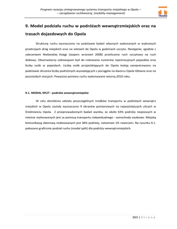 Program rozwoju zintegrowanego systemu transportu miejskiego w Opolu – – zarządzanie ruchliwością (mobility management) 9. Model podziału ruchu w podróżach wewnątrzmiejskich oraz na trasach dojazdowych do Opola Strukturę ruchu wyznaczono na podstawie badań własnych wykonanych w wybranych przekrojach dróg miejskich oraz na wlotach do Opola w godzinach szczytu. Następnie, zgodnie z zaleceniami Niebieskiej Księgi (Jaspers wrzesień 2008) przeliczono ruch szczytowy na ruch dobowy. Obserwatorzy zobowiązani byli do notowania numerów rejestracyjnych pojazdów oraz liczby osób w pojazdach. Liczbę osób przyjeżdżających do Opola koleją zarejestrowano na podstawie zliczania liczby podróżnych wysiadających z pociągów na dworcu Opole Główne oraz na pozostałych stacjach. Powyższe pomiary ruchu wykonywano wiosną 2010 roku. 9.1. MODAL SPLIT - podróże wewnątrzmiejskie W celu określenia udziału poszczególnych środków transportu w podróżach wewnątrz miejskich w Opolu zostały wyznaczono 9 ekranów pomiarowych na najważniejszych ulicach w Śródmieściu Opola. Z przeprowadzonych badań wynika, że około 63% podróży niepieszych w mieście realizowanych jest za pomocą transportu indywidualnego - samochody osobowe. Miejską komunikacją zbiorową realizowanych jest 36% podróży, natomiast 1% rowerami. Na rysunku 9.1. pokazano graficznie podział ruchu (modal split) dla podróży wewnątrzmiejskich. 263 | S t r o n a Program rozwoju zintegrowanego systemu transportu miejskiego w Opolu – – zarządzanie ruchliwością (mobility management) Rys. 9.1. Podział ruchu w śródmieściu Opola. 264 | S t r o n a Program rozwoju zintegrowanego systemu transportu miejskiego w Opolu – – zarządzanie ruchliwością (mobility management) Średnie napełnienie samochodów osobowych w śródmieściu Opola kształtuje się na poziomie 1,46 pasażerów na pojazd. Dokładną strukturę napełnień pojazdów prezentuje wykres poniżej. Rys. 9.2. Napełnienie samochodów osobowych w śródmieściu Opola. Poprawiając zasadniczo jakość transportu zbiorowego w mieście, w szczególności poprzez budowę pasów ruchu dla autobusów doprowadzić można do wzrostu liczby podróży komunikacją miejską osiągając o około 8 – 12 % wzrost jej udziału kosztem samochodów osobowych. Dodatkowe ograniczenia swobody poruszania się samochodem w centrum miasta oraz podniesienie opłat za parkowanie mogą przysporzyć komunikacji zbiorowej kolejne 5 % podróżnych. Działania w zakresie rozbudowy systemu tras rowerowych, w cieplejszej połowie 265 | S t r o n a Program rozwoju zintegrowanego systemu transportu miejskiego w Opolu – – zarządzanie ruchliwością (mobility management) roku, przynieść mogą wzrost udziału rowerów o około 6 %, jednakże większość dodatkowych użytkowników rowerów stanowić będą pasażerowie ludzie młodsi, którzy są pasażerami komunikacji zbiorowej, zatem szacować można, że ruch samochodowy zmniejszy się o maksymalnie 2 % a przewozy komunikacją miejską zmniejszą się o 4 % . Wzrost sześcioprocentowy ruchu rowerowego będzie prawdopodobny po zakończeniu realizacji programu budowy tras rowerowych, natomiast w kolejnych latach należy spodziewać się dalszego, stopniowego wzrostu ruchu rowerów nawet do 10 % udziału w ruchu wewnątrzmiejskim. Rysunek 9.3. przedstawia wykres podziału ruchu możliwego do uzyskania po realizacji programu rozwoju i priorytetów dla transportu zbiorowego oraz programu rozbudowy tras rowerowych. Rys. 9.3. Podział ruchu w Opolu po realizacji programu rozwoju i priorytetów dla transportu zbiorowego oraz programu rozbudowy tras rowerowych. 266 | S t r o n a Program rozwoju zintegrowanego systemu transportu miejskiego w Opolu – – zarządzanie ruchliwością (mobility management) W efekcie powyższych zmian spodziewać się można zmniejszenia ruchu samochodów o około 18%. Większe zmiany są możliwe wyłącznie poprzez szersze działania w zakresie rozwoju komunikacji regionalnej dowożącej pasażerów spoza Opola oraz poprzez wprowadzenie nowych atrakcyjnych środków transportu publicznego , np.: dwóch linii tramwajowych. Nowoczesne tramwaje w Opolu, powiązane z systemem sprawnych linii autobusowych, w którym jedne i drugie będą miały priorytety w ruchu, mogą przyciągnąć kolejne 8 - 10 % korzystających z komunikacji indywidualnej kształtując modal split na poziomie przedstawionym na rysunku nr 9.4. Rys. 9.4. Podział ruchu w Opolu po realizacji programu rozwoju i priorytetów dla transportu zbiorowego, programu rozbudowy tras rowerowych oraz budowy 2 linii tramwajowych. 267 | S t r o n a Program rozwoju zintegrowanego systemu transportu miejskiego w Opolu – – zarządzanie ruchliwością (mobility management) Rys. 9.4a. Podział ruchu w Opolu po realizacji programu rozwoju i priorytetów dla transportu zbiorowego, programu rozbudowy tras rowerowych oraz budowy systemu BRT. 268 | S t r o n a Program rozwoju zintegrowanego systemu transportu miejskiego w Opolu – – zarządzanie ruchliwością (mobility management) 9.2. MODAL SPLIT - podróże do Opola W celu wyznaczenia podziału ruchu dolotowego do Opola wykonano pomiary ruchu na wszystkich drogach wjazdowych. Pasażerów wjeżdżających do miasta pociągami przydzielono do odpowiadających im wlotów drogowych. W niektórych przypadkach, z uwagi różny przebieg tras drogowych i kolejowych oraz wynikające z tego różne strefy ciążenia do układu drogowego oraz do linii kolejowych, wielkość przewozów kolejowych może być nieporównywalna z wielkością przewozów drogowych, szczególnie wówczas gdy przejazdy dalekobieżne kolejowe i drogowe realizowane są innymi wlotami do Opola (np.: Kolej od Krakowa – linią od Kędzierzyna Koźla wzdłuż Oświęcimskiej a transport drogowy wlotem od Strzelec Opolskich). Głównym środkiem transportu w podróżach do Opola jest samochód osobowy, z którego korzysta 71 