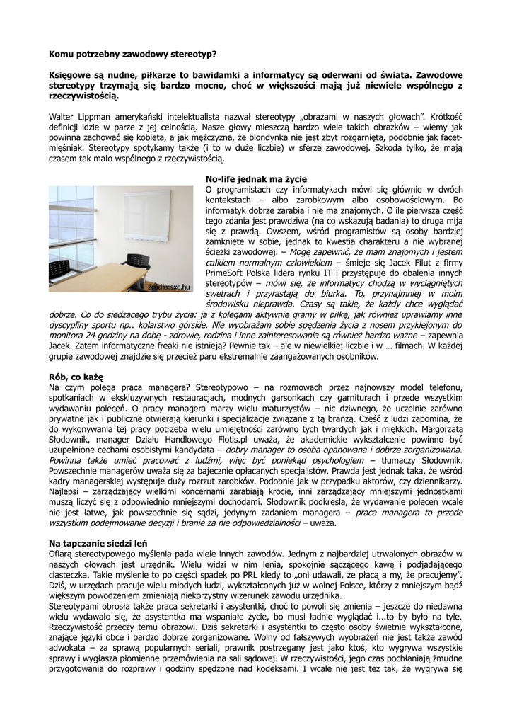 Komu potrzebny zawodowy stereotyp? Księgowe są nudne, piłkarze to bawidamki a informatycy są oderwani od świata. Zawodowe stereotypy trzymają się bardzo mocno, choć w większości mają już niewiele wspólnego z rzeczywistością. Walter Lippman amerykański intelektualista nazwał stereotypy „obrazami w naszych głowach”. Krótkość definicji idzie w parze z jej celnością. Nasze głowy mieszczą bardzo wiele takich obrazków – wiemy jak powinna zachować się kobieta, a jak mężczyzna, że blondynka nie jest zbyt rozgarnięta, podobnie jak facetmięśniak. Stereotypy spotykamy także (i to w duże liczbie) w sferze zawodowej. Szkoda tylko, że mają czasem tak mało wspólnego z rzeczywistością. No-life jednak ma życie O programistach czy informatykach mówi się głównie w dwóch kontekstach – albo zarobkowym albo osobowościowym. Bo informatyk dobrze zarabia i nie ma znajomych. O ile pierwsza część tego zdania jest prawdziwa (na co wskazują badania) to druga mija się z prawdą. Owszem, wśród programistów są osoby bardziej zamknięte w sobie, jednak to kwestia charakteru a nie wybranej ścieżki zawodowej. – Mogę zapewnić, że mam znajomych i jestem całkiem normalnym człowiekiem – śmieje się Jacek Filut z firmy PrimeSoft Polska lidera rynku IT i przystępuje do obalenia innych stereotypów – mówi się, że informatycy chodzą w wyciągniętych swetrach i przyrastają do biurka. To, przynajmniej w moim środowisku nieprawda. Czasy są takie, że każdy chce wyglądać dobrze. Co do siedzącego trybu życia: ja z kolegami aktywnie gramy w piłkę, jak również uprawiamy inne dyscypliny sportu np.: kolarstwo górskie. Nie wyobrażam sobie spędzenia życia z nosem przyklejonym do monitora 24 godziny na dobę - zdrowie, rodzina i inne zainteresowania są również bardzo ważne – zapewnia Jacek. Zatem informatyczne freaki nie istnieją? Pewnie tak – ale w niewielkiej liczbie i w … filmach. W każdej grupie zawodowej znajdzie się przecież paru ekstremalnie zaangażowanych osobników. Rób, co każę Na czym polega praca managera? Stereotypowo – na rozmowach przez najnowszy model telefonu, spotkaniach w ekskluzywnych restauracjach, modnych garsonkach czy garniturach i przede wszystkim wydawaniu poleceń. O pracy managera marzy wielu maturzystów – nic dziwnego, że uczelnie zarówno prywatne jak i publiczne otwierają kierunki i specjalizacje związane z tą branżą. Część z ludzi zapomina, że do wykonywania tej pracy potrzeba wielu umiejętności zarówno tych twardych jak i miękkich. Małgorzata Słodownik, manager Działu Handlowego Flotis.pl uważa, że akademickie wykształcenie powinno być uzupełnione cechami osobistymi kandydata – dobry manager to osoba opanowana i dobrze zorganizowana. Powinna także umieć pracować z ludźmi, więc być poniekąd psychologiem – tłumaczy Słodownik. Powszechnie managerów uważa się za bajecznie opłacanych specjalistów. Prawda jest jednak taka, że wśród kadry managerskiej występuje duży rozrzut zarobków. Podobnie jak w przypadku aktorów, czy dziennikarzy. Najlepsi – zarządzający wielkimi koncernami zarabiają krocie, inni zarządzający mniejszymi jednostkami muszą liczyć się z odpowiednio mniejszymi dochodami. Słodownik podkreśla, że wydawanie poleceń wcale nie jest łatwe, jak powszechnie się sądzi, jedynym zadaniem managera – praca managera to przede wszystkim podejmowanie decyzji i branie za nie odpowiedzialności – uważa. Na tapczanie siedzi leń Ofiarą stereotypowego myślenia pada wiele innych zawodów. Jednym z najbardziej utrwalonych obrazów w naszych głowach jest urzędnik. Wielu widzi w nim lenia, spokojnie sączącego kawę i podjadającego ciasteczka. Takie myślenie to po części spadek po PRL kiedy to „oni udawali, że płacą a my, że pracujemy”. Dziś, w urzędach pracuje wielu młodych ludzi, wykształconych już w wolnej Polsce, którzy z mniejszym bądź większym powodzeniem zmieniają niekorzystny wizerunek zawodu urzędnika. Stereotypami obrosła także praca sekretarki i asystentki, choć to powoli się zmienia – jeszcze do niedawna wielu wydawało się, że asystentka ma wspaniałe życie, bo musi ładnie wyglądać i...to by było na tyle. Rzeczywistość przeczy temu obrazowi. Dziś sekretarki i asystentki to często osoby świetnie wykształcone, znające języki obce i bardzo dobrze zorganizowane. Wolny od fałszywych wyobrażeń nie jest także zawód adwokata – za sprawą popularnych seriali, prawnik postrzegany jest jako ktoś, kto wygrywa wszystkie sprawy i wygłasza płomienne przemówienia na sali sądowej. W rzeczywistości, jego czas pochłaniają żmudne przygotowania do rozprawy i godziny spędzone nad kodeksami. I wcale nie jest też tak, że wygrywa się każdą rozprawę. Jak to w życiu – raz idzie lepiej a raz gorzej. Zapewne miną jeszcze długie lata zanim zrewidujemy nasze stereotypy i przestaniemy postrzegać ludzi przez pryzmat zawodów, które wykonują. Czas pokaże czy uda się nam ta sztuka. Bo istnieje ryzyko, że na miejsce starych stereotypów po prostu przyjdą nowe. Wtedy pozostanie nam tylko obrócić je w żart i iść naprzód. ------------------------------Dystrybucja materiałów: Kinga Przybysz [email protected] kom./+48/ 519-181-900