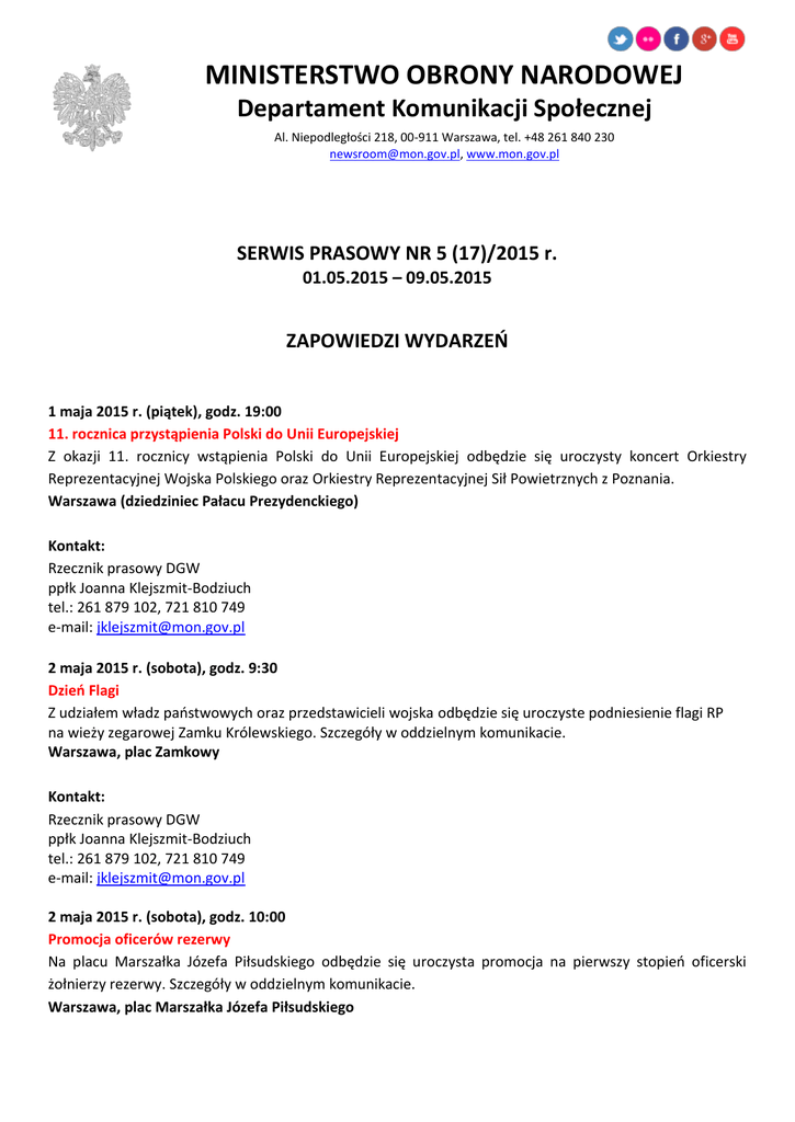MINISTERSTWO OBRONY NARODOWEJ Departament Komunikacji Społecznej Al. Niepodległości 218, 00-911 Warszawa, tel. +48 261 840 230 [email protected], www.mon.gov.pl SERWIS PRASOWY NR 5 (17)/2015 r. 01.05.2015 – 09.05.2015 ZAPOWIEDZI WYDARZEŃ 1 maja 2015 r. (piątek), godz. 19:00 11. rocznica przystąpienia Polski do Unii Europejskiej Z okazji 11. rocznicy wstąpienia Polski do Unii Europejskiej odbędzie się uroczysty koncert Orkiestry Reprezentacyjnej Wojska Polskiego oraz Orkiestry Reprezentacyjnej Sił Powietrznych z Poznania. Warszawa (dziedziniec Pałacu Prezydenckiego) Kontakt: Rzecznik prasowy DGW ppłk Joanna Klejszmit-Bodziuch tel.: 261 879 102, 721 810 749 e-mail: [email protected] 2 maja 2015 r. (sobota), godz. 9:30 Dzień Flagi Z udziałem władz państwowych oraz przedstawicieli wojska odbędzie się uroczyste podniesienie flagi RP na wieży zegarowej Zamku Królewskiego. Szczegóły w oddzielnym komunikacie. Warszawa, plac Zamkowy Kontakt: Rzecznik prasowy DGW ppłk Joanna Klejszmit-Bodziuch tel.: 261 879 102, 721 810 749 e-mail: [email protected] 2 maja 2015 r. (sobota), godz. 10:00 Promocja oficerów rezerwy Na placu Marszałka Józefa Piłsudskiego odbędzie się uroczysta promocja na pierwszy stopień oficerski żołnierzy rezerwy. Szczegóły w oddzielnym komunikacie. Warszawa, plac Marszałka Józefa Piłsudskiego Kontakt: Departament Komunikacji Społecznej tel. 261 840 230 e-mail: [email protected] 2 maja 2015 r. (sobota), godz. 14:30 III Bieg Flagi Pod honorowym patronatem ministra obrony narodowej, odbędzie się impreza biegowa z okazji Dnia Flagi. Więcej… Cytadela Warszawska Kontakt: Departament Komunikacji Społecznej tel. 261 840 230 e-mail: [email protected] 2 maja 2015 r. (sobota), godz. 15:45 Obchody 100. rocznicy bitwy pod Gorlicami Podsekretarz stanu w MON Maciej Jankowski weźmie udział w obchodach 100. rocznicy bitwy pod Gorlicami. Więcej… Łużna Kontakt: Departament Komunikacji Społecznej tel. 261 840 230 e-mail: [email protected] 3 maja 2015 r. (niedziela), godz. 11:15 Centralne uroczystości z okazji Święta Narodowego 3 Maja Msza święta za Ojczyznę w Archikatedrze św. Jana, wręczenia przez Prezydenta Rzeczypospolitej Polskiej odznaczeń państwowych, uroczysta zmiana posterunku honorowego przed Grobem Nieznanego Żołnierza w Warszawie połączona ze składaniem wieńców i wiązanek, koncert Orkiestry Wojskowej z Siedlec oraz udział Kompanii Reprezentacyjnej Wojska Polskiego to wydarzenia towarzyszące obchodom centralnym, które rozpoczną się o godz. 12.00 na placu Zamkowym. Warszawa, Plac Zamkowy Kontakt: Rzecznik prasowy DGW ppłk Joanna Klejszmit-Bodziuch tel.: 261 879 102, 721 810 749 e-mail: [email protected] 3 maja 2015 r. (niedziela), godz. 12:30 Wizyta Wiceministra Macieja Jankowskiego w Białymstoku Podsekretarz stanu w MON Maciej Jankowski weźmie udział w wojewódzkich obchodach uchwalenia Konstytucji 3 Maja. W programie uroczystości m.in. odczytanie Preambuły Konstytucji 3 maja, wykonanie pieśni "Witaj majowa jutrzenko" przez Miejską Orkiestrę Dętą, wystąpienia okolicznościowe oraz odczytanie Apelu Pamięci. Obchodom towarzyszyć będzie pokaz sprzętu Wojska Polskiego i służb mundurowych oraz pokaz sprawności kawaleryjskiej przy Parku im. Konstytucji 3 maja w Białymstoku. Białystok, Pomnik Marszałka Józefa Piłsudskiego, Rynek Kościuszki Kontakt: Departament Komunikacji Społecznej tel. 261 840 230 e-mail: [email protected] 4 maja - 8 maja 2015 r. (poniedziałek - piątek) Spartakiada wiosenna Mistrzostwa Wojska Polskiego w czterech konkurencjach: halowa piłka nożna, piłka siatkowa, pływanie, biegi przełajowe. Uroczyste otwarcie zawodów nastąpi 6 maja br. (środa) o godz. 8:00 w CSWIiCh. Centrum Szkolenia Wojsk Inżynieryjnych i Chemicznych, Wrocław Kontakt: kpt. Ewa Nowicka-Szlufik tel. 723 694 403 e-mail: [email protected] 4 maja - 13 maja 2015 r. (poniedziałek - wtorek) Ćwiczenie taktyczne z wojskami pk. „STEADFAST JAVELIN 2015“ Organizatorem ćwiczenia jest Estonia. W ćwiczeniu weźmie udział komponent lotniczy 21. Bazy Lotnictwa Taktycznego ze Świdwina. Amari, Estonia Kontakt: Rzecznik prasowy 21 BLT mjr Mirosław Lorenz tel. 519038151, 261 53-30-69 e-mail: [email protected] Rzecznik 8 pplot mjr Jarosław Bondalski tel. 727012516, 261457699 4 maja - 14 maja 2015 r. (poniedziałek - czwartek) Ćwiczenie taktyczne z wojskami pk. „DYNAMIC MONGOOSE-15" W manewrach NATO na wodach Morza Północnego udział bierze: korweta ORP Kaszub z 3. Flotylli Okrętów. Głównym celem manewrów Sojuszu Północnoatlantyckiego jest doskonalenie procedur współpracy podczas wykrywania, śledzenia i niszczenia okrętów podwodnych. Zadanie to jednostki będą realizować samodzielnie, jak i w składzie zespołu oraz przy współpracy ze śmigłowcami i samolotami. Morze Północne, Norwegia Kontakt: kmdr ppor. Radosław Pioch tel. 601 412 722, tel. 261 26 69 71 e-mail: [email protected] 4 maja - 22 maja 2015 r. (poniedziałek - piątek) Szkolenie poligonowe 16 batalionu saperów Szkolenie inżynieryjno-saperskie z zakresu budowy i pokonywania zapór inżynieryjnych oraz minerstwa z użyciem bojowych środków minersko-zaporowych. Ośrodek Szkolenia Poligonowego Wojsk Lądowych, Nowa Dęba Kontakt: kpt. Konrad Radzik tel. 691677515 e-mail: [email protected] 5 maja 2015 r. (wtorek), godz. 8:00 Nabór do Narodowych Sił Rezerwowych Przyjęcie około 400 ochotników służby przygotowawczej – kandydatów do Narodowych Sił Rezerwowych. Centrum Szkolenia Artylerii i Uzbrojenia – Toruń, ul. Sobieskiego 36 Kontakt: kpt. Tomasz Kisiel tel. +48 727 012 336 e-mail: [email protected] 5 maja - 29 maja 2015 r. (wtorek - piątek) Szkolenie poligonowe pododdziałów 11 pułku artylerii 5 maja br. rozpocznie się szkolenie poligonowe żołnierzy 11 mazurskiego pułku artylerii, które potrwa około trzech tygodni. W programie m.in. zawody rachmistrzów, trening kierowania ogniem, zawody użyteczno - bo
