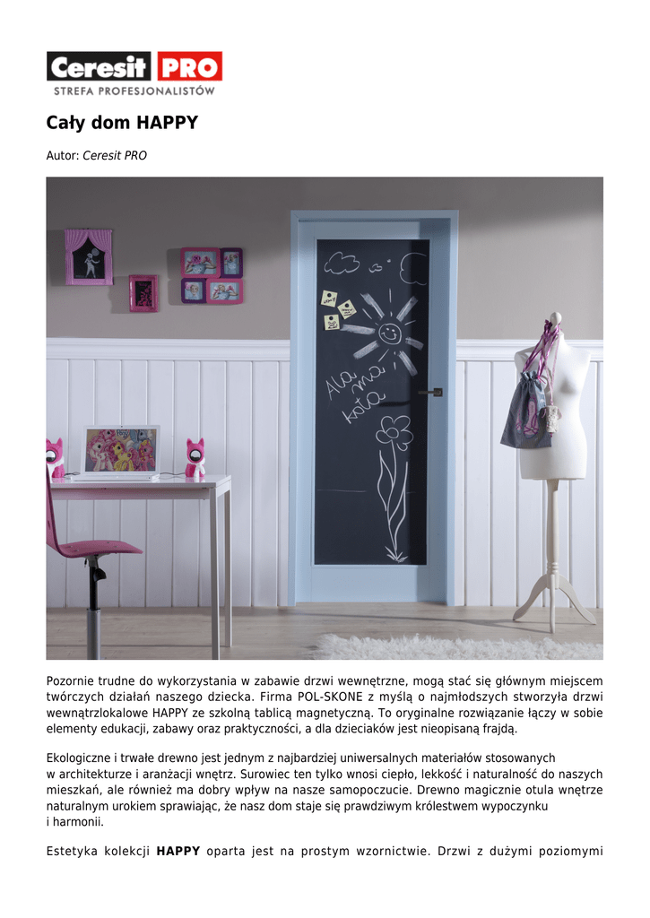 Cały dom HAPPY Autor: Ceresit PRO Pozornie trudne do wykorzystania w zabawie drzwi wewnętrzne, mogą stać się głównym miejscem twórczych działań naszego dziecka. Firma POL-SKONE z myślą o najmłodszych stworzyła drzwi wewnątrzlokalowe HAPPY ze szkolną tablicą magnetyczną. To oryginalne rozwiązanie łączy w sobie elementy edukacji, zabawy oraz praktyczności, a dla dzieciaków jest nieopisaną frajdą. Ekologiczne i trwałe drewno jest jednym z najbardziej uniwersalnych materiałów stosowanych w architekturze i aranżacji wnętrz. Surowiec ten tylko wnosi ciepło, lekkość i naturalność do naszych mieszkań, ale również ma dobry wpływ na nasze samopoczucie. Drewno magicznie otula wnętrze naturalnym urokiem sprawiając, że nasz dom staje się prawdziwym królestwem wypoczynku i harmonii. Estetyka kolekcji HAPPY oparta jest na prostym wzornictwie. Drzwi z dużymi poziomymi przeszkleniami to ukłon w stronę aranżacji pełnych światła, pasujących do pokoju dziennego czy sypialni. Najbardziej charakterystycznym modelem serii jest oryginalne skrzydło z tablicą magnetyczną. Wzór wykorzystywany jest najczęściej w pokojach maluchów, które na tablicy mogą wyrażać swoje artystyczne fantazje, a rodzice mogą zapomnieć o niechcianych rysunkach na ścianach czy meblach. Drzwi HAPPY z magnetyczną tablicą, doskonale sprawdzą się także w kuchni, gdzie mogą służyć jako notatnik przypominający o zakupach i z powodzeniem znajdą zastosowanie w lokalach użytkowych czy restauracjach, informując Klientów o aktualnych promocjach. POL-SKONE oferuje HAPPY w wersji jedno lub dwuskrzydłowej oraz w systemie przesuwnym. Dostosowania kolorystyki do wystroju wnętrza daje możliwość pomalowania drzwi ekologicznymi farbami akrylowymi w barwach palet RAL i NCS. W czasie otwierania i zamykania drzwi, między zawiasami, a skrzydłem działa duża siła. Dlatego warto zabezpieczyć krawędź skrzydła specjalną listwą Finprotect, która niweluje ryzyko przytrzaśnięcia paluszków. Więcej informacji o firmie na stronie:http://www.pol-skone.pl/ © 2013 Henkel Polska sp. z o.o.
