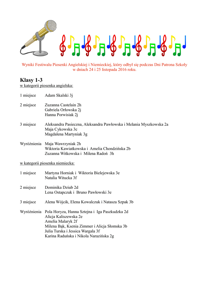 Wyniki Festiwalu Piosenki Angielskiej i Niemieckiej, który odbył się podczas Dni Patrona Szkoły w dniach 24 i 25 listopada 2016 roku. Klasy 1-3 w kategorii piosenka angielska: 1 miejsce Adam Skalski 3j 2 miejsce Zuzanna Castelain 2h Gabriela Orłowska 2j Hanna Porwisiak 2j 3 miejsce Aleksandra Pasieczna, Aleksandra Pawłowska i Melania Myszkowska 2a Maja Cykowska 3c Magdalena Martyniak 3g Wyróżnienia Maja Wawrzyniak 2h Wiktoria Kawiatkowska i Amelia Chondzińska 2b Zuzanna Witkowska i Milena Radoń 3h w kategorii piosenka niemiecka: 1 miejsce Martyna Horniak i Wiktoria Bielejewska 3e Natalia Witucka 3f 2 miejsce Dominika Dziub 2d Lena Ostapczuk i Bruno Pawłowski 3e 3 miejsce Alena Wójcik, Elena Kowalczuk i Natasza Szpak 3b Wyróżnienia Pola Horyza, Hanna Sztejna i Iga Paszkudzka 2d Alicja Kaliszewska 2e Amelia Malaryk 2f Milena Bąk, Ksenia Zimmer i Alicja Słomska 3b Julia Turska i Jessica Wargala 3f Karina Raduńska i Nikola Narazińska 2g Klasy 4-6 w kategorii piosenka angielska 1 miejsce Jakub Wójcik 4a 2 miejsce Jagoda Brożyna 5c 3 miejsce Patrycja Baranowska 6d 3 miejsce Maria Pawlikowska 6h wyróżnienia: Oliwia Kowalska 5a Dominika Maludy 5a Zespół z 5f: Julia Flasza, Klaudia Fedorczuk i Barbara Eckert w kategorii piosenka niemiecka 1 miejsce Andrzej Moroz 4d Julia Świetlicka 4e Hanna Ważna, Maria Polito i Dominika Moszczyńska 6c 2 miejsce Milena Musiał 5e 3 miejsce Kleopatra Kozakiewicz i Alicja Jutrzenka 4e Wyróżnienia Jagoda Adryańczyk 5g Amelia Uvalin, Amelia Kozłowska i Zofia Myszkowska 5e