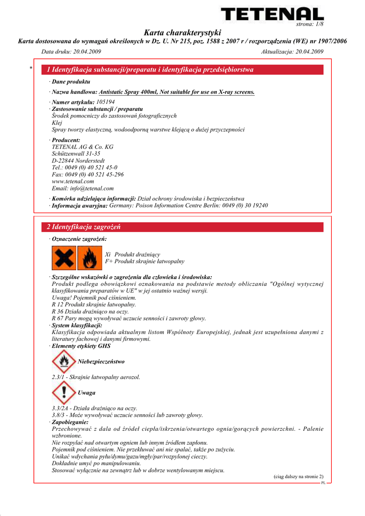 DR strona: 1/8 Karta charakterystyki Karta dostosowana do wymagań określonych w Dz. U. Nr 215, poz. 1588 z 2007 r / rozporządzenia (WE) nr 1907/2006 Data druku: 20.04.2009 * Aktualizacja: 20.04.2009 1 Identyfikacja substancji/preparatu i identyfikacja przedsiębiorstwa · Dane produktu · Nazwa handlowa: Antistatic Spray 400ml, Not suitable for use on X-ray screens. · Numer artykułu: 105194 · Zastosowanie substancji / preparatu Środek pomocniczy do zastosowań fotograficznych Klej Spray tworzy elastyczną, wodoodporną warstwe klejącą o duŜej przyczepności · Producent: TETENAL AG & Co. KG Schützenwall 31-35 D-22844 Norderstedt Tel.: 0049 (0) 40 521 45-0 Fax: 0049 (0) 40 521 45-296 www.tetenal.com Email: [email protected] · Komórka udzielająca informacji: Dział ochrony środowiska i bezpieczeństwa · Informacja awaryjna: Germany: Poison Information Centre Berlin: 0049 (0) 30 19240 2 Identyfikacja zagroŜeń · Oznaczenie zagroŜeń: Xi Produkt draŜniący F+ Produkt skrajnie łatwopalny · Szczególne wskazówki o zagroŜeniu dla człowieka i środowiska: Produkt podlega obowiązkowi oznakowania na podstawie metody obliczania "Ogólnej wytycznej klasyfikowania preparatów w UE" w jej ostatnio waŜnej wersji. Uwaga! Pojemnik pod ciśnieniem. R 12 Produkt skrajnie łatwopalny. R 36 Działa draŜniąco na oczy. R 67 Pary mogą wywoływać uczucie senności i zawroty głowy. · System klasyfikacji: Klasyfikacja odpowiada aktualnym listom Wspólnoty Europejskiej, jednak jest uzupełniona danymi z literatury fachowej i danymi firmowymi. · Elementy etykiety GHS Niebezpieczeństwo 2.3/1 - Skrajnie łatwopalny aerozol. Uwaga 3.3/2A - Działa draŜniąco na oczy. 3.8/3 - MoŜe wywoływać uczucie senności lub zawroty głowy. · Zapobieganie: Przechowywać z dala od źródeł ciepła/iskrzenia/otwartego ognia/gorących powierzchni. - Palenie wzbronione. Nie rozpylać nad otwartym ogniem lub innym źródłem zapłonu. Pojemnik pod ciśnieniem. Nie przekłuwać ani nie spalać, takŜe po zuŜyciu. Unikać wdychania pyłu/dymu/gazu/mgły/par/rozpylonej cieczy. Dokładnie umyć po manipulowaniu. Stosować wyłącznie na zewnątrz lub w dobrze wentylowanym miejscu. (ciąg dalszy na stronie 2) PL DR strona: 2/8 Karta charakterystyki Karta dostosowana do wymagań określonych w Dz. U. Nr 215, poz. 1588 z 2007 r / rozporządzenia (WE) nr 1907/2006 Data druku: 20.04.2009 Aktualizacja: 20.04.2009 Nazwa handlowa: Antistatic Spray 400ml, Not suitable for use on X-ray screens. (ciąg dalszy od strony 1) UŜywać rękawic ochronnych/odzieŜy ochronnej/ochrony oczu/ochrony twarzy. · Reagowanie: W PRZYPADKU DOSTANIA SIĘ DO DRÓG ODDECHOWYCH: Wyprowadzić na świeŜe powietrze i zapewnić warunki do odpoczynku w pozycji umoŜliwiającej swobodne oddychanie. W PRZYPADKU DOSTANIA SIĘ DO OCZU: OstroŜnie płukać wodą przez kilka minut. Wyjąć soczewki kontaktowe, jeŜeli są i moŜna je łatwo usunąć. Nadal płukać. W przypadku złego samopoczucia skontaktować się z OŚRODKIEM ZATRUĆ lub lekarzem. W przypadku utrzymywania się podraŜnienia oczu: Zasięgnąć porady/zgłosić się pod opiekę lekarza. · Przechowywanie: Przechowywać w dobrze wentylowanym miejscu. Przechowywać pojemnik szczelnie zamknięty. Przechowywać pod zamknięciem. Chronić przed światłem słonecznym. Nie poddawać temperaturze przekraczającej 50°C/ 122°F. · Usuwanie: Zawartość / pojemnik usuwać zgodnie z przepisami miejscowymi / regionalnymi / narodowymi / międzynarodowymi. 3 Skład/informacja o składnikach · Charakterystyka chemiczna · Opis: Peparat sporządzony z niŜej wymienionych substancji i substancji nie będących niebezpiecznymi. · Składniki niebezpieczne: 50-70% CAS: 67-63-0 propan-2-ol Xi, F; R 11-36-67 EINECS: 200-661-7 Niebezpieczeństwo: 2.6/2 Uwaga: 3.3/2A, 3.8/3 CAS: 106-97-8 butan F+; R 12 20-30% EINECS: 203-448-7 Niebezpieczeństwo: 2.2/1 Uwaga: 2.5/L CAS: 74-98-6 propan F+; R 12 1-10% EINECS: 200-827-9 Niebezpieczeństwo: 2.2/1 Uwaga: 2.5/L CAS: 75-28-5 izobutan F+; R 12 1-10% EINECS: 200-857-2 Niebezpieczeństwo: 2.2/1 Uwaga: 2.5/L · Wskazówki dodatkowe: Pełna treść przytoczonych zwrotów dotyczących zagroŜeń znajduje się w rozdziale 16. 4 Pierwsza pomoc · Po wdychaniu: Dostarczyć świeŜe powietrze, w razie dolegliwości wezwać lekarza. · Po styczności ze skórą: Natychmiast zmyć wodą. · Po styczności z okiem: Płukać oczy z otwartą powieką przez kilka minut pod bieŜącą wodą. W przypadku utrzymującej się dolegliwości zasięgnąć porady lekarza. · Po połknięciu: Przy trwałych dolegliwościach porozumieć się z lekarzem. · Wskazówki dla lekarza: · Mogą wystąpić następujące symptomy: Ból głowy Nudności * 5 Postępowanie w przypadku poŜaru · Przydatne środki gaśnicze: CO2, piasek, proszek gaśniczy. Nie stosować wody. (ciąg dalszy na stronie 3) PL DR strona: 3/8 Karta charakterystyki Karta dostosowana do wymagań określonych w Dz. U. Nr 215, poz. 1588 z 2007 r / rozporządzenia (WE) nr 1907/2006 Data druku: 20.04.2009 Aktualizacja: 20.04.2009 Nazwa handlowa: Antistatic Spray 400ml, Not suitable for use on X-ray screens. (ciąg dalszy od strony 2) · Środki gaśnicze nieprzydatne ze względów bezpieczeństwa: Woda pełnym strumieniem · Szczególne zagroŜenie ze strony materiału, produktów jego spalania lub powstających gazów: W niektórych warunkach poŜaru nie moŜna wykluczyć śladów innych substancji trujących. · Specjalne wyposaŜenie ochronne: Nie wdychać gazów powstających podczas eksplozji i poŜarów. 6 Postępowanie w przypadku niezamierzonego uwolnienia do środowiska · Środki ochrony osobistej: Nosić ubranie ochronne. Osoby nie zabezpieczone przenieść w bezpieczne miejsce. Źródła zapłonu trzymać w bezpiecznej odległości. Zadbać o skutecznie działającą wentylację. · Środki ochrony środowiska: W przypadku przedostania się do zbiorników wodnych lub kanalizacji zawiadomić właściwe w