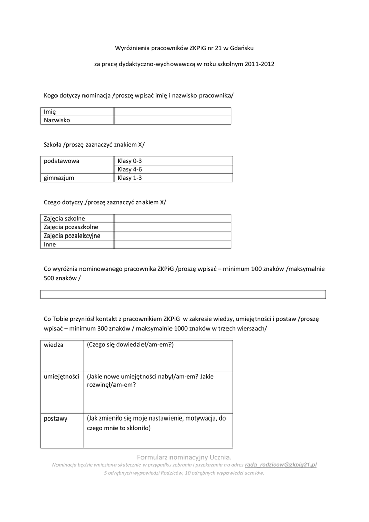 Wyróżnienia pracowników ZKPiG nr 21 w Gdańsku za pracę dydaktyczno-wychowawczą w roku szkolnym 2011-2012 Kogo dotyczy nominacja /proszę wpisać imię i nazwisko pracownika/ Imię Nazwisko Szkoła /proszę zaznaczyć znakiem X/ podstawowa Klasy 0-3 Klasy 4-6 Klasy 1-3 gimnazjum Czego dotyczy /proszę zaznaczyć znakiem X/ Zajęcia szkolne Zajęcia pozaszkolne Zajęcia pozalekcyjne Inne Co wyróżnia nominowanego pracownika ZKPiG /proszę wpisać – minimum 100 znaków /maksymalnie 500 znaków / Co Tobie przyniósł kontakt z pracownikiem ZKPiG w zakresie wiedzy, umiejętności i postaw /proszę wpisać – minimum 300 znaków / maksymalnie 1000 znaków w trzech wierszach/ wiedza (Czego się dowiedzieł/am-em?) umiejętności (Jakie nowe umiejętności nabył/am-em? Jakie rozwinęł/am-em? postawy (Jak zmieniło się moje nastawienie, motywacja, do czego mnie to skłoniło) Formularz nominacyjny Ucznia. Nominacja będzie wniesiona skutecznie w przypadku zebrania i przekazania na adres [email protected] 5 odrębnych wypowiedzi Rodziców, 10 odrębnych wypowiedzi uczniów. Kto dokonuje nominacji /proszę wpisać własne imię i nazwisko oraz klasę / Imię Nazwisko Klasa Nominacje dla pracownika ZKPiG należy złożyć w opisanej zamkniętej kopercie: do sekretariatu ZKPiG nr 21 w Gdańsku w terminie do 21 maja 2012 r.. Formularz nominacyjny Ucznia. Nominacja będzie wniesiona skutecznie w przypadku zebrania i przekazania na adres [email protected] 5 odrębnych wypowiedzi Rodziców, 10 odrębnych wypowiedzi uczniów.