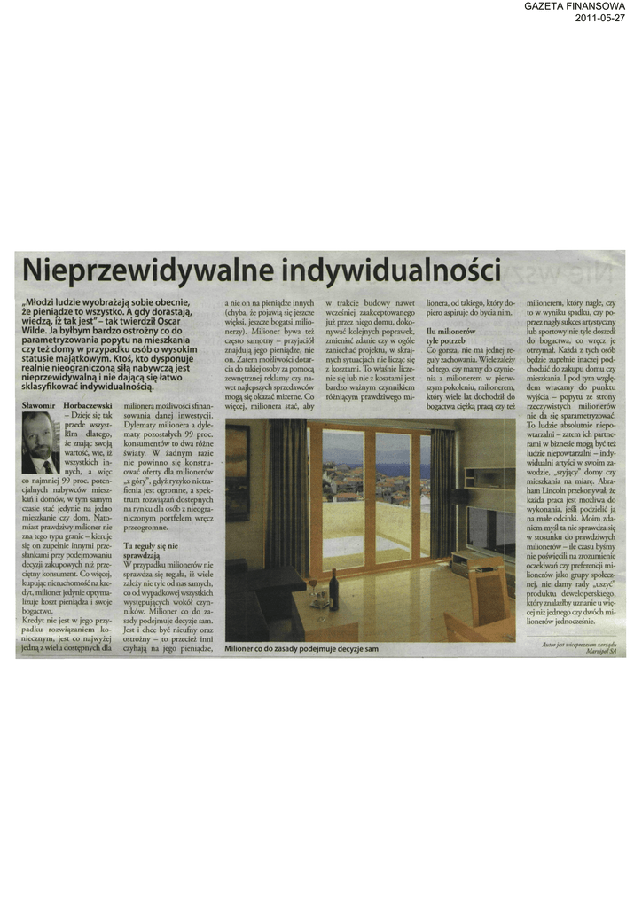 GAZETA FINANSOWA 2011-05-27 Nieprzewidywalne indywidualności „Młodzi ludzie wyobrażają sobie obecnie, że pieniądze to wszystko. A gdy dorastają, wiedzą, iż tak jest"-tak twierdził Oscar Wilde. Ja byłbym bardzo ostrożny co do parametryzowania popytu na mieszkania czy też domy w przypadku osób o wysokim statusie majątkowym. Ktoś, kto dysponuje realnie nieograniczoną siłą nabywczą jest nieprzewidywalną i nie dającą się łatwo sklasyfikować indywidualnością. Sławomir Horbaczewski - Dzieje się tak przede wszyst kim dlatego, że znając swoją wartość, wie, iż wszystkich in nych, a więc co najmniej 99 proc. poten cjalnych nabywców miesz kań i domów, w tym samym czasie stać jedynie na jedno mieszkanie czy dom. Nato miast prawdziwy milioner nie zna tego typu granic - kieruje się on zupełnie innymi prze słankami przy podejmowaniu decyzji zakupowych niż prze ciętny konsument. Co więcej, kupując nieruchomość na kre dyt, milioner jedynie optymali/Lijc koszt pieniądza i swoje bogactwo. Kredyt nie jest w jego przy padku rozwiązaniem ko niecznym, jest co najwyżej jedną z wielu dostępnych dla milionera możliwości sfinan sowania danej inwestycji. Dylematy milionera a dyle maty pozostałych 99 proc. konsumentów to dwa różne światy. W żadnym razie nie powinno się konstru ować oferty dla milionerów „z góry", gdyż ryzyko nietrafienia jest ogromne, a spek trum rozwiązań dostępnych na rynku dla osób z nieogra niczonym portfelem wręcz przeogromne. Tu reguły się nie sprawdzają W przypadku milionerów nie sprawdza się reguła, iż wiele zależy nie tyle od nas samych, co od wypadkowej wszystkich występujących wokół czyn ników. Milioner co do za sady podejmuje decyzje sam. Jest i chce być nieufny oraz ostrożny - to przecież inni czyhają na jego pieniądze, a nie on na pieniądze innych (chyba, że pojawią się jeszcze więksi, jeszcze bogatsi milio nerzy). Milioner bywa też często samotny - przyjaciół znajdują jego pieniądze, nie on. Zatem możliwości dotar cia do takiej osoby za pomocą zewnętrznej reklamy czy na wet najlepszych sprzedawców mogą się okazać mizerne. Co więcej, milionera stać, aby w trakcie budowy nawet wcześniej zaakceptowanego już przez niego domu, doko nywać kolejnych poprawek, zmieniać zdanie czy w ogóle zaniechać projektu, w skraj nych sytuacjach nie licząc się z kosztami. To właśnie licze nie się lub nie z kosztami jest bardzo ważnym czynnikiem różniącym prawdziwego mi Milioner co do zasady podejmuje decyzje sam lionera, od takiego, który do piero aspiruje do bycia nim. Ilu milionerów tyle potrzeb Co gorsza, nie ma jednej re guły zachowania. Wiele zależy od tego, czy mamy do czynie nia z milionerem w pierw szym pokoleniu, milionerem, który wiele lat dochodzi! do bogactwa ciężką pracą czy też milionerem, który nagle, czy to w wyniku spadku, czy po przez nagły sukces artystyczny lub sportowy nie tyle doszedł do bogactwa, co wręcz je otrzymał. Każda z tych osób będzie zupełnie inaczej pod chodzić do zakupu domu czy mieszkania. I pod tym wzglę dem wracamy do punktu wyjścia - popytu ze strony rzeczywistych milionerów nie da się sparametryzować. To ludzie absolutnie niepo wtarzalni - zatem ich partne rami w biznesie mogą być też ludzie niepowtarzalni - indy widualni artyści w swoim za wodzie, „szyjący" domy czy mieszkania na miarę. Abra ham Lincoln przekonywał, że każda praca jest możliwa do wykonania, jeśli podzielić ją na małe odcinki. Moim zda niem myśl ta nie sprawdza się w stosunku do prawdziwych milionerów - ile czasu byśmy nie poświęcili na zrozumienie oczekiwań czy preferencji mi lionerów jako grupy społecz nej, nie damy rady „uszyć" produktu deweloperskiego, który znalazłby uznanie u wię cej niż jednego czy dwóch mi lionerów jednocześnie. Autor jest wiceprezesem zarządu Marvipol SA