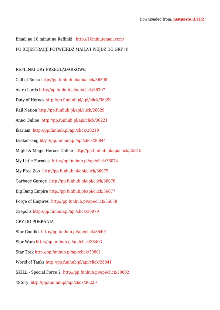 Downloaded from: justpaste.it/i1l2 Email na 10 minut na Reflinki : http://10minutemail.com/ PO REJESTRACJI POTWIERDŹ MAILA I WEJDŹ DO GRY !!! REFLINKI GRY PRZEGLĄDARKOWE Call of Roma http://pp.funhub.pl/api/click/36398 Astro Lords http://pp.funhub.pl/api/click/36397 Duty of Heroes http://pp.funhub.pl/api/click/36399 Rail Nation http://pp.funhub.pl/api/click/26829 Anno Online http://pp.funhub.pl/api/click/30221 Ikariam http://pp.funhub.pl/api/click/30219 Drakensang http://pp.funhub.pl/api/click/26844 Might & Magic Heroes Online http://pp.funhub.pl/api/click/25815 My Little Farmies http://pp.funhub.pl/api/click/36074 My Free Zoo http://pp.funhub.pl/api/click/36075 Garbage Garage http://pp.funhub.pl/api/click/36076 Big Bang Empire http://pp.funhub.pl/api/click/36077 Forge of Empires http://pp.funhub.pl/api/click/36078 Grepolis http://pp.funhub.pl/api/click/36079 GRY DO POBRANIA Star Conflict http://pp.funhub.pl/api/click/36401 Star Wars http://pp.funhub.pl/api/click/36403 Star Trek http://pp.funhub.pl/api/click/30801 World of Tanks http://pp.funhub.pl/api/click/26841 SKILL - Special Force 2 http://pp.funhub.pl/api/click/30802 4Story http://pp.funhub.pl/api/click/30220 War Thunder http://pp.funhub.pl/api/click/26842