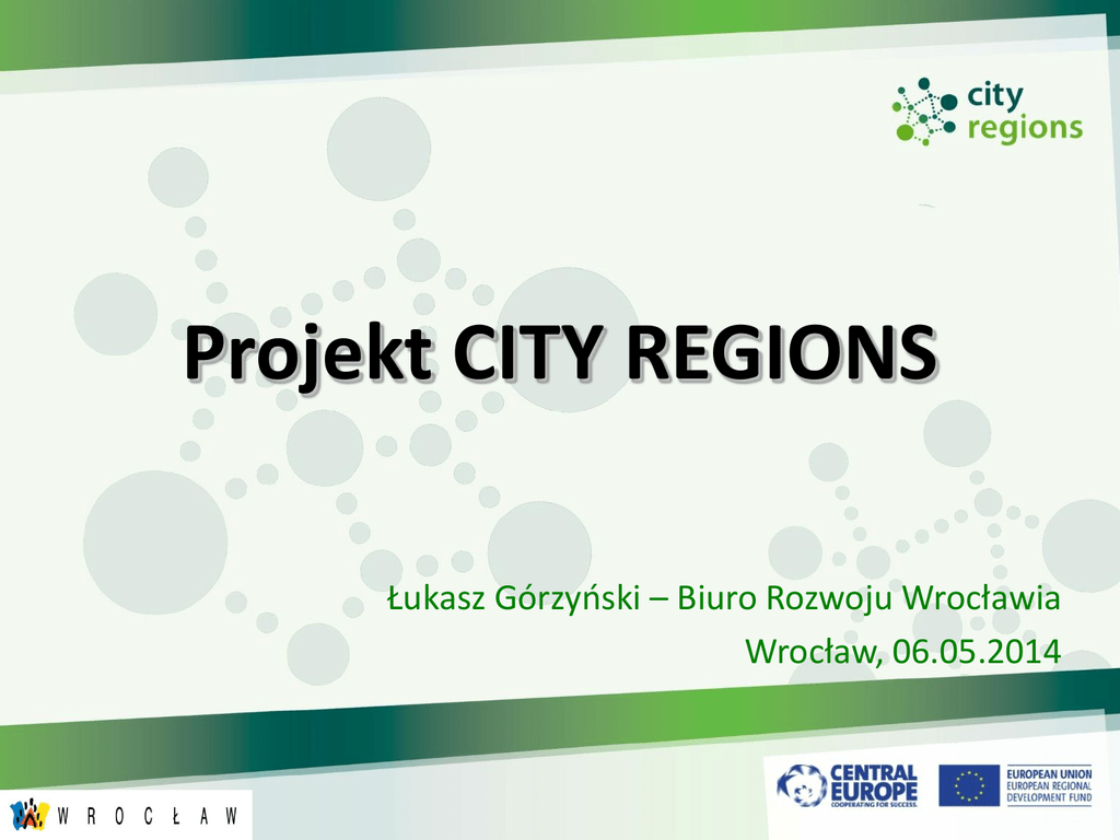 Projekt CITY REGIONS Łukasz Górzyński – Biuro Rozwoju Wrocławia Wrocław, 06.05.2014 Projekt CITY REGIONS Projekt realizowany jest w ramach Programu dla Europy Środkowej. Całkowity koszt projektu, którego realizacja rozpoczęła się w październiku 2012 roku, wynosi 1.600.420 € z czego, w przypadku partnerów polskich, 85% poniesionych kosztów zostanie zrefundowane przez Unię Europejską. Partnerstwo Partnerstwo składa się z partnerów reprezentujących 5 regionów metropolitalnych z Europy Środkowej, z 5 krajów. Każdy region reprezentowany jest przez parę: miasto (rdzeń obszaru) oraz region Partnerstwo 1) DE: Lipsk (partner wiodący) / Saksońskie Ministerstwo Spraw Wewnętrznych 2) CZ: Praga (9. Dystrykt) / RDA Central Bohemian Region 3) AT: Graz / Graz & Periphery Regional Management 4) PL: Wrocław / Instytut Rozwoju Terytorialnego (dawne Wojewódzkie Biuro Urbanistyczne) 5) IT: Turyn / Region Piemont Partnerstwo - mapa NIEMCY: Lipsk / Saksonia CZECHY: Praga / Region Centralny AUSTRIA: Graz / Region Graz POLSKA: Wrocław / Dolny Śląsk WŁOCHY: Turyn / Piemont Obszar badań – szerokie ujęcie Wrocław 8 powiatów 43 gminy Cele projektu GŁÓWNY: Poprawa i instytucjonalizacja trwałej funkcjonalnej współpracy pomiędzy miastami oraz mniejszymi jednostkami administracyjnymi w ramach obszarów funkcjonalnych (obszarów miejskich) W szczególności związane jest to ze: • wzmocnieniem konkurencyjności regionów miejskich, • promocją atrakcyjności regionów, • utrzymaniem odpowiedniej jakości środowiska naturalnego, • koordynacją rozwoju obszarów zurbanizowanych. Działania Międzynarodowa współpraca w ramach projektu polega: • na przeanalizowaniu przykładów dobrych praktyk, • realizacji działań pilotażowych w zakresie różnych, odpowiednio zdefiniowanych wspólnych obszarów zainteresowań, • intensywnej wymianie doświadczeń pomiędzy partnerami projektu. Działania we Wrocławskim Obszarze Metropolitalnym Wrocław i Województwo Dolnośląskie w ramach projektu CITY REGIONS planują skoncentrować się na następujących zagadnieniach: 1. Zintegrowany system terenów zielonych i otwartych Wrocławia i Obszaru Metropolitalnego Wrocławia. 2. System transportu publicznego w Obszarze Metropolitalnym Wrocławia. 3. Usługi społeczne w Obszarze Metropolitalnym Wrocławia. Działania pilotażowe IRT • 28 kwietnia 2014 r. odbyła się konferencja pt. „Poprawa warunków zamieszkania w Aglomeracji Wrocławskiej – możliwości współpracy i wdrożenia systemu Park and Ride oraz kształtowania systemu terenów otwartych i zielonych” Udział Wrocławia Budżet całego projektu wynosi 1.600.420 €. Koszt udziału Wrocławia w projekcie wynosi 101.120 € z czego 85% poniesionych kosztów zostanie zrefundowane przez Unię Europejską. Projekt rozpoczął się w październiku 2012 r. a zakończy w grudniu 2014 r. Dziękuję za uwagę! Łukasz Górzyński – Biuro Rozwoju Wrocławia tel.: 71-777-8661, [email protected]