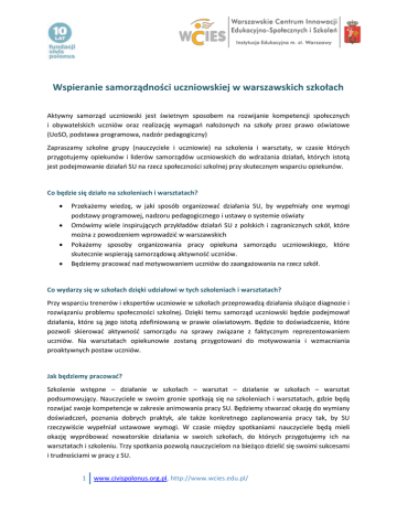 Wspieranie samorządności uczniowskiej w warszawskich szkołach Aktywny samorząd uczniowski jest świetnym sposobem na rozwijanie kompetencji społecznych i obywatelskich uczniów oraz realizację wymagań nałożonych na szkoły przez prawo oświatowe (UoSO, podstawa programowa, nadzór pedagogiczny) Zapraszamy szkolne grupy (nauczyciele i uczniowie) na szkolenia i warsztaty, w czasie których przygotujemy opiekunów i liderów samorządów uczniowskich do wdrażania działań, których istotą jest podejmowanie działań SU na rzecz społeczności szkolnej przy skutecznym wsparciu opiekunów. Co będzie się działo na szkoleniach i warsztatach? Przekażemy wiedzę, w jaki sposób organizować działania SU, by wypełniały one wymogi podstawy programowej, nadzoru pedagogicznego i ustawy o systemie oświaty Omówimy wiele inspirujących przykładów działań SU z polskich i zagranicznych szkół, które można z powodzeniem wprowadzić w warszawskich Pokażemy sposoby organizowania pracy opiekuna samorządu uczniowskiego, które skutecznie wspierają samorządową aktywność uczniów. Będziemy pracować nad motywowaniem uczniów do zaangażowania na rzecz szkół. Co wydarzy się w szkołach dzięki udziałowi w tych szkoleniach i warsztatach? Przy wsparciu trenerów i ekspertów uczniowie w szkołach przeprowadzą działania służące diagnozie i rozwiązaniu problemu społeczności szkolnej. Dzięki temu samorząd uczniowski będzie podejmował działania, które są jego istotą zdefiniowaną w prawie oświatowym. Będzie to doświadczenie, które pozwoli skierować aktywność samorządu na sprawy związane z faktycznym reprezentowaniem uczniów. Na warsztatach opiekunowie zostaną przygotowani do motywowania i wzmacniania proaktywnych postaw uczniów. Jak będziemy pracować? Szkolenie wstępne – działanie w szkołach – warsztat – działanie w szkołach – warsztat podsumowujący. Nauczyciele w swoim gronie spotkają się na szkoleniach i warsztatach, gdzie będą rozwijać swoje kompetencje w zakresie animowania pracy SU. Będziemy stwarzać okazję do wymiany doświadczeń, poznania dobrych praktyk, ale także konkretnego zaplanowania pracy tak, by SU rzeczywiście wypełniał ustawowe wymogi. W czasie między spotkaniami nauczyciele będą mieli okazję wypróbować nowatorskie działania w swoich szkołach, do których przygotujemy ich na warsztatach i szkoleniu. Trzy spotkania pozwolą nauczycielom na bieżąco dzielić się swoimi sukcesami i trudnościami w pracy z SU. 1 www.civispolonus.org.pl, http://www.wcies.edu.pl/ Uczniowie poznają zakres działań SU oraz zostaną przygotowani do wdrożenia w swoich szkołach działań, które faktycznie mają charakter reprezentowania innych uczniów, takie jak diagnozowanie problemów, projektowanie ich rozwiązań oraz wdrażanie. Kto poprowadzi szkolenia i warsztaty? Szkolenia prowadzą stali współpracownicy fundacji Civis Polonus, zaangażowani między innymi w tworzenie rządowego projektu „Szkoła Współpracy. Uczniowie i rodzice kapitałem społecznym nowoczesnej szkoły”. Są autorami poradników dotyczących SU: www.szkolawspolpracy.pl, www.samorzaduczniowski.org.pl Harmonogram realizacji działań projektu: Termin szkolenia Termin warsztatu Termin warsztatu podsumowującego 1 grupa dla nauczycieli (szkoły podstawowe i gimnazja) 25-26.IX.2015 30.X.15 15.I.16 (9.00-16.00) (9.00-16.00) (9.00-16.00) 1 grupa dla uczniów (szkoły podstawowe i gimnazja) 25-26.IX.2015 30.X.15 15.I.16 (9.00-16.00) (9.00-16.00) (9.00-16.00) 16-17.X.15 4.XII.2015 29.I.16 (9.00-16.00) (9.00-16.00) (9.00-16.00) 16-17.X.15 4.XII.2015 29.I.16 (9.00-16.00) (9.00-16.00) (9.00-16.00) 23-24.X.15 11.XII.15 19.II.16 (9.00-16.00) (9.00-16.00) (9.00-16.00) 23-24.X.15 11.XII.15 19.II.16 (9.00-16.00) (9.00-16.00) (9.00-16.00) 6-7.XI.15 22.I.16 26.II.16 (9.00-16.00) (9.00-16.00) (9.00-16.00) 2 grupa dla nauczycieli (szkoły podstawowe i gimnazja) 2 grupa dla uczniów (szkoły podstawowe i gimnazja) 3 grupa dla nauczycieli (szkoły ponadgimnazjalne) 3 grupa dla uczniów (gimnazja i szkoły ponadgimnazjalne) 4 grupa dla uczniów (szkoły ponadgimnazjalne) 2 www.civispolonus.org.pl, http://www.wcies.edu.pl/ Więcej informacji o tym co będzie się działo! Szkolenie wstępne. Zakres treści podany poniżej jest wspólny dla nauczycieli i uczniów. Zostaną dobrane różne metody oraz różnie rozłożone akcenty. Wszystkie treści zgodne są z najnowszymi zaleceniami MEN opracowywanymi w ramach projektu „Szkoła Współpracy. Uczniowie i rodzice kapitałem społecznym nowoczesnej szkoły”. Zakres tematyczny szkolenia: 1. Podstawowe uprawnienia samorządów uczniowskich 2. Organizacja pracy SU Wybory reprezentacji SU Jak wybrać opiekuna samorządu? Jak zorganizować wybory do samorządu klasowego, szkolnego? Jak opracować regulamin pracy samorządu? W jak sposób wybrać problemy, które Samorząd Uczniowski chce rozwiązać w danym roku? Jak opracować plan pracy SU? Kalendarz działań Samorządu Uczniowskiego – przykład 3. Uczniowie uczestniczą w podejmowaniu decyzji dotyczących szkoły Samorząd Uczniowski spotyka się z dyrekcją, Radą Pedagogiczną i Radą Rodziców – szczegółowy opis jak się przygotować, jak się zachowywać, z czym do kogo się zwracać, jakie są kompetencje Rady Pedagogiczne i Rady Rodziców i Samorządu Uczniowskiego Samorząd Uczniowski informuje o sprawach szkoły – metody i treści informowania Samorząd Uczniowski organizuje konsultacje Samorząd Uczniowski organizuje debatę – szczegółowy opis techniczny, tematy Rozwiązywanie problemów szkolnych – jak generować rozwiązania - debata, wybór rozwiązania, wprowadzanie go w życie, monitorowanie, podsumowanie działania. O czym może decydować samorząd szkolny O czym i jak mogą współdecydował samorządy klasowe? Wszystkie procesy decyzyjne rozstrzygane na poziomie klasy – opis, metody. 4. Organizacja przestrzeni wewnątrz budynk