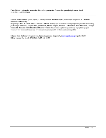 Piotr Bakal - piosenka autorska, literacka, poetycka, francuska, poezja śpiewana, bard 22.01.2011 - AUGUSTÓW Koncert Piotra Bakala (gitara, śpiew) z towarzyszeniem Rafała Grząki (akordeon) w programie pt. "Bulwar Piosenki Francuskiej". Program pt. "BULWAR PIOSENKI FRANCUSKIEJ" złożony jest z utworów sławnych postaci piosenki francuskiej, jak Georges Brassens, Jacques Brel, Joe Dassin, Michel Fugain, Maxime Le Forestier, Yves Montand, Georges Moustaki, Renaud, Michel Sardou i Charles Trenet. Przypomina najsławniejsze utwory najwybitniejszych wykonawców piosenki francuskiej w wersjach oryginalnych lub w tłumaczeniach na polski. Miejski Dom Kultury w Augustowie, Rynek Zygmunta Augusta 9, (www.apk.home.pl ) godz. 18:00 Bilety w cenie 10,- zł. tel: 87-643 36 59, 87-643 12 33 strona 1 / 1