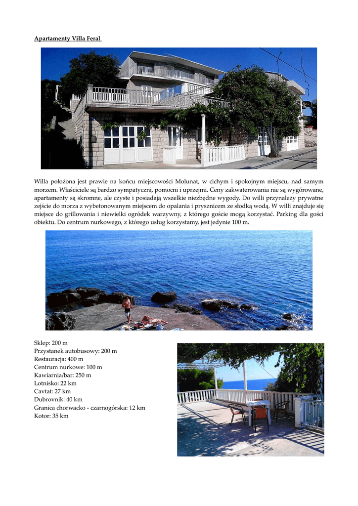 Apartamenty Villa Feral Willa położona jest prawie na końcu miejscowości Molunat, w cichym i spokojnym miejscu, nad samym morzem. Właściciele są bardzo sympatyczni, pomocni i uprzejmi. Ceny zakwaterowania nie są wygórowane, apartamenty są skromne, ale czyste i posiadają wszelkie niezbędne wygody. Do willi przynależy prywatne zejście do morza z wybetonowanym miejscem do opalania i prysznicem ze słodką wodą. W willi znajduje się miejsce do grillowania i niewielki ogródek warzywny, z którego goście mogą korzystać. Parking dla gości obiektu. Do centrum nurkowego, z którego usług korzystamy, jest jedynie 100 m. Sklep: 200 m Przystanek autobusowy: 200 m Restauracja: 400 m Centrum nurkowe: 100 m Kawiarnia/bar: 250 m Lotnisko: 22 km Cavtat: 27 km Dubrovnik: 40 km Granica chorwacko - czarnogórska: 12 km Kotor: 35 km Apartament 1 – cena 70,00 EUR/dzień Powierzchnia: 25 m² Liczba osób: 2+1 Kuchnia: tak Łazienka z WC: tak Internet: WiFi gratis Klimatyzacja: tak Taras/balkon ze stołem i krzesłami. Apartament 2 – cena 70,00 EUR/dzień Powierzchnia: 25 m² Liczba osób: 2+1 Kuchnia: tak Łazienka z WC: tak Internet: WiFi gratis Klimatyzacja: tak Taras/balkon ze stołem i krzesłami Apartament 3 – cena 75,00 EUR/dzień Powierzchnia: 45 m² Liczba osób: 2+1 Kuchnia: tak Łazienka z WC: tak Internet: WiFi gratis Klimatyzacja: tak Taras/balkon ze stołem i krzesłami Apartament 4 – cena 75,00 EUR/dzień Powierzchnia: 45 m² Liczba osób: 2+2 Kuchnia: tak Łazienka z WC: tak Internet: WiFi gratis Klimatyzacja: tak Taras/balkon ze stołem i krzesłami Apartament 5 – cena 75,00 EUR/dzień Powierzchnia: 45 m² Liczba osób: 2+2 Kuchnia: tak Łazienka z WC: tak Internet: WiFi gratis Klimatyzacja: tak Taras/balkon ze stołem i krzesłami Apartament 6 – cena 75,00 EUR/dzień Powierzchnia: 35 m² Liczba osób: 2+1 Kuchnia: tak Łazienka z WC: tak Internet: WiFi gratis Klimatyzacja: tak Taras/balkon ze stołem i krzesłami