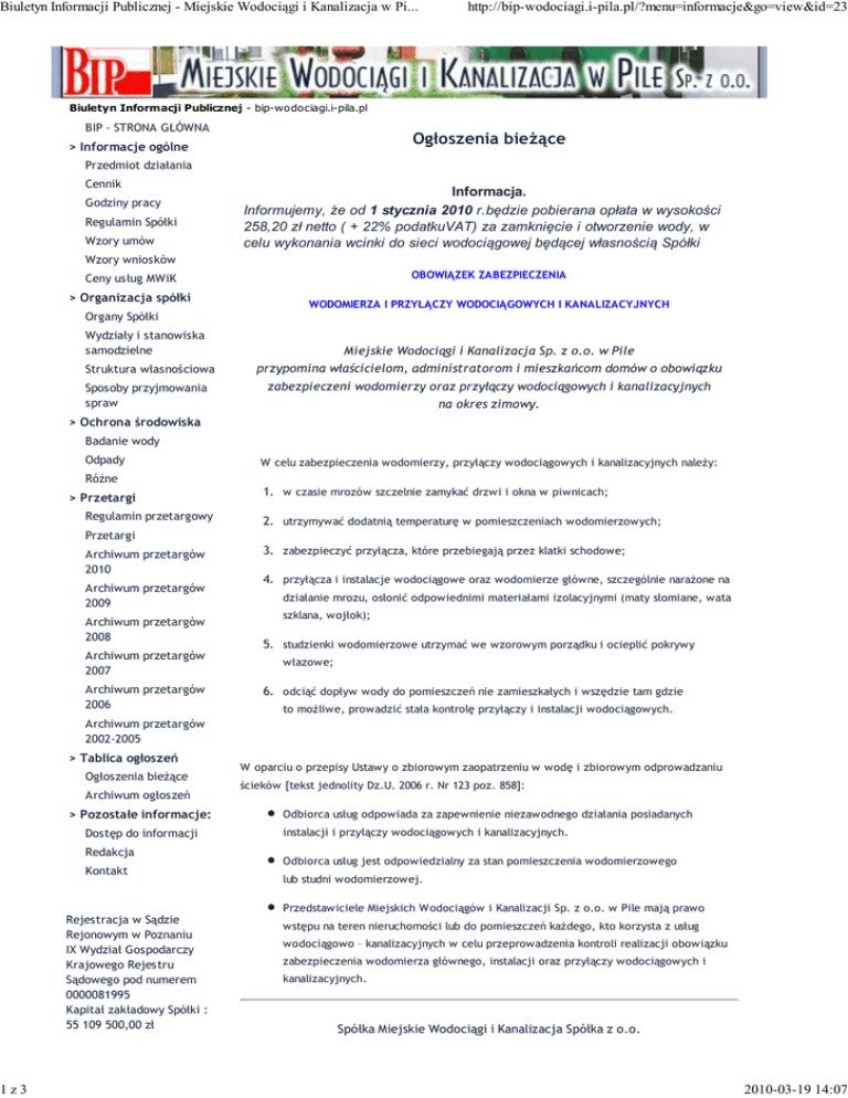 Biuletyn Informacji Publicznej - Miejskie Wodociągi i Kanalizacja w Pi... 1z3 http://bip-wodociagi.i-pila.pl/?menu=informacje&go=view&id=23 Biuletyn Informacji Publicznej - bip-wodociagi.i-pila.pl BIP - STRONA GŁÓWNA Ogłoszenia bieżące > Informacje ogólne Przedmiot działania Cennik Godziny pracy Regulamin Spółki Wzory umów Informacja. Informujemy, że od 1 stycznia 2010 r.będzie pobierana opłata w wysokości 258,20 zł netto ( + 22% podatkuVAT) za zamknięcie i otworzenie wody, w celu wykonania wcinki do sieci wodociągowej będącej własnością Spółki Wzory wniosków OBOWIĄZEK ZABEZPIECZENIA Ceny usług MWiK > Organizacja spółki WODOMIERZA I PRZYŁĄCZY WODOCIĄGOWYCH I KANALIZACYJNYCH Organy Spółki Wydziały i stanowiska samodzielne Struktura własnościowa Sposoby przyjmowania spraw Miejskie Wodociągi i Kanalizacja Sp. z o.o. w Pile przypomina właścicielom, administratorom i mieszkańcom domów o obowiązku zabezpieczeni wodomierzy oraz przyłączy wodociągowych i kanalizacyjnych na okres zimowy. > Ochrona środowiska Badanie wody Odpady W celu zabezpieczenia wodomierzy, przyłączy wodociągowych i kanalizacyjnych należy: Różne > Przetargi Regulamin przetargowy 1. w czasie mrozów szczelnie zamykać drzwi i okna w piwnicach; 2. utrzymywać dodatnią temperaturę w pomieszczeniach wodomierzowych; Przetargi Archiwum przetargów 2010 Archiwum przetargów 2009 Archiwum przetargów 2008 Archiwum przetargów 2007 Archiwum przetargów 2006 3. zabezpieczyć przyłącza, które przebiegają przez klatki schodowe; 4. przyłącza i instalacje wodociągowe oraz wodomierze główne, szczególnie narażone na działanie mrozu, osłonić odpowiednimi materiałami izolacyjnymi (maty słomiane, wata szklana, wojłok); 5. studzienki wodomierzowe utrzymać we wzorowym porządku i ocieplić pokrywy włazowe; 6. odciąć dopływ wody do pomieszczeń nie zamieszkałych i wszędzie tam gdzie to możliwe, prowadzić stała kontrolę przyłączy i instalacji wodociągowych. Archiwum przetargów 2002-2005 > Tablica ogłoszeń Ogłoszenia bieżące Archiwum ogłoszeń > Pozostałe informacje: Dostęp do informacji Redakcja Kontakt W oparciu o przepisy Ustawy o zbiorowym zaopatrzeniu w wodę i zbiorowym odprowadzaniu ścieków [tekst jednolity Dz.U. 2006 r. Nr 123 poz. 858]: Odbiorca usług odpowiada za zapewnienie niezawodnego działania posiadanych instalacji i przyłączy wodociągowych i kanalizacyjnych. Odbiorca usług jest odpowiedzialny za stan pomieszczenia wodomierzowego lub studni wodomierzowej. Przedstawiciele Miejskich Wodociągów i Kanalizacji Sp. z o.o. w Pile mają prawo Rejestracja w Sądzie Rejonowym w Poznaniu IX Wydział Gospodarczy Krajowego Rejestru Sądowego pod numerem 0000081995 Kapitał zakładowy Spółki : 55 109 500,00 zł wstępu na teren nieruchomości lub do pomieszczeń każdego, kto korzysta z usług wodociągowo – kanalizacyjnych w celu przeprowadzenia kontroli realizacji obowiązku zabezpieczenia wodomierza głównego, instalacji oraz przyłączy wodociągowych i kanalizacyjnych. Spółka Miejskie Wodociągi i Kanalizacja Spółka z o.o. 2010-03-19 14:07 Biuletyn Informacji Publicznej - Miejskie Wodociągi i Kanalizacja w Pi... 2z3 http://bip-wodociagi.i-pila.pl/?menu=informacje&go=view&id=23 z siedzibą: 64-920 Piła, ul. Chopina 2 oferuje do dzierżawy stację kontenerowo-przewoźną, typ STP 20 - 250kVA, napięcie 15/0,4kV Załącznik: Umowa dzierżawy Informacji w sprawie dzierżawy udziela p. Arkadiusz Kurowski, tel. (067)211-91-52 Stację można oglądać w MWiK, Piła ul. Chopina 2 (magazyn) w godzinach 1000-1200 Spółka Miejskie Wodociągi i Kanalizacja Spółka z o.o. z siedzibą: 64-920 Piła, ul. Chopina 2 ogłasza do sprzedania: Agregaty i pompy nieużywane: 1. Agregat głębinowy GC 4.03.1.1. 26kW szt: Ceny netto: 1 sprzedane 2. Agregat głębinowy GC 3.08.2.1 1 sprzedane 3. Agregat głębinowy GC 5.06.25 22kW 1 sprzedane 4. Agregat głębinowy GC 5.06.25 22kW 1 sprzedane 5. Pompa 80 PJM 230 2 1934,00zł/szt Agregaty po naprawie: szt: Ceny netto: 6. Agregat głębinowy G80 VIo B 2 200,00zł/szt 7. Agregat głębinowy G80 VIIo B 2 300,00zł/szt 8. Agregat głębinowy G80 Vo B 1 200,00zł Informacji w sprawie sprzedaży pomp udziela p. Barbara Różańska tel. (067) 211-91-23. Pompy można oglądać w MWiK Piła ul. Chopina 2 (magazyn) w godz. 10:00 - 12.00. Miejskie Wodociągi i Kanalizacja Spółka z o.o. w Pile na terenie nieruchomości położonej w Pile przy ul. Chopina 16 posiada do wynajęcia wolne pomieszczenie magazynowe w budynku po stacji uzdatniania wody. Opis obiektu: Powierzchnia użytkowa: 150,00m2, wysokość minimalna 4,00m, wysokość maksymalna 4,60m. Budynek murowany z cegły w dobrym stanie technicznym, dach po remoncie, posadzki betonowe. Obiekt jest ogrodzony, wyposażony w instalację wodociągowokanalizacyjną i elektryczną oraz c.o. Dostęp do hali bezpośrednio z ul. Chopina z poziomu "0". Dodatkowych informacji udzielają pracownicy Działu Technicznego pod numerem telefonu 067 2119153 od poniedziałku do piątku w godzinach 700 - 1500 2010-03-19 14:07 Biuletyn Informacji Publicznej - Miejskie Wodociągi i Kanalizacja w Pi... 3z3 http://bip-wodociagi.i-pila.pl/?menu=informacje&go=view&id=23 Osoba odpowiedzialna za dodanie informacji: Arkadiusz Chromiński. Informację aktualizowano: 2009-12-28 06:41:42. Informację przeglądano: 19431 razy. Rejestr zmian Szukaj... Mapa serwisu Pomoc - jak korzystać z BIP? wodociagi.pila.pl BIP - strona główna ^ do góry 2010-03-19 14:07
