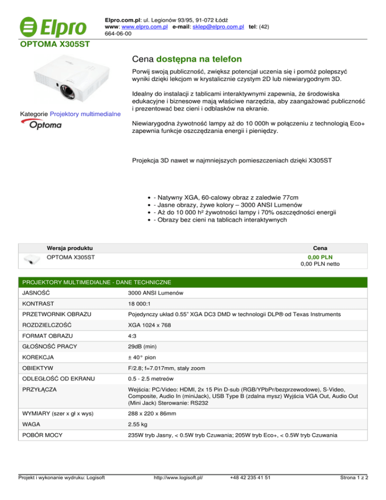 Elpro.com.pl: ul. Legionów 93/95, 91-072 Łódź www: www.elpro.com.pl e-mail: [email protected] tel: (42) 664-06-00 OPTOMA X305ST Cena dostępna na telefon Porwij swoją publiczność, zwiększ potencjał uczenia się i pomóż polepszyć wyniki dzięki lekcjom w krystalicznie czystym 2D lub niewiarygodnym 3D. Kategorie Projektory multimedialne Idealny do instalacji z tablicami interaktywnymi zapewnia, że środowiska edukacyjne i biznesowe mają właściwe narzędzia, aby zaangażować publiczność i prezentować bez cieni i odblasków na ekranie. Niewiarygodna żywotność lampy aż do 10 000h w połączeniu z technologią Eco+ zapewnia funkcje oszczędzania energii i pieniędzy. Projekcja 3D nawet w najmniejszych pomieszczeniach dzięki X305ST - Natywny XGA, 60-calowy obraz z zaledwie 77cm - Jasne obrazy, żywe kolory – 3000 ANSI Lumenów - Aż do 10 000 h² żywotności lampy i 70% oszczędności energii - Obrazy bez cieni na tablicach interaktywnych Wersja produktu Cena OPTOMA X305ST 0,00 PLN 0,00 PLN netto PROJEKTORY MULTIMEDIALNE - DANE TECHNICZNE JASNOŚĆ 3000 ANSI Lumenów KONTRAST 18 000:1 PRZETWORNIK OBRAZU Pojedynczy układ 0.55” XGA DC3 DMD w technologii DLP® od Texas Instruments ROZDZIELCZOŚĆ XGA 1024 x 768 FORMAT OBRAZU 4:3 GŁOŚNOŚĆ PRACY 29dB (min) KOREKCJA ± 40° pion OBIEKTYW F/2.8; f=7.017mm, stały zoom ODLEGŁOŚĆ OD EKRANU 0.5 - 2.5 metreów PRZYŁĄCZA Wejścia: PC/Video: HDMI, 2x 15 Pin D-sub (RGB/YPbPr/bezprzewodowe), S-Video, Composite, Audio In (miniJack), USB Type B (zdalna mysz) Wyjścia VGA Out, Audio Out (Mini Jack) Sterowanie: RS232 WYMIARY (szer x gł x wys) 288 x 220 x 86mm WAGA 2.55 kg POBÓR MOCY 235W tryb Jasny, < 0.5W tryb Czuwania; 205W tryb Eco+, < 0.5W tryb Czuwania Projekt i wykonanie wydruku: Logisoft http://www.logisoft.pl/ +48 42 235 41 51 Strona 1 z 2 ZASILANIE 100-240V, 50-60Hz ZOOM stały TECHNOLOGIA DLP 1-chip TYP OPTYKI Short-throw WSPÓŁCZYNNIK PROJEKCJI 0.626:1 OPCJE DODATKOWE Uchwyt ścienny - OWM855W, Oglądanie 3D Wymaga migawkowych okularów Optoma DLP-Link - sprzedawane oddzielnie. GŁOŚNIK 2W UKOMPLETOWANIE Osłona obiektywu, kabel zasilający, kabel VGA, pilot z bateriami, Podręcznik Szybki Start, Instrukcja Obsługi na CD, karta gwarancyjna ROZMIAR OBRAZU 1.00 – 5.00m (39.34” – 196.71”) przekątna 4:3 Galeria Projekt i wykonanie wydruku: Logisoft Powered by TCPDF (www.tcpdf.org) http://www.logisoft.pl/ +48 42 235 41 51 Strona 2 z 2